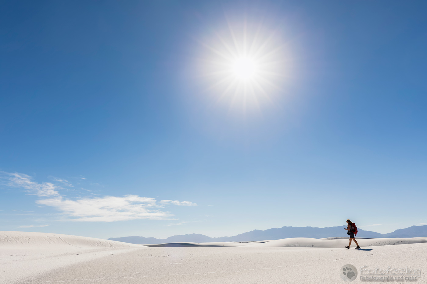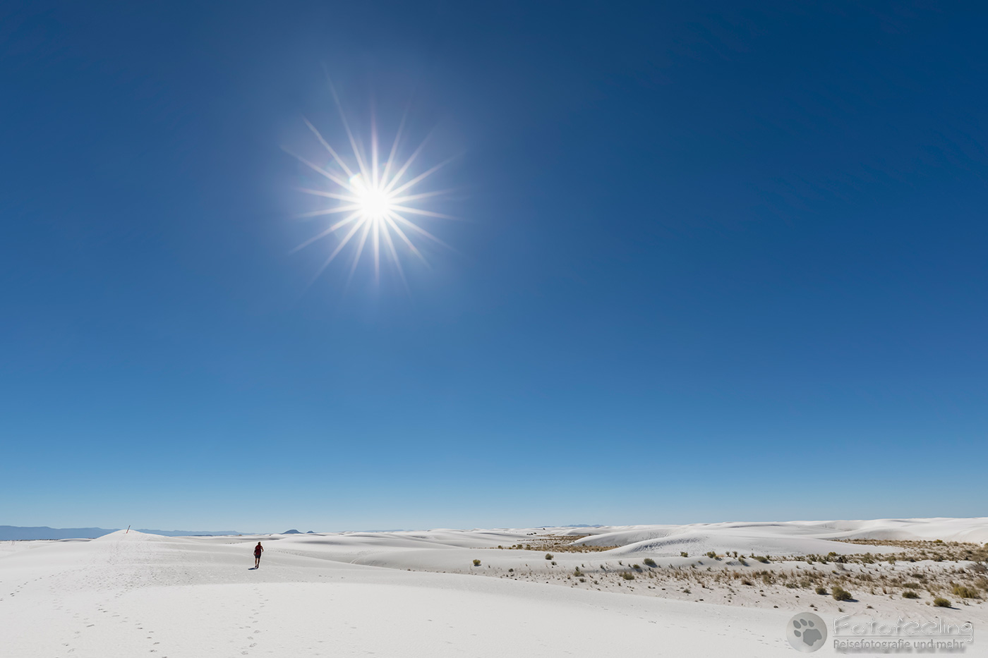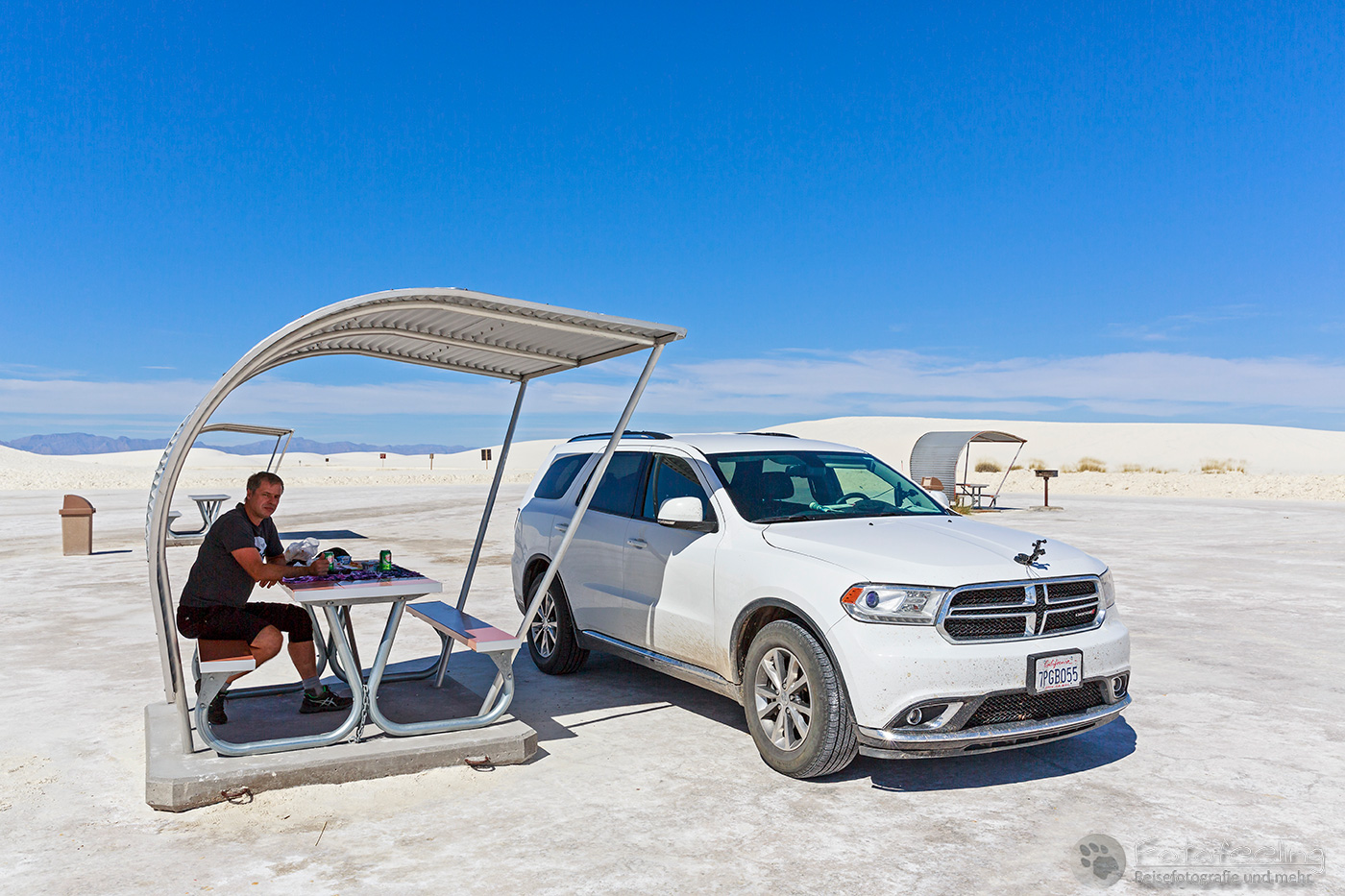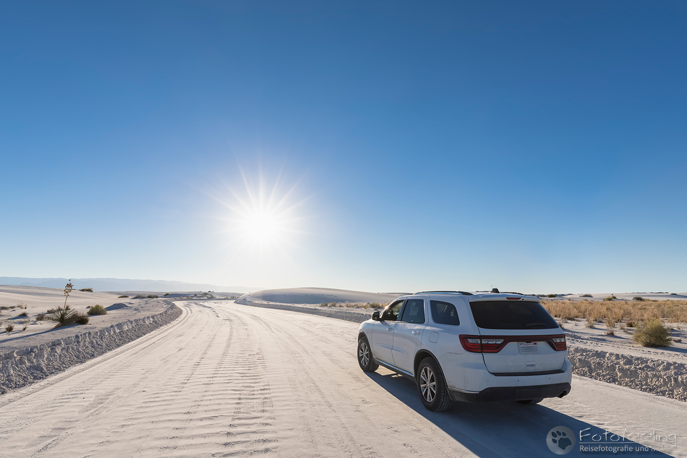Vor 9.00 Uhr morgens waren wir im White Sands National Monument am nördlichen Ende der Chihuahua-Wüste. Diese Wüste liegt im Tularosa-Becken im südlichen Teil eines 712 km² großen Gipsfeldes auf dem sich schneeweiße Gipsdünen gebildet haben. Sie wird von den San Andres Mountains und Sacramento Mountains umrandet. Diese traumhaft schöne Wüste stand schon lange auf unserer Wunschliste und diesmal verwirklichten wir uns den Traum und schauten sie uns mit eigenen Augen an.