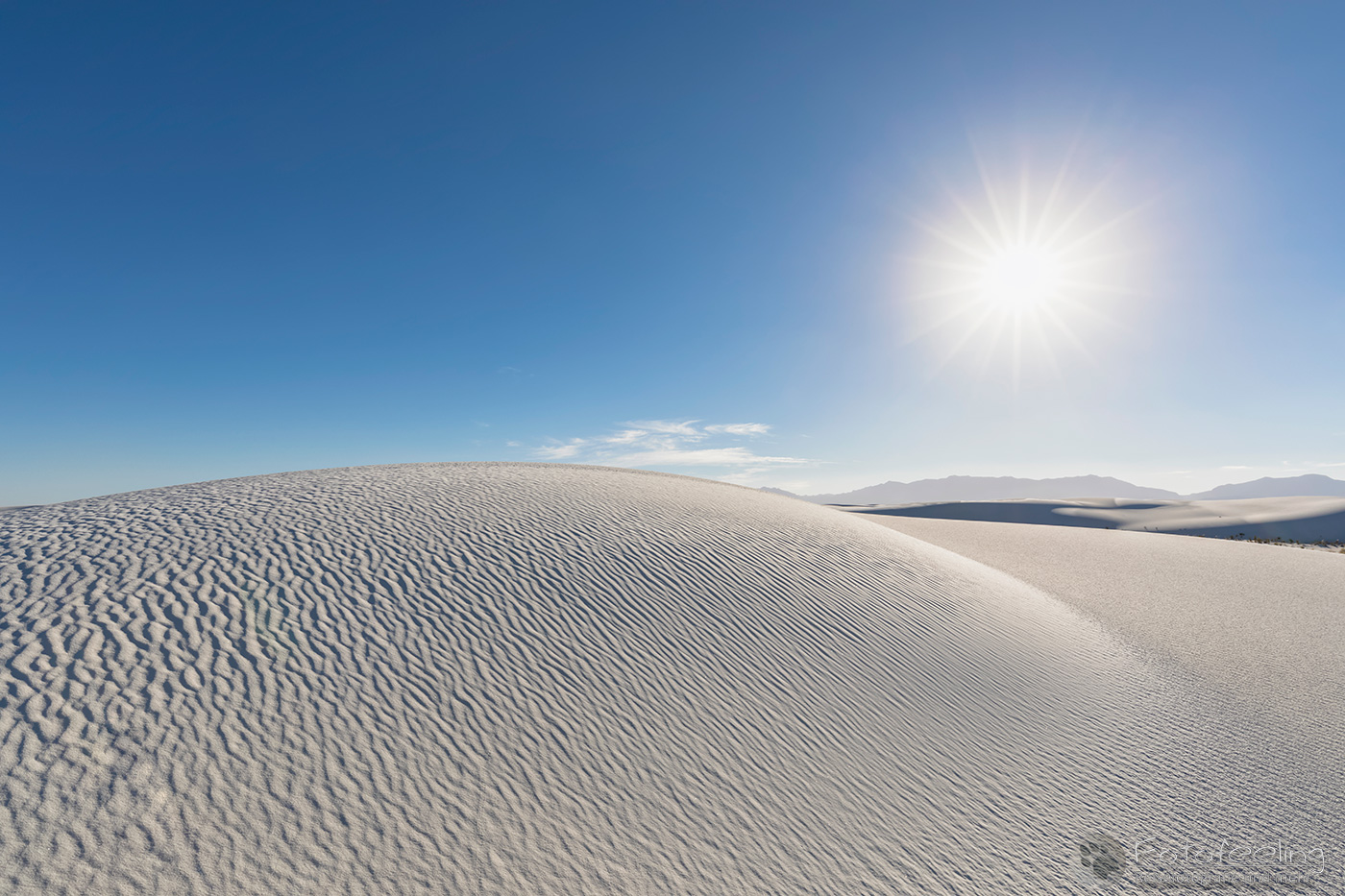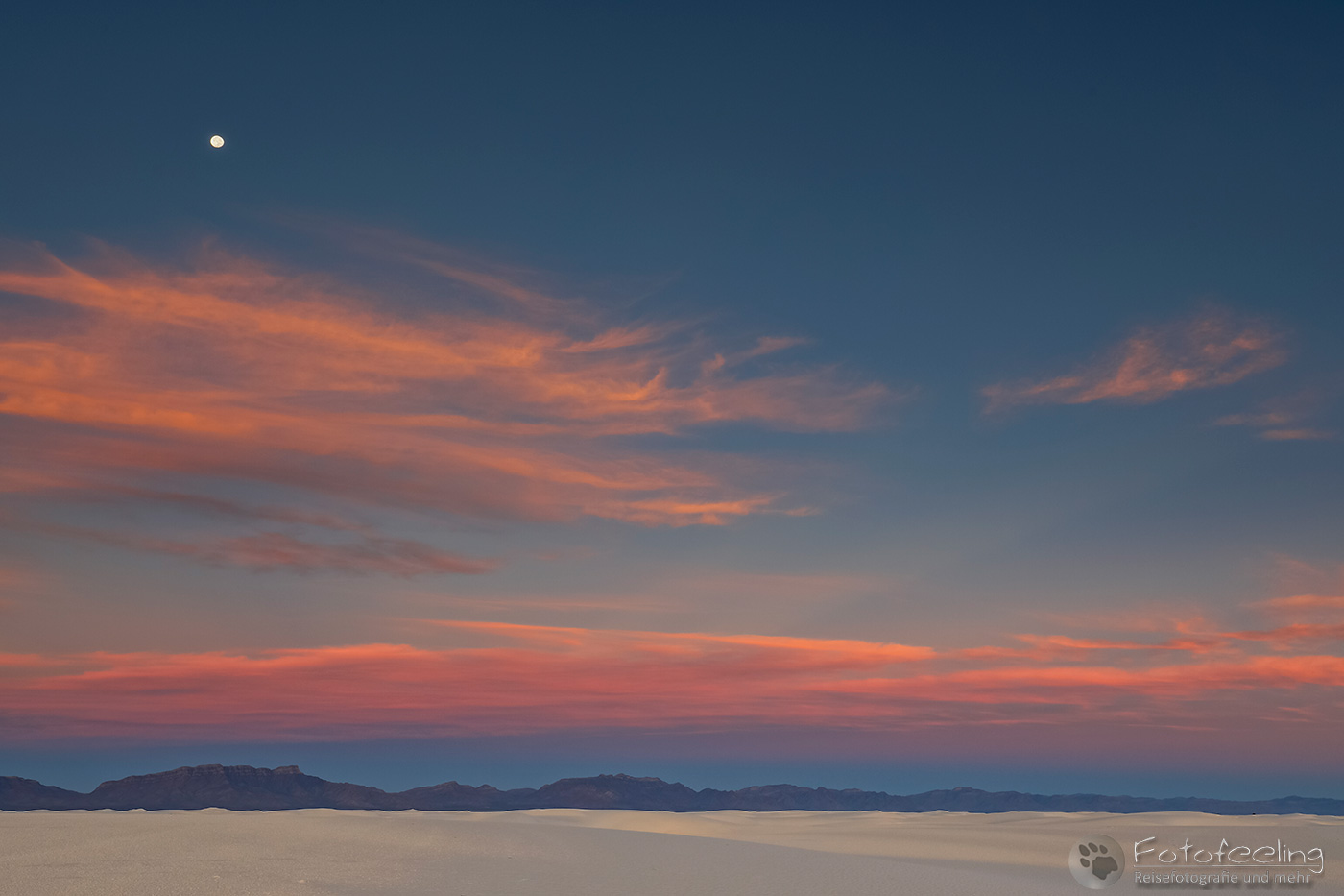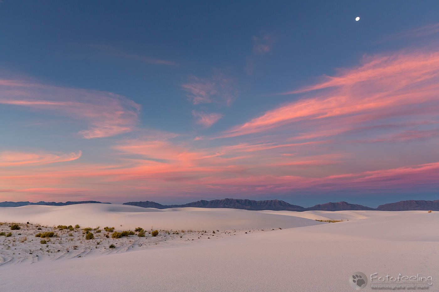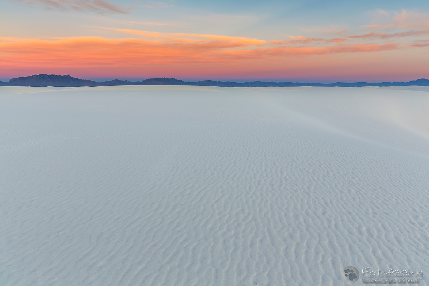 Vor 9.00 Uhr morgens waren wir im White Sands National Monument am nördlichen Ende der Chihuahua-Wüste. Diese Wüste liegt im Tularosa-Becken im südlichen Teil eines 712 km² großen Gipsfeldes auf dem sich schneeweiße Gipsdünen gebildet haben. Sie wird von den San Andres Mountains und Sacramento Mountains umrandet. Diese traumhaft schöne Wüste stand schon lange auf unserer Wunschliste und diesmal verwirklichten wir uns den Traum und schauten sie uns mit eigenen Augen an.