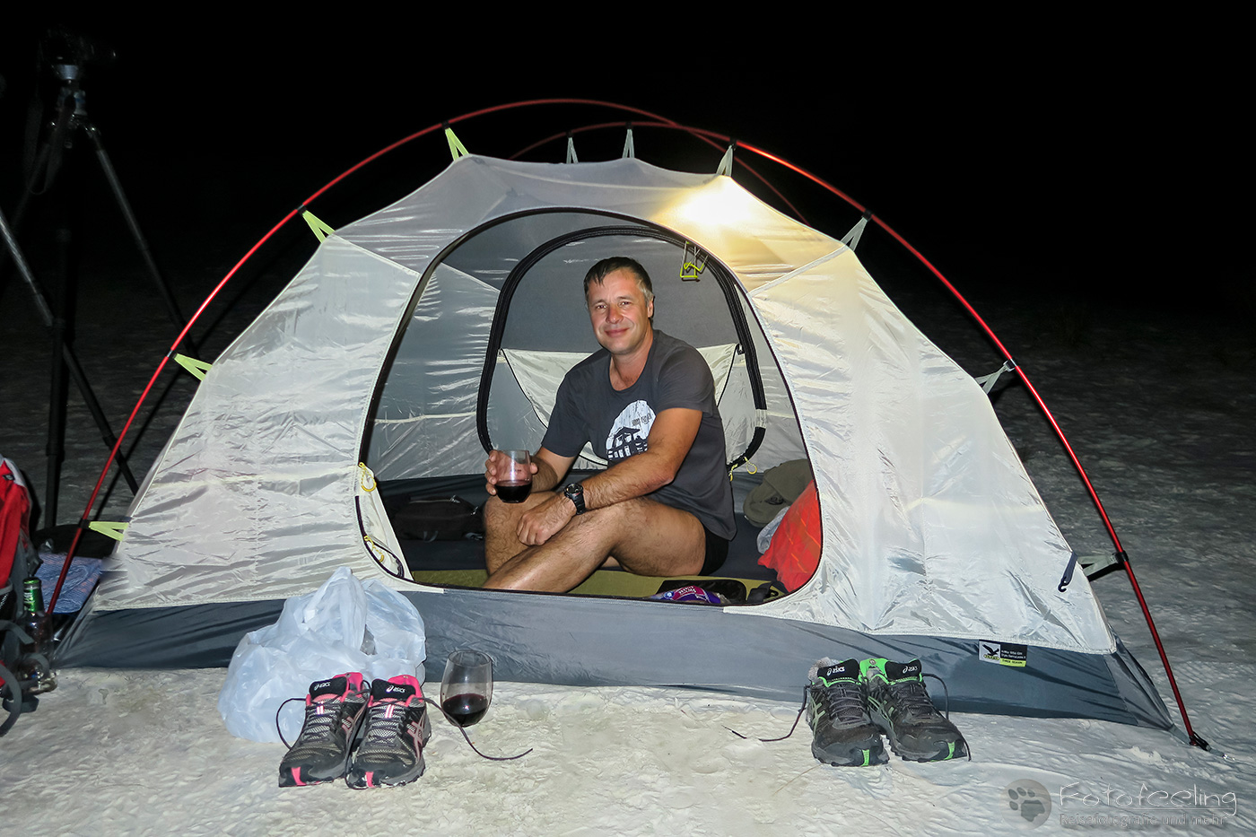 Zurück am Zelt gab es zwei Semmeln mit Frischkäse und Honigschinken. Dazu ließen wir und leckeren Schweizer Käse schmecken und genossen ein Glas Rotwein. Noch immer waren die weißen Dünen zu erkennen im Lichtermeer der tausend Sterne, die hoch über uns den Himmel erhellten.