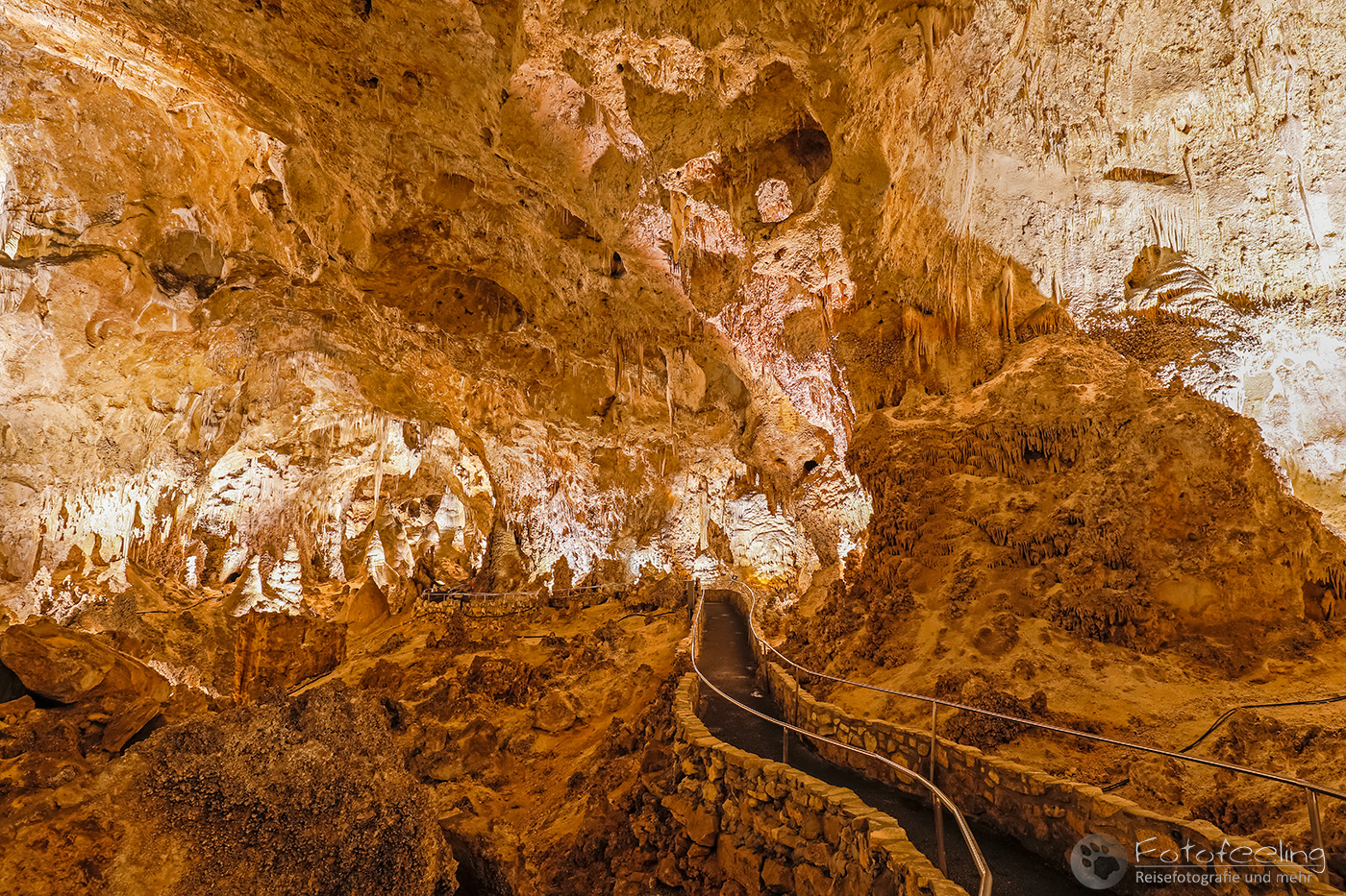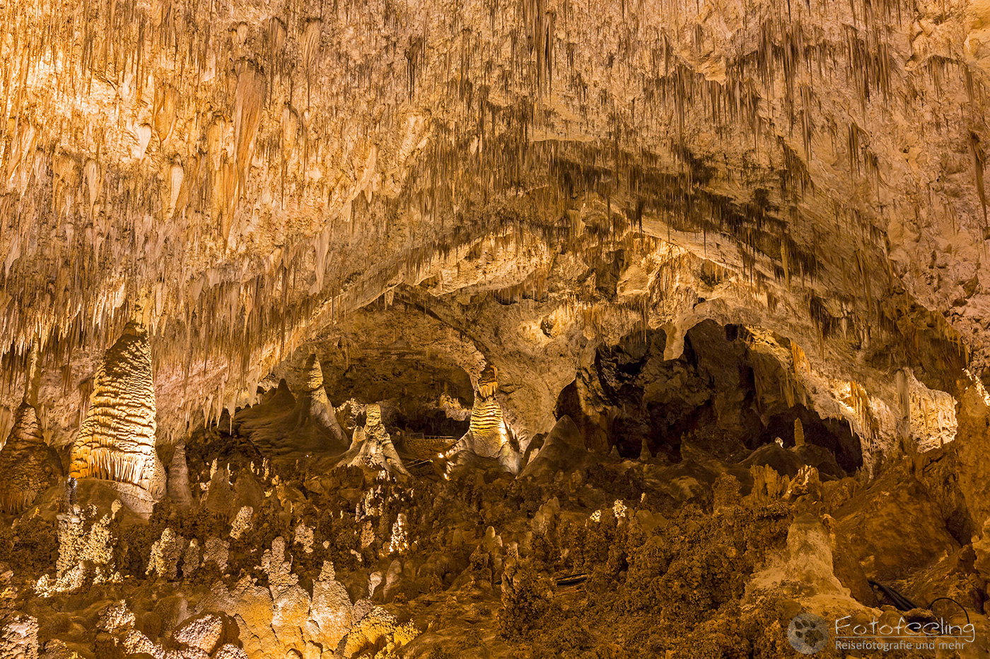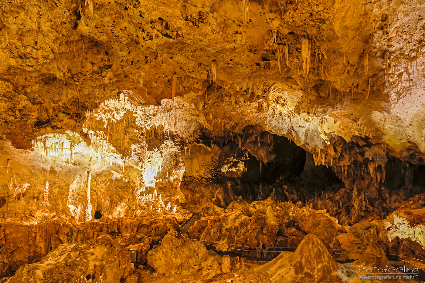 Zu dieser frühen Stunde entschieden wir uns für den natürlichen Eingang, zu dem wir einem Weg hinter dem Visitor Center folgten. Vor dem Eingang wurden wir noch einmal von einem Ranger kontrolliert und auf Gefahren hingewiesen. Dann konnte es losgehen und wir standen in dem Amphitheater, das uns zu einer gewaltigen Höhle brachte. Hier kann man zu bestimmten Jahreszeiten rund eine Million Mexikanische Bulldoggfledermäusen (Tadarida brasiliensis) beobachten, wenn sie zum Sonnenuntergang in einem riesigen Schwarm die Höhle verlassen. Ein Serpentinenweg brachte uns immer tiefer unter die Erde und in die Höhle hinein und schon hier waren wir so fasziniert, dass wir kaum vorwärts kamen. Eine wunderschöne unterirdische Kalksteinwelt zog uns in ihren Bann. Stalaktiten hingen von der Decke und ihre Gegenstücke, die Stalagmiten wuchsen vom Boden aus in die Höhe. Dazu lösen herabfallende Regentropfen auf ihrem Weg Kalk aus den Felsen. Wenn er in der Höhle der Luft ausgesetzt ist, verdunstet das Wasser und der Kalk bleibt zurück. So wird ständig Kalk gelöst und wieder abgegeben, woraus sich die bizarrsten und wunderschönsten Formationen bilden. Mitten durch diese Welt, die Chris stark an Jules Vernes „Reise zum Mittelpunkt der Erde“ erinnerte und mich an „Alien“, ging ein geteerter Weg, von dem aus wir die Bizarre Welt bestaunen konnten. Viele der Gebilde wurden von Scheinwerfern beleuchtet, denn nur so kam ihre Schönheit voll zur Geltung. Ab und zu klatschte ein Tropfen auf uns und so machte die Höhle ihrem Namen alle Ehre.