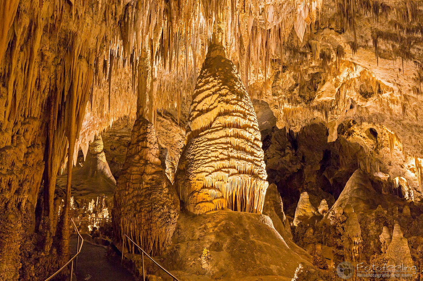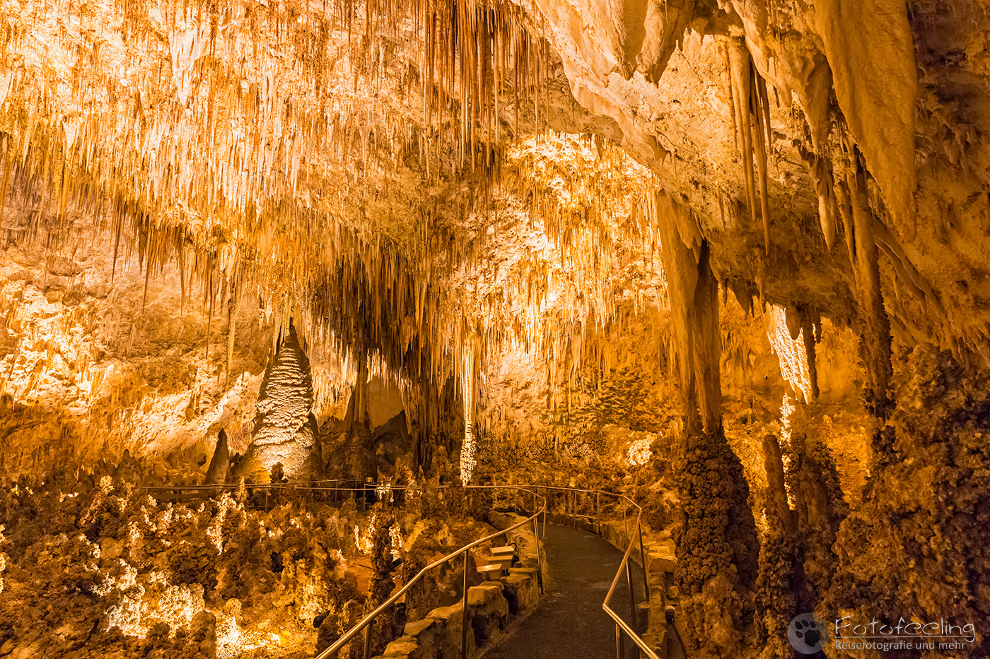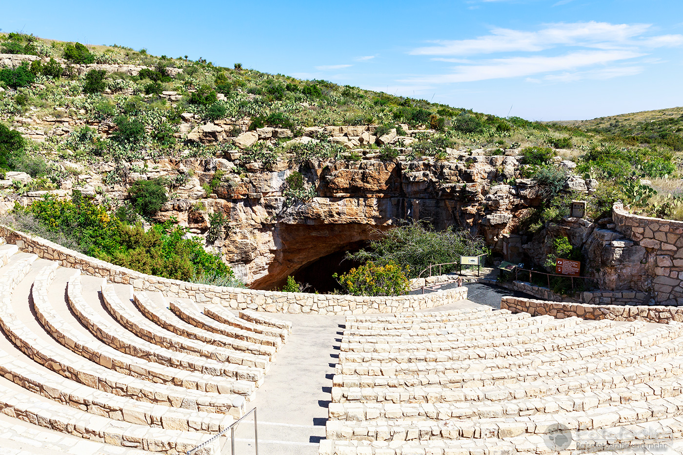 Zu dieser frühen Stunde entschieden wir uns für den natürlichen Eingang, zu dem wir einem Weg hinter dem Visitor Center folgten. Vor dem Eingang wurden wir noch einmal von einem Ranger kontrolliert und auf Gefahren hingewiesen. Dann konnte es losgehen und wir standen in dem Amphitheater, das uns zu einer gewaltigen Höhle brachte. Hier kann man zu bestimmten Jahreszeiten rund eine Million Mexikanische Bulldoggfledermäusen (Tadarida brasiliensis) beobachten, wenn sie zum Sonnenuntergang in einem riesigen Schwarm die Höhle verlassen. Ein Serpentinenweg brachte uns immer tiefer unter die Erde und in die Höhle hinein und schon hier waren wir so fasziniert, dass wir kaum vorwärts kamen. Eine wunderschöne unterirdische Kalksteinwelt zog uns in ihren Bann. Stalaktiten hingen von der Decke und ihre Gegenstücke, die Stalagmiten wuchsen vom Boden aus in die Höhe. Dazu lösen herabfallende Regentropfen auf ihrem Weg Kalk aus den Felsen. Wenn er in der Höhle der Luft ausgesetzt ist, verdunstet das Wasser und der Kalk bleibt zurück. So wird ständig Kalk gelöst und wieder abgegeben, woraus sich die bizarrsten und wunderschönsten Formationen bilden. Mitten durch diese Welt, die Chris stark an Jules Vernes „Reise zum Mittelpunkt der Erde“ erinnerte und mich an „Alien“, ging ein geteerter Weg, von dem aus wir die Bizarre Welt bestaunen konnten. Viele der Gebilde wurden von Scheinwerfern beleuchtet, denn nur so kam ihre Schönheit voll zur Geltung. Ab und zu klatschte ein Tropfen auf uns und so machte die Höhle ihrem Namen alle Ehre.