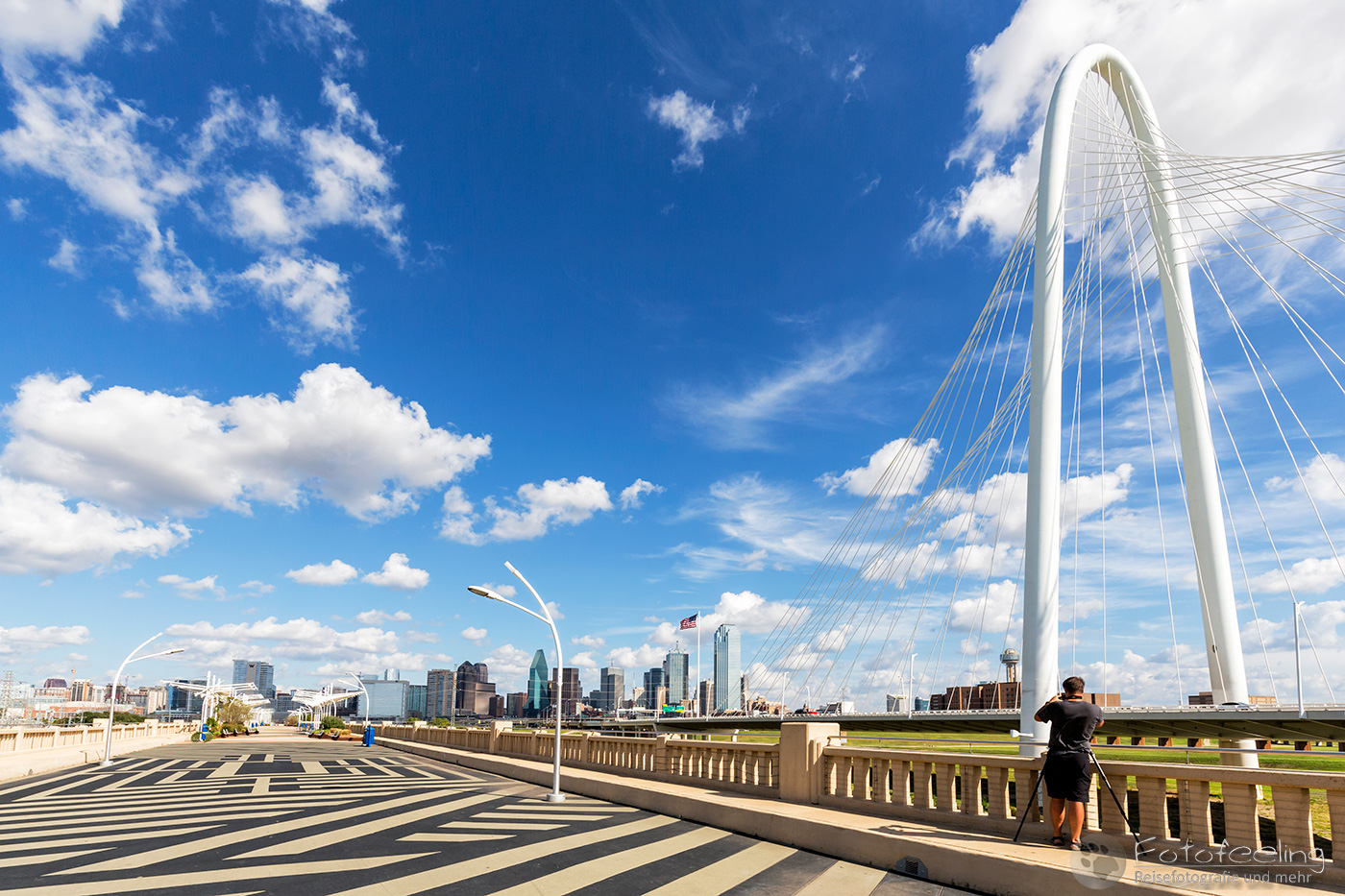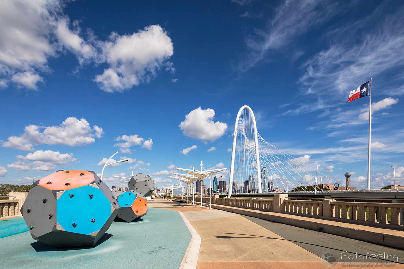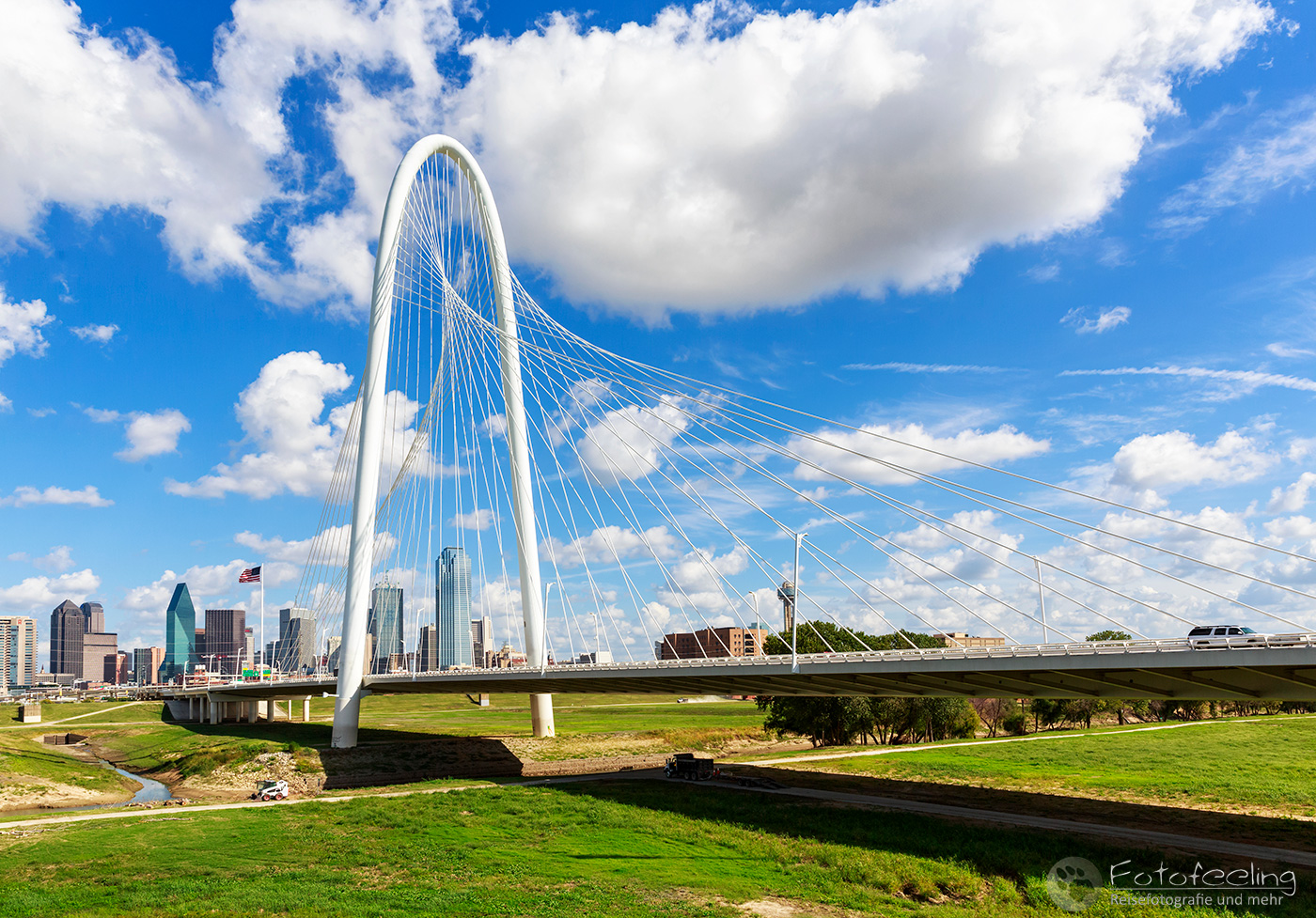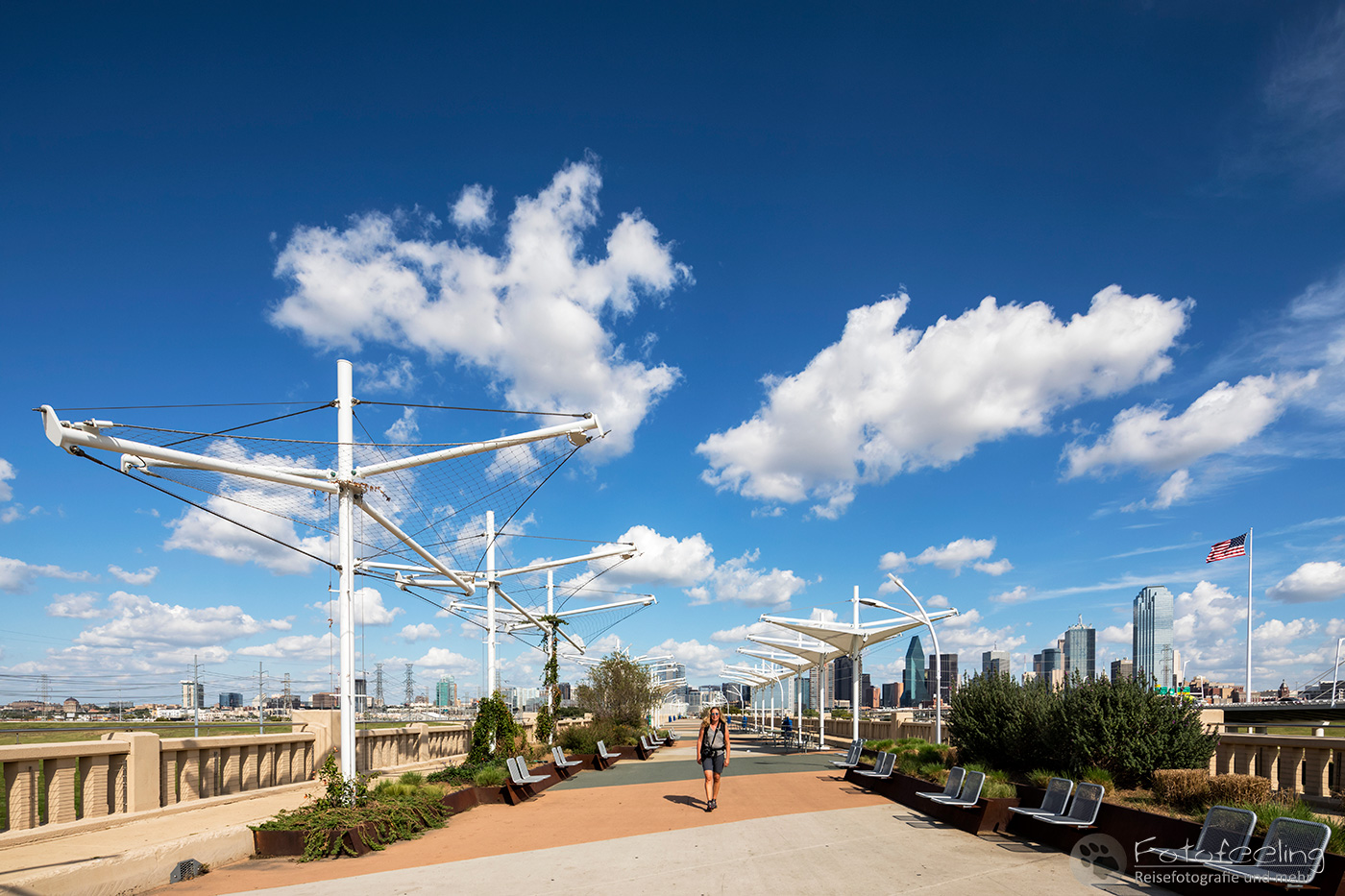 Um 14.00 Uhr erreichten wir Dallas, die drittgrößte Stadt Texas. Wir kämpften uns durch ein Gewirr aus mehrspurigen Autobahnen, Brücken und Baustellen bis Chris die Trinity Fußgängerbrücke erreicht hatte. Das Wetter war perfekt für einen kurzen Fotostopp, denn dicke Wolken hingen auf einem stahlblauen Himmel, zwischen denen die Sonne hervor lachte. Es war angenehm warm. Wir fanden gleich die richtige Zufahrt zur Brücke, wo wir das Auto kostenlos parken konnten. Wir schnappten unsere Kameras und gingen auf die Brücke, von der aus man einen tollen Blick auf die Skyline der Stadt hat. Es machte Spaß über die Brücke zu gehen und auf die mächtigen Wolkenkratzer zu schauen, aber auch die Margaret Hunt Hill Bridge, die gegenüber der Fußgängerbrücke in die Stadt hineinführte, sah sehr beeindruckend aus.