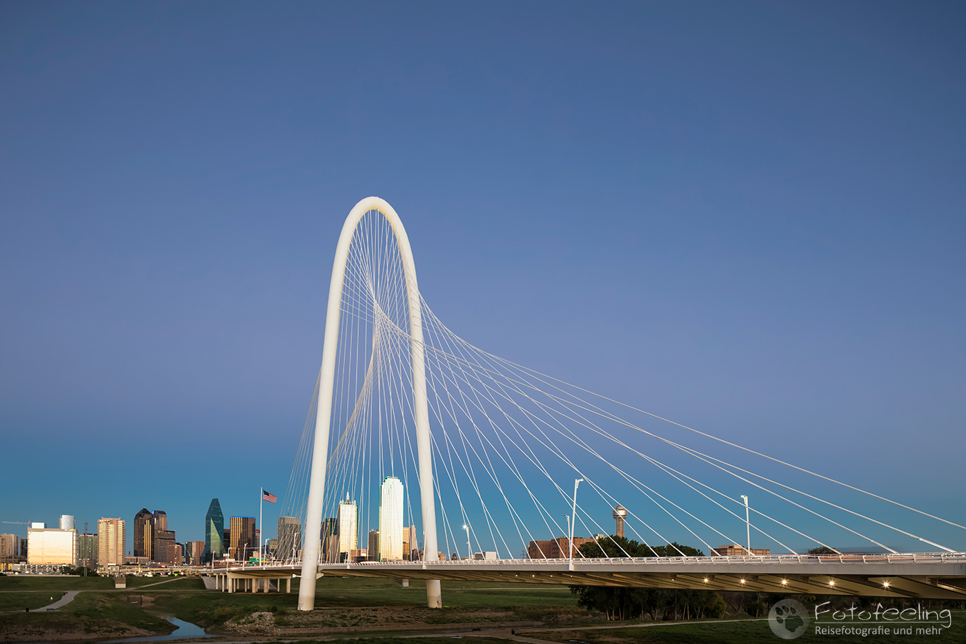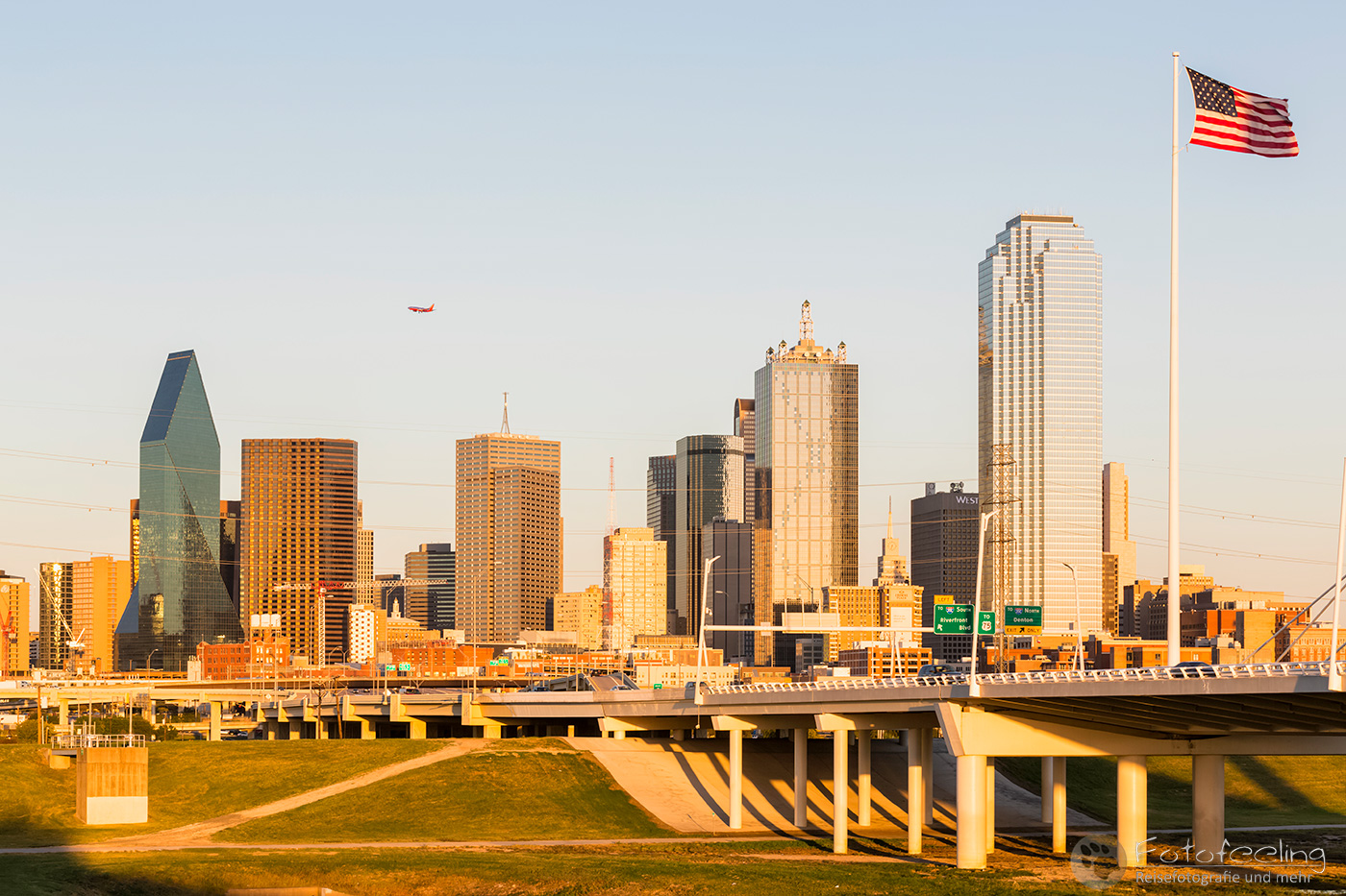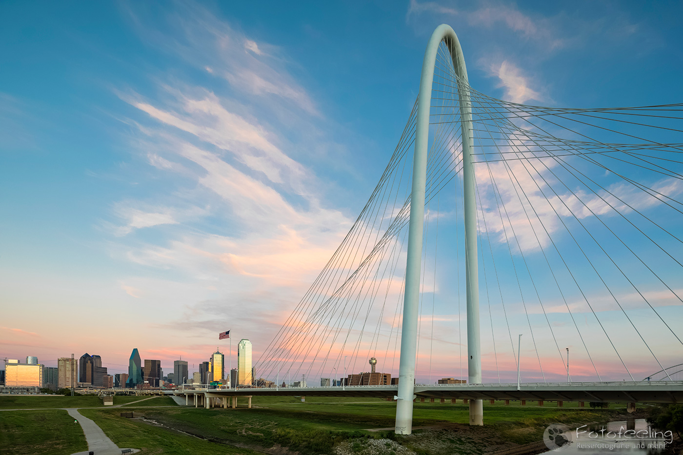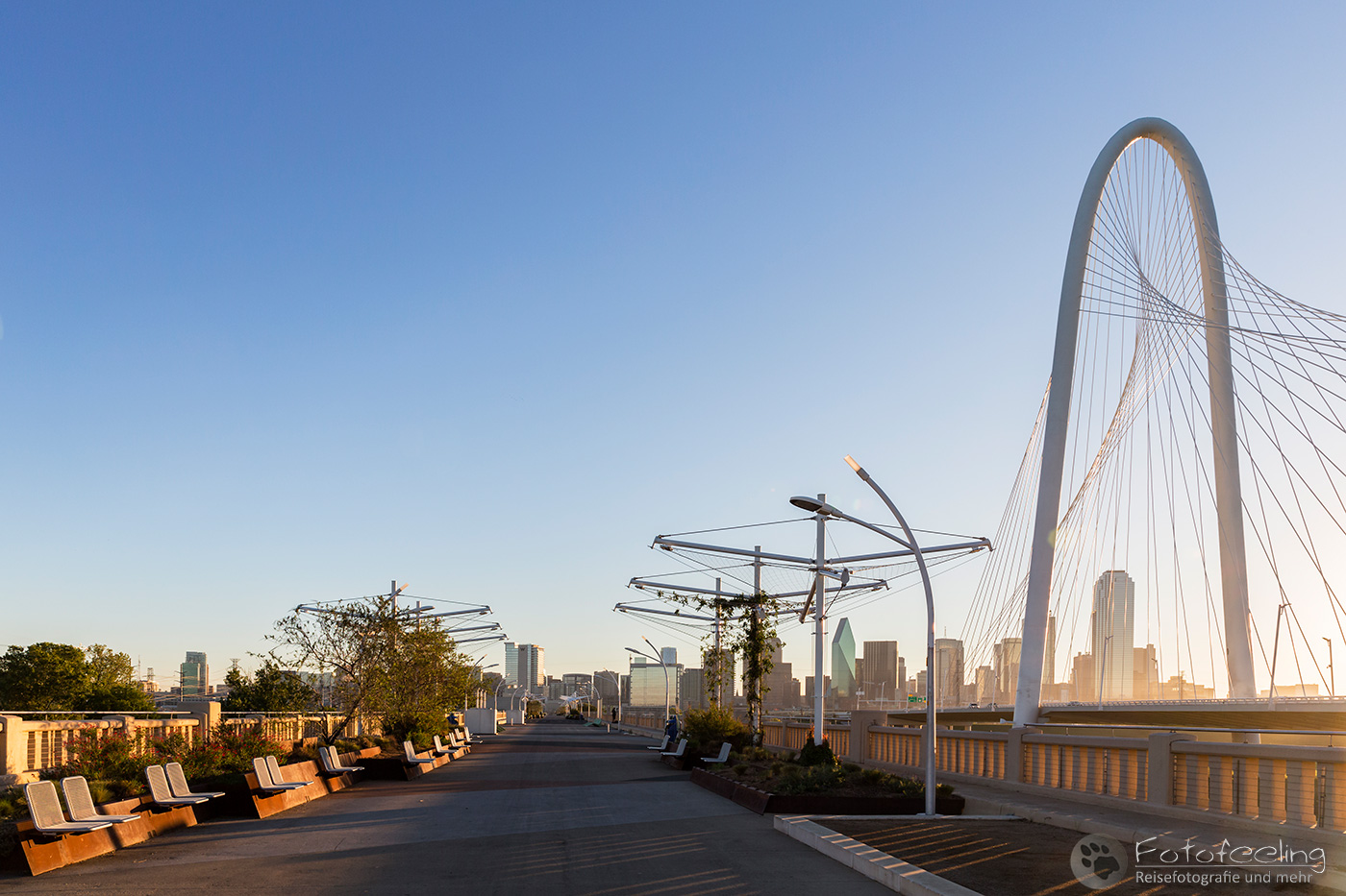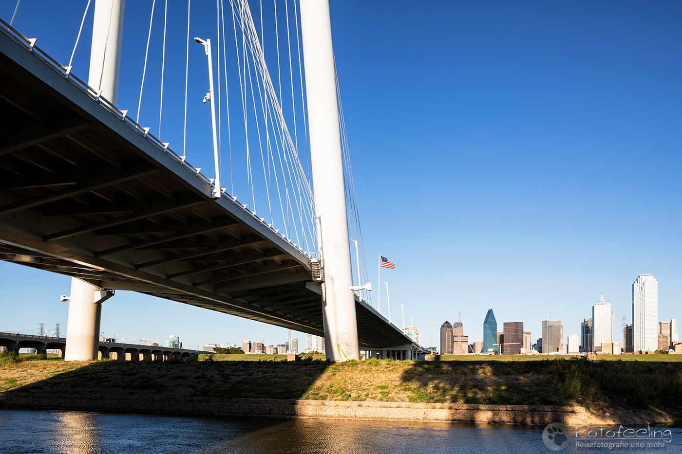 Um 14.00 Uhr erreichten wir Dallas, die drittgrößte Stadt Texas. Wir kämpften uns durch ein Gewirr aus mehrspurigen Autobahnen, Brücken und Baustellen bis Chris die Trinity Fußgängerbrücke erreicht hatte. Das Wetter war perfekt für einen kurzen Fotostopp, denn dicke Wolken hingen auf einem stahlblauen Himmel, zwischen denen die Sonne hervor lachte. Es war angenehm warm. Wir fanden gleich die richtige Zufahrt zur Brücke, wo wir das Auto kostenlos parken konnten. Wir schnappten unsere Kameras und gingen auf die Brücke, von der aus man einen tollen Blick auf die Skyline der Stadt hat. Es machte Spaß über die Brücke zu gehen und auf die mächtigen Wolkenkratzer zu schauen, aber auch die Margaret Hunt Hill Bridge, die gegenüber der Fußgängerbrücke in die Stadt hineinführte, sah sehr beeindruckend aus.