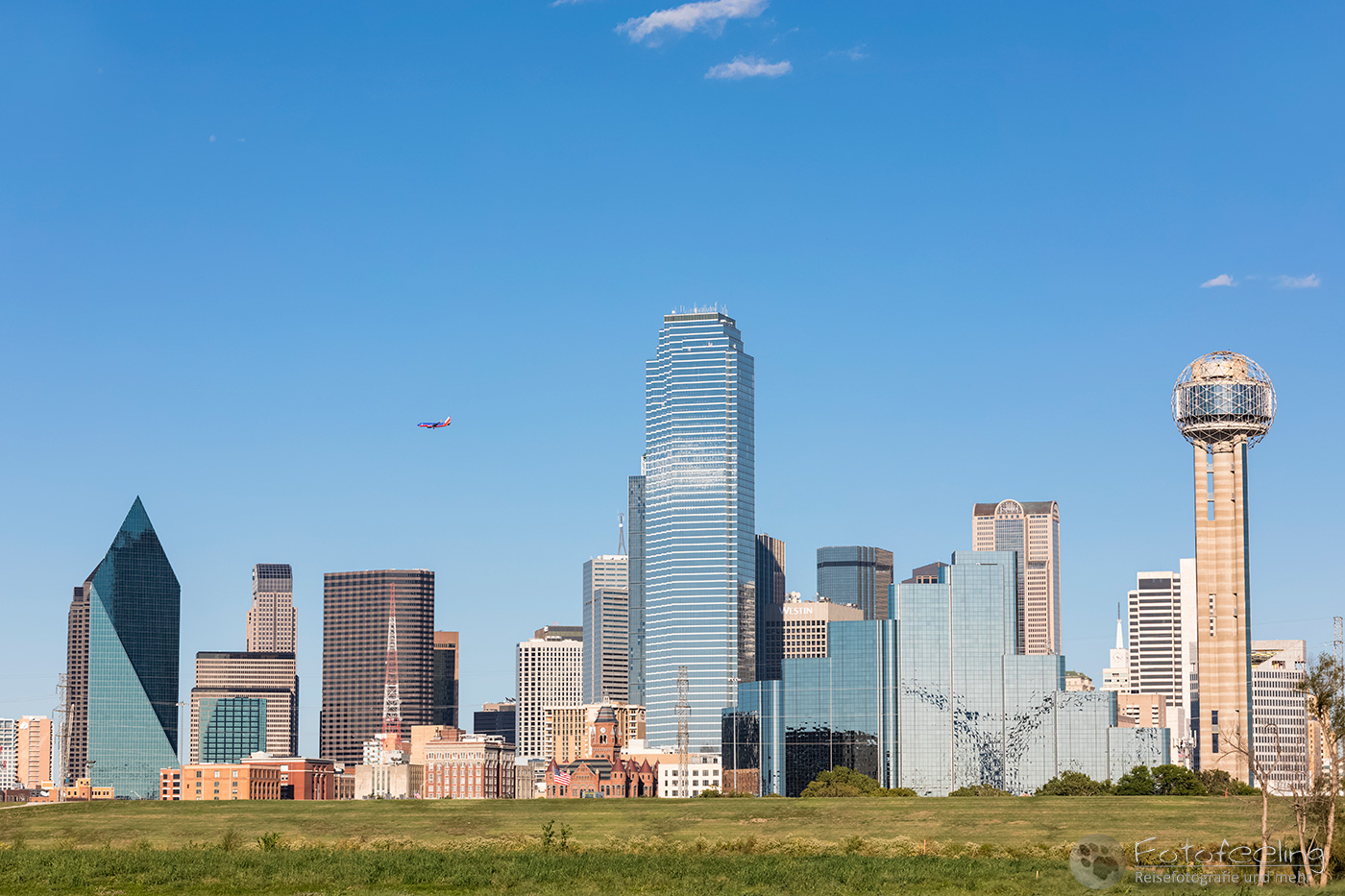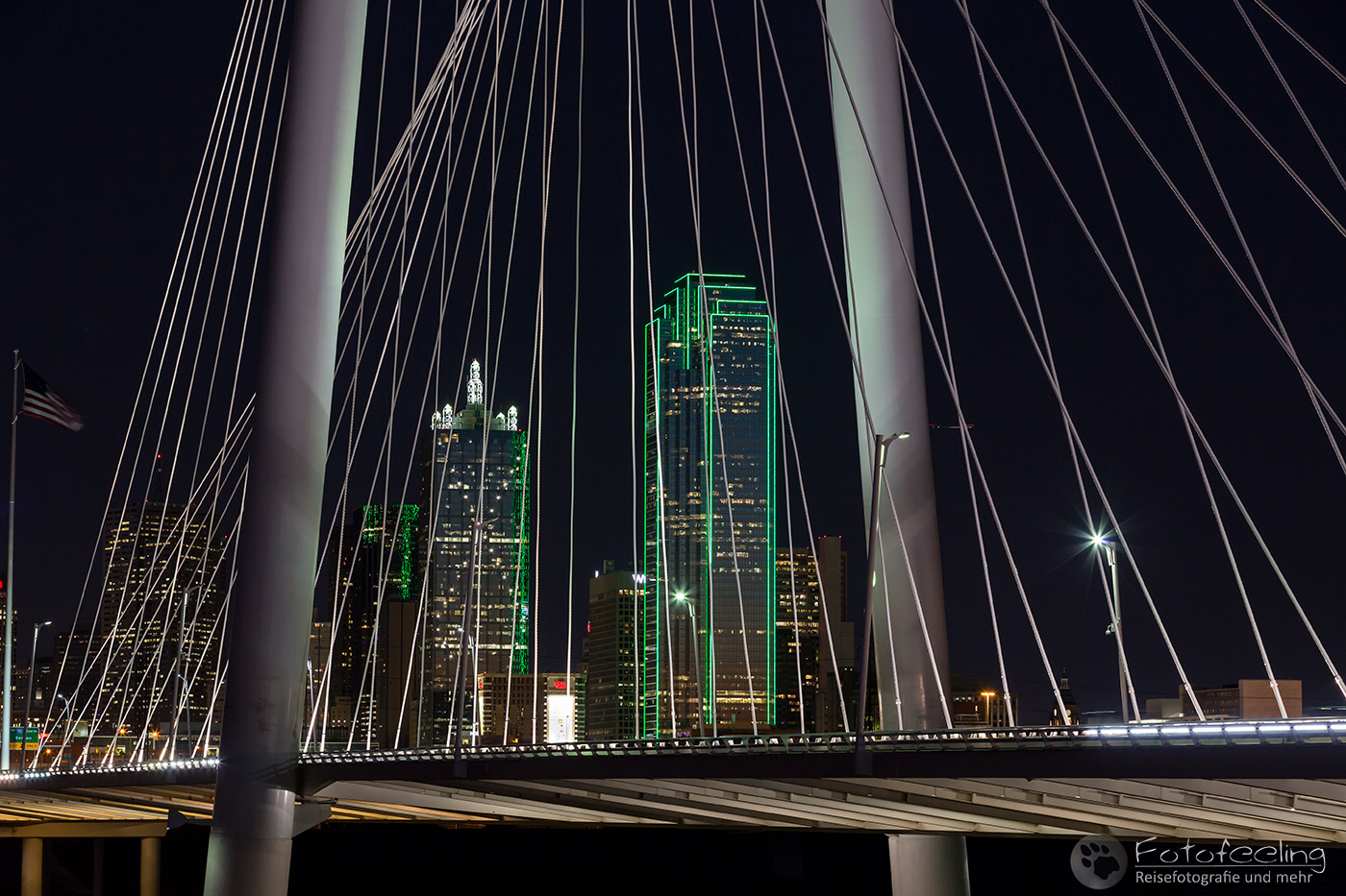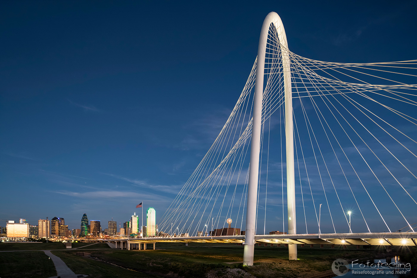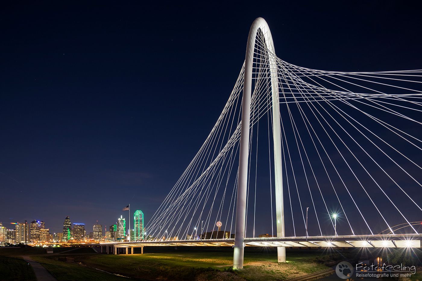 Um 14.00 Uhr erreichten wir Dallas, die drittgrößte Stadt Texas. Wir kämpften uns durch ein Gewirr aus mehrspurigen Autobahnen, Brücken und Baustellen bis Chris die Trinity Fußgängerbrücke erreicht hatte. Das Wetter war perfekt für einen kurzen Fotostopp, denn dicke Wolken hingen auf einem stahlblauen Himmel, zwischen denen die Sonne hervor lachte. Es war angenehm warm. Wir fanden gleich die richtige Zufahrt zur Brücke, wo wir das Auto kostenlos parken konnten. Wir schnappten unsere Kameras und gingen auf die Brücke, von der aus man einen tollen Blick auf die Skyline der Stadt hat. Es machte Spaß über die Brücke zu gehen und auf die mächtigen Wolkenkratzer zu schauen, aber auch die Margaret Hunt Hill Bridge, die gegenüber der Fußgängerbrücke in die Stadt hineinführte, sah sehr beeindruckend aus.