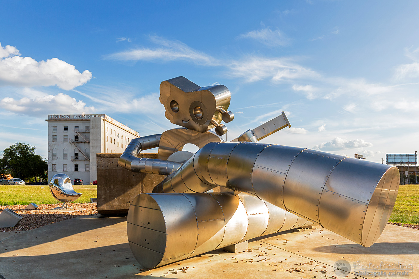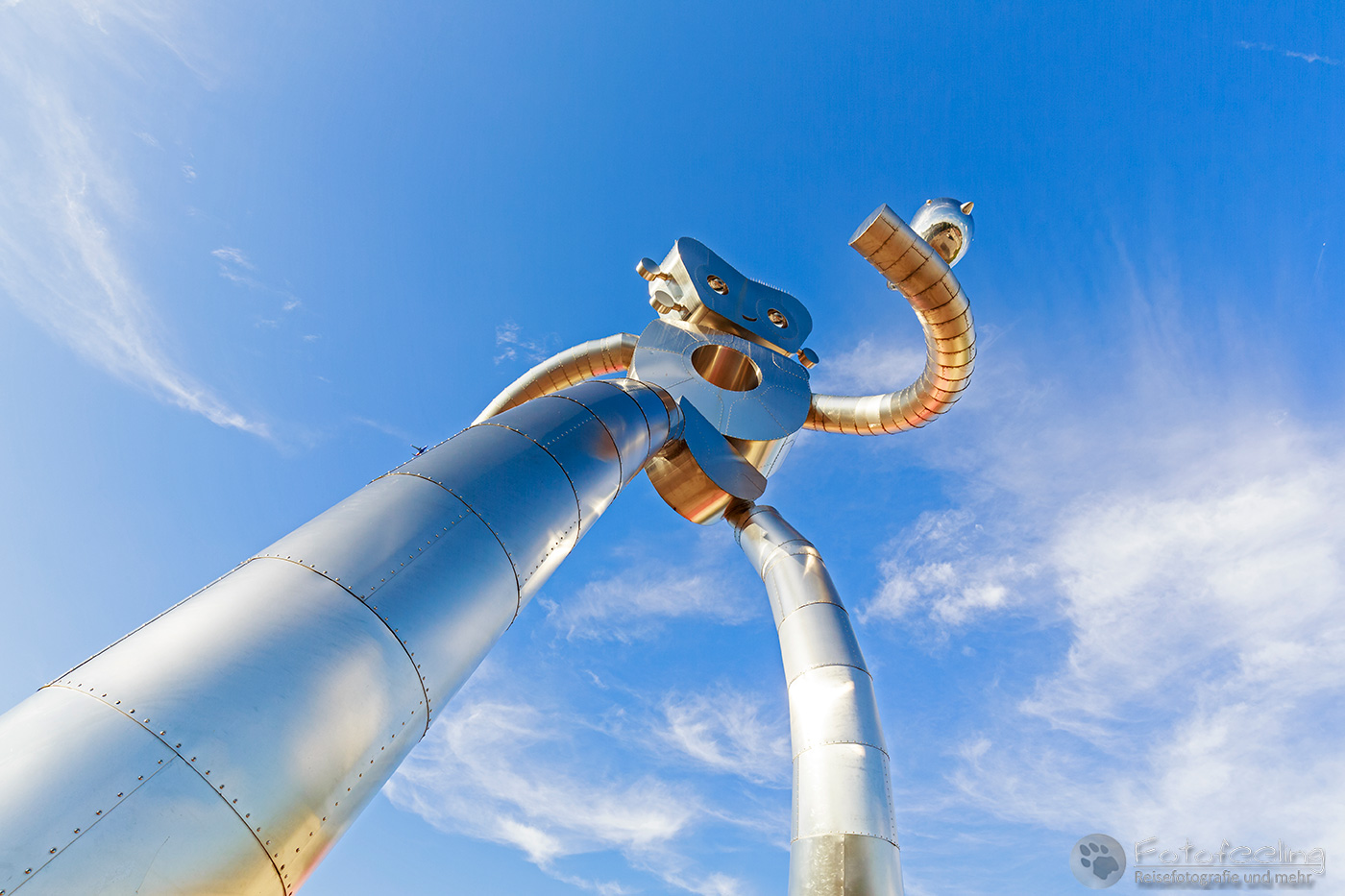 Nachdem wir uns kurz frisch gemacht hatten, starteten wir schon wieder in die Stadt und suchten die Traveling Man Metallskulpturen, die man an drei unterschiedlichen Standorten finden kann. Unser erster Traveling Man, war riesig groß und wanderte durch die Straße, zumindest wirkte es so. Ein anderer lag an der Straße und spielte Gitarre und von dem dritten schauten nur die Augen aus dem Boden. Natürlich waren bei jedem die kleinen silbernen Vögel dabei.