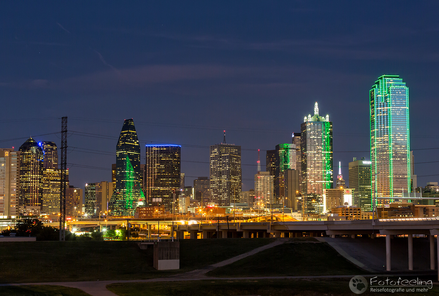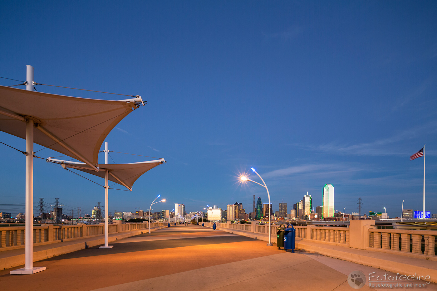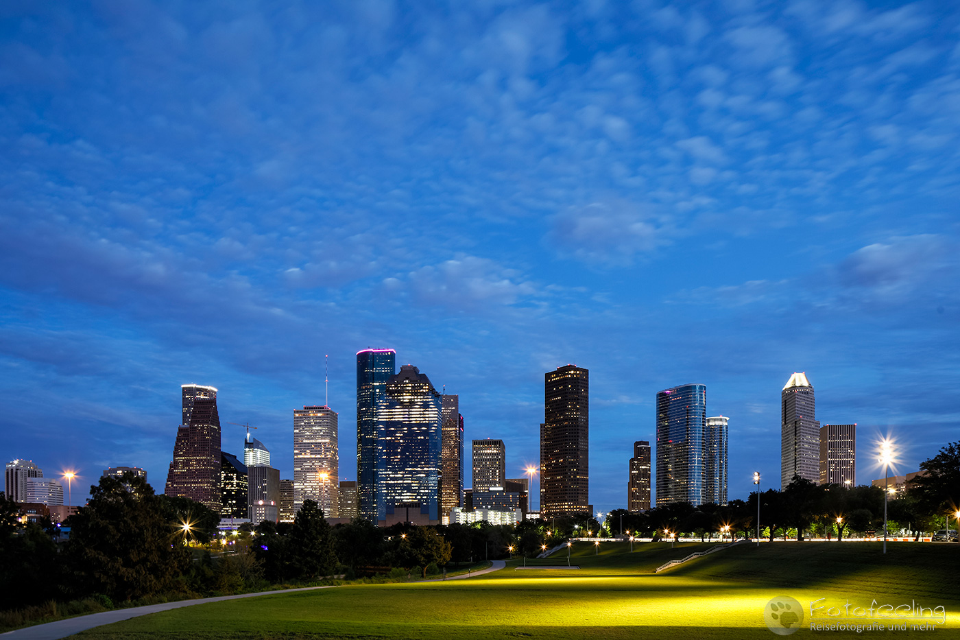 Pünktlich zum Sonnenuntergang fanden wir uns wieder im Eleanor Tinsley Park ein, wo wir die Blaue Stunde fotografierten. Waren nachmittags noch etliche Sportler hier unterwegs, so wirkte es in der Dämmerung wie ausgestorben. Mit uns waren jedoch noch ein paar andere Fotografen vor Ort und auch einige Paare, die ebenfalls Bilder von der Skyline machten und genauso begeistert wie wir waren.