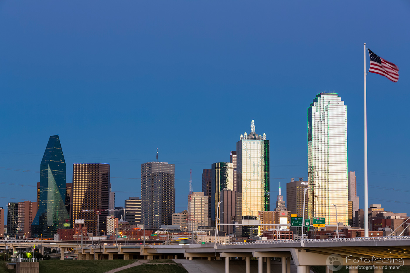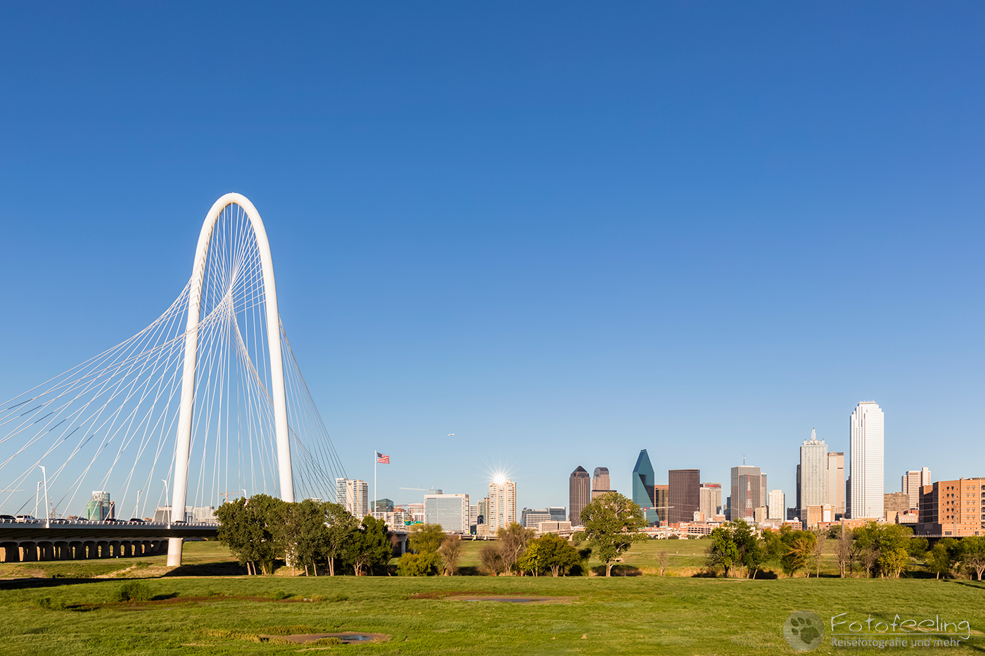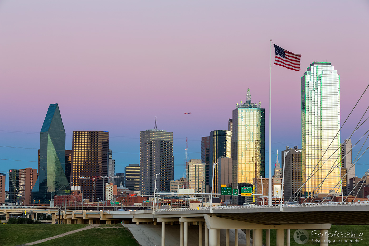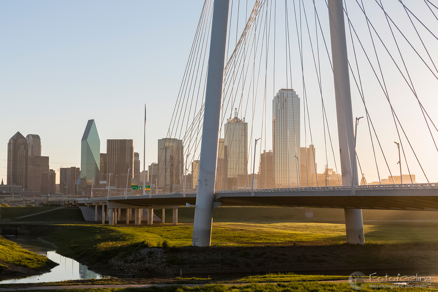 Leise wollte Chris sich im Dunkeln auf den Weg machen, aber da ich eh schon wach war, wollte ich auch mit. Wir nahmen uns aus dem Bistro noch Kaffee und ein paar Teilchen mit und fuhren dann zu einer Brücke, die über den Tom Landry Freeway führte, von der man aus eine schöne Aussicht auf die Hochhäuser und die darunter liegenden Freeway hatte. Hier blieben wir bis zur Dämmerung und fuhren dann noch einmal zur Trinity Brücke, um die Aussicht auf die Stadt am frühen Morgen zu genießen. Zurück im Hotel sprangen wir noch einmal in den Whirlpool, bevor wir zusammenpackten und uns auf die lange Fahrt zum Caddo Lake machten.