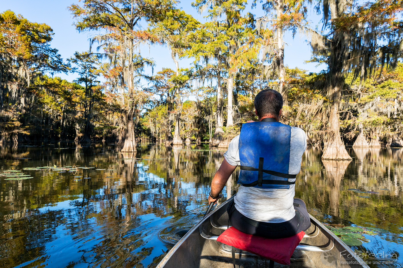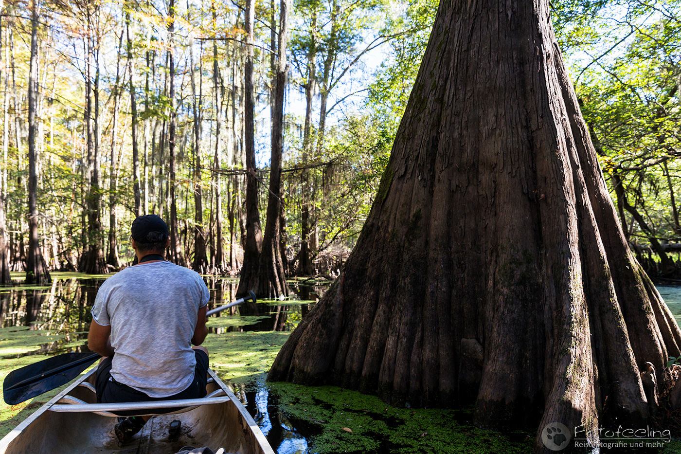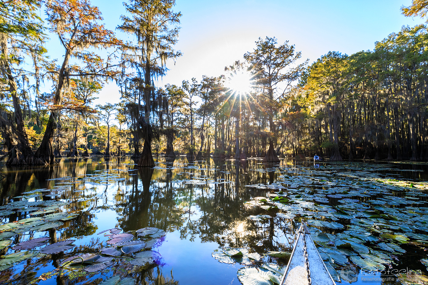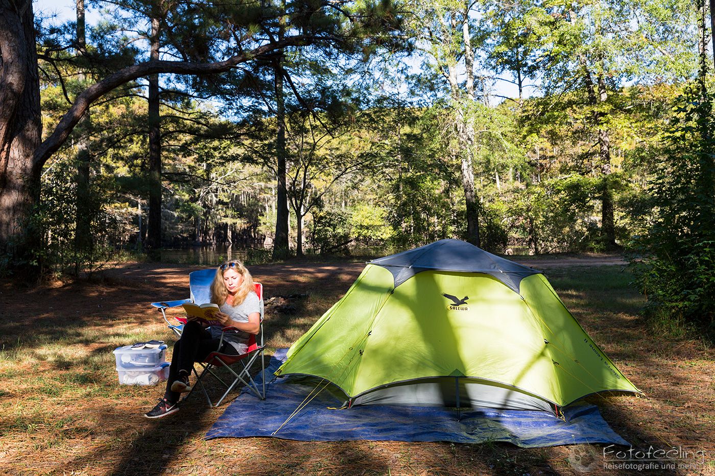 Zurück auf der Campsite lasen wir in unseren Büchern, denn wir mussten noch bis 17.00 Uhr die Zeit überbrücken. Wir hatten nämlich eine Sundowner Tour auf den Caddo Lake gebucht.