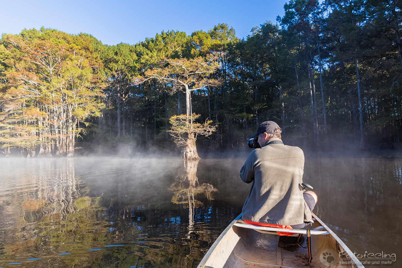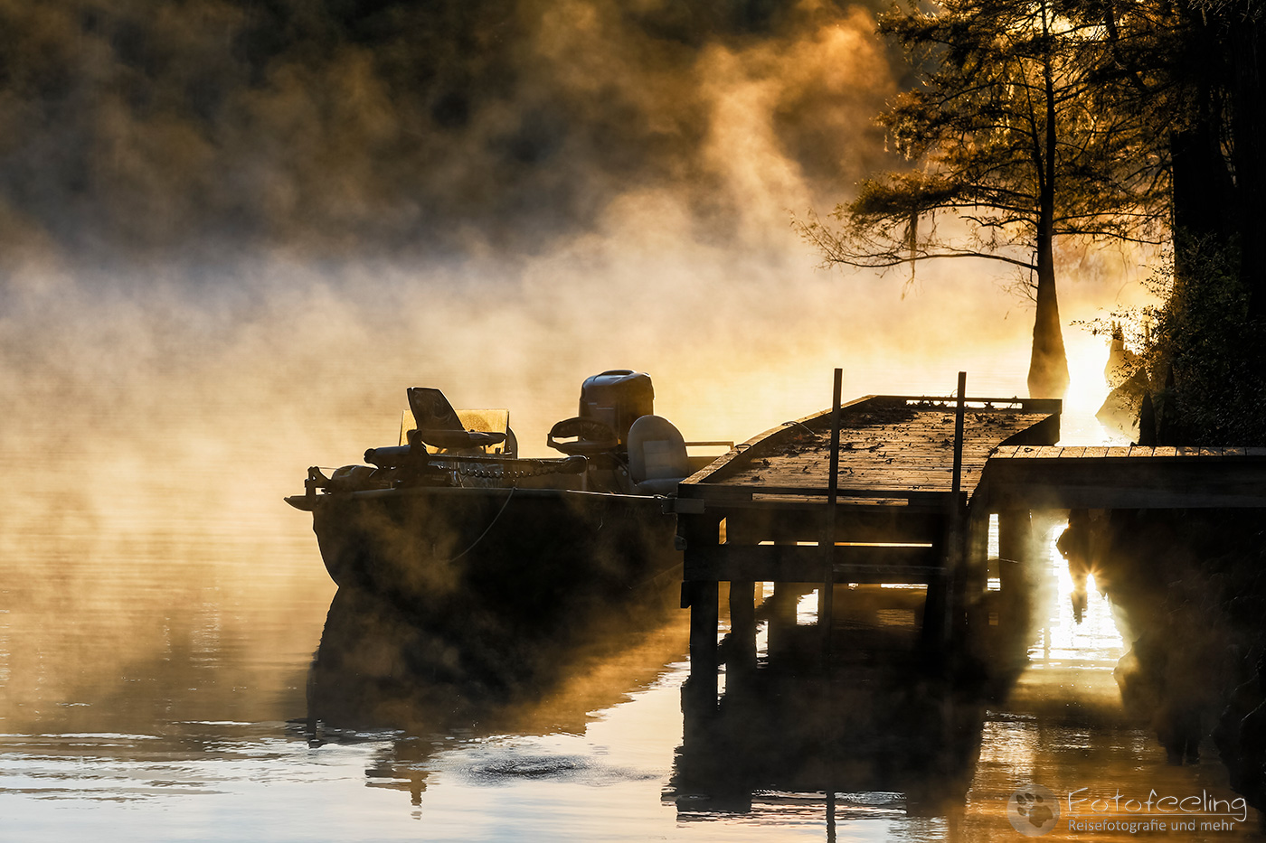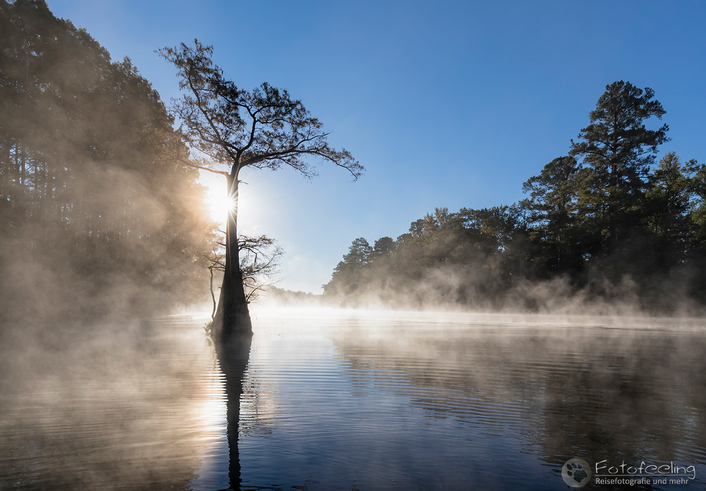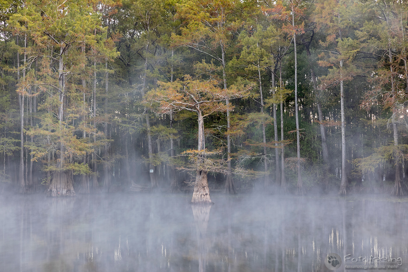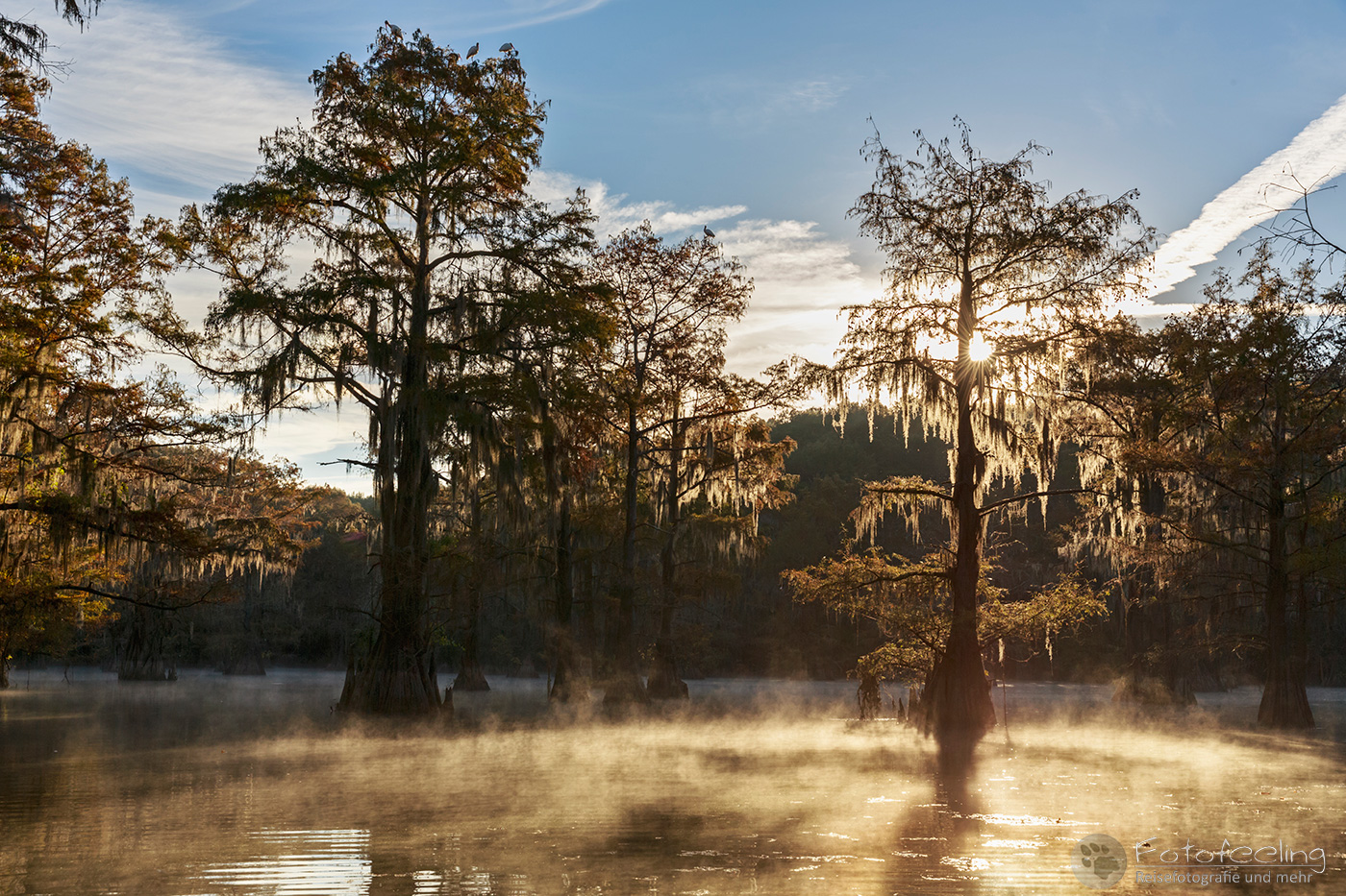 Als wir an diesem Morgen vor Sonnenaufgang aufwachten, war alles klamm und feucht. Kaum waren wir aus dem Zelt, sahen wir den Grund, denn Nebel lag auf dem Wasser, sofort waren wir hellwach. Während ich Kaffee kochte, lief Chris zum Steg und machte Bilder. Der Kanal und die vereinzelten Sumpfzypressen im Wasser von Nebel umgeben, zauberten eine besonders mystische Stimmung. Als die Sonne dann aufging, wurde es noch schöner.