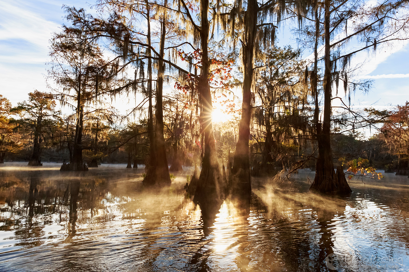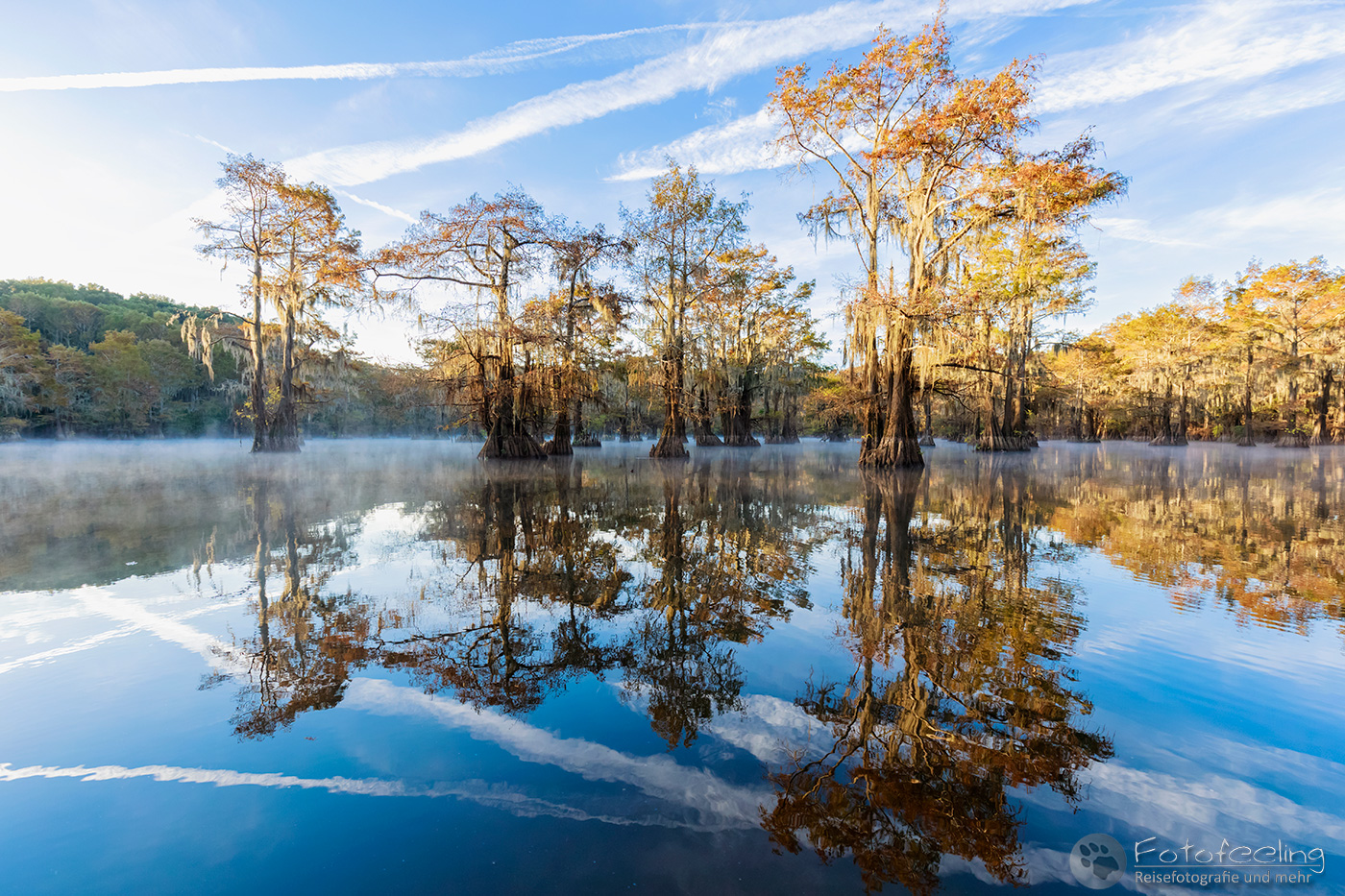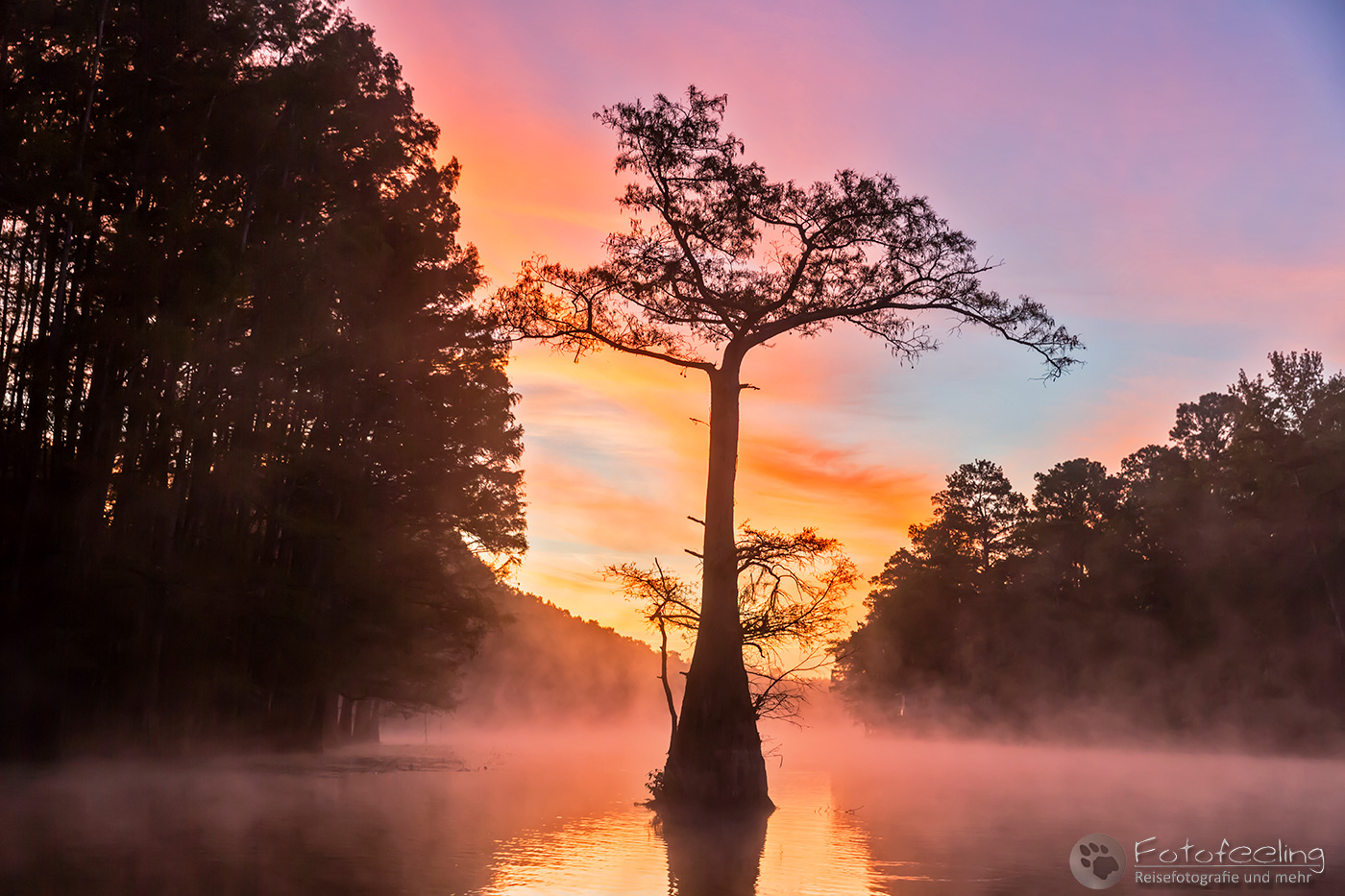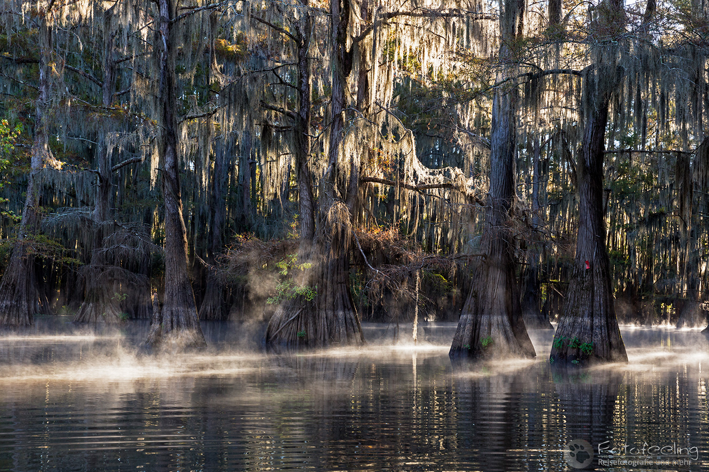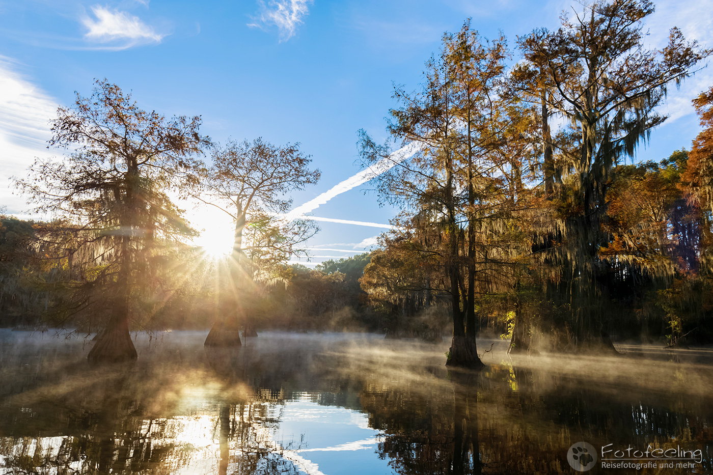 Als wir an diesem Morgen vor Sonnenaufgang aufwachten, war alles klamm und feucht. Kaum waren wir aus dem Zelt, sahen wir den Grund, denn Nebel lag auf dem Wasser, sofort waren wir hellwach. Während ich Kaffee kochte, lief Chris zum Steg und machte Bilder. Der Kanal und die vereinzelten Sumpfzypressen im Wasser von Nebel umgeben, zauberten eine besonders mystische Stimmung. Als die Sonne dann aufging, wurde es noch schöner.