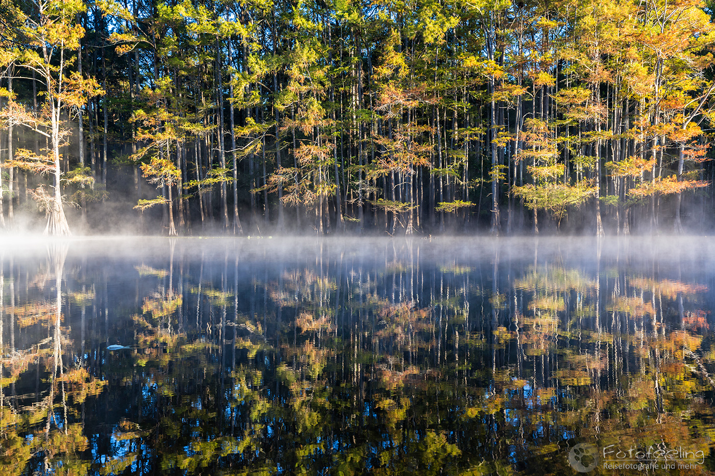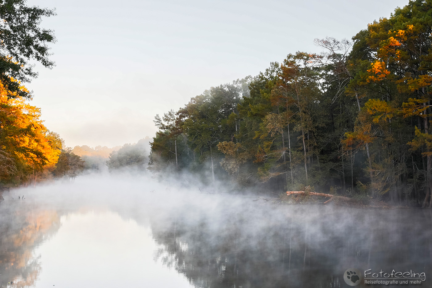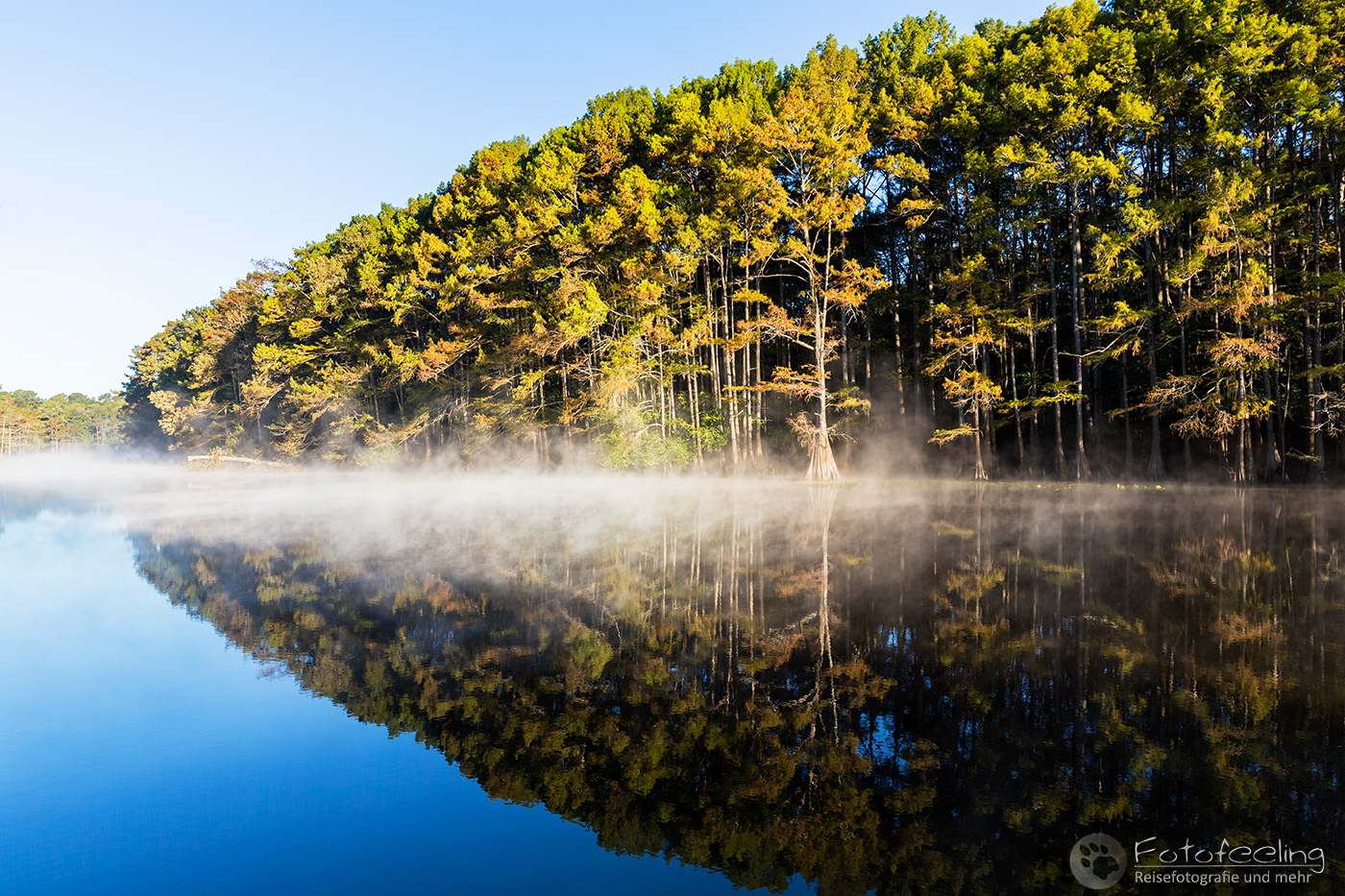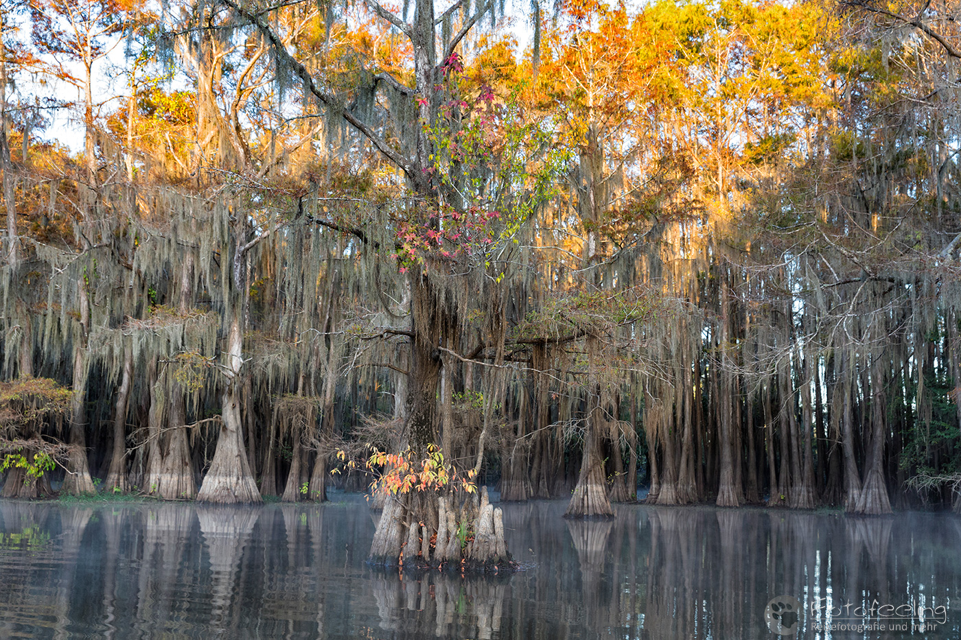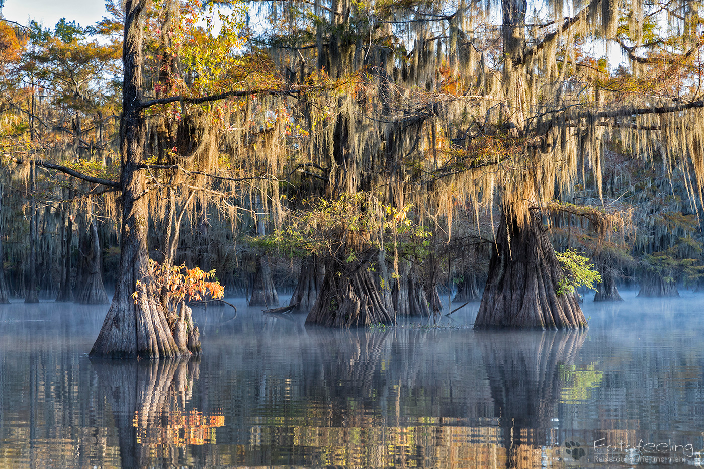 Als wir an diesem Morgen vor Sonnenaufgang aufwachten, war alles klamm und feucht. Kaum waren wir aus dem Zelt, sahen wir den Grund, denn Nebel lag auf dem Wasser, sofort waren wir hellwach. Während ich Kaffee kochte, lief Chris zum Steg und machte Bilder. Der Kanal und die vereinzelten Sumpfzypressen im Wasser von Nebel umgeben, zauberten eine besonders mystische Stimmung. Als die Sonne dann aufging, wurde es noch schöner.