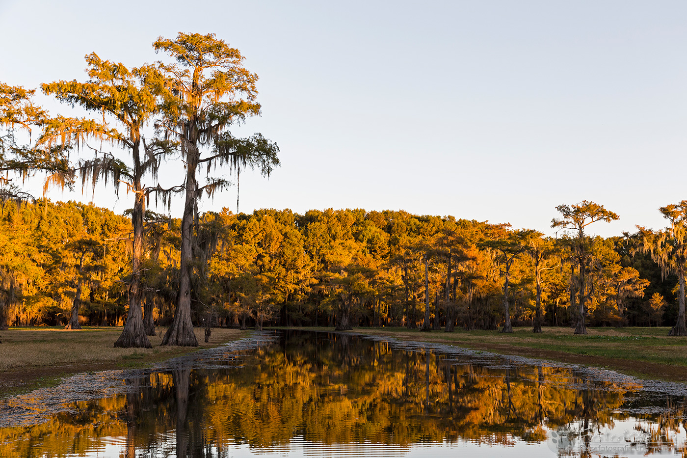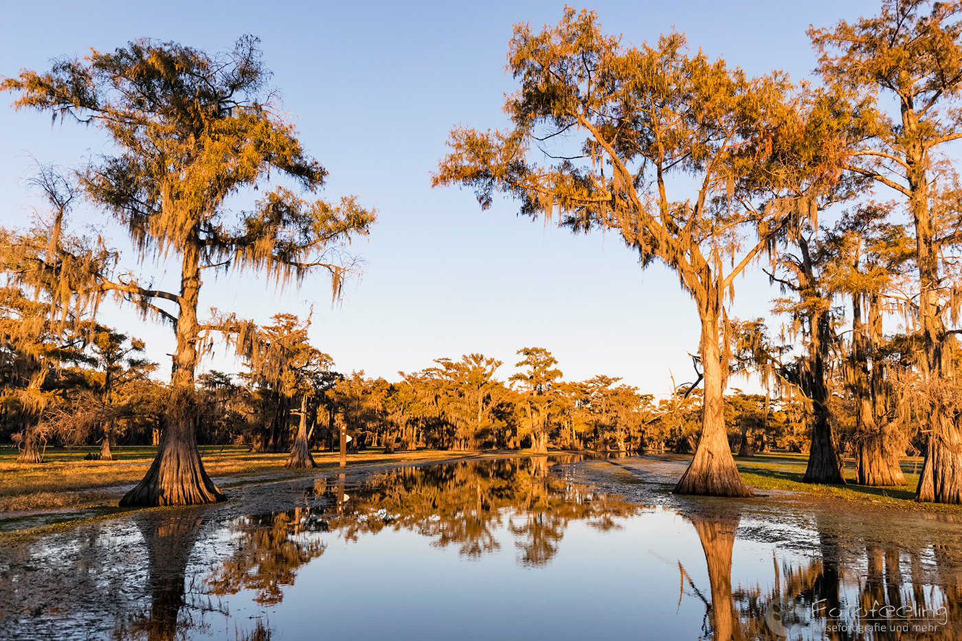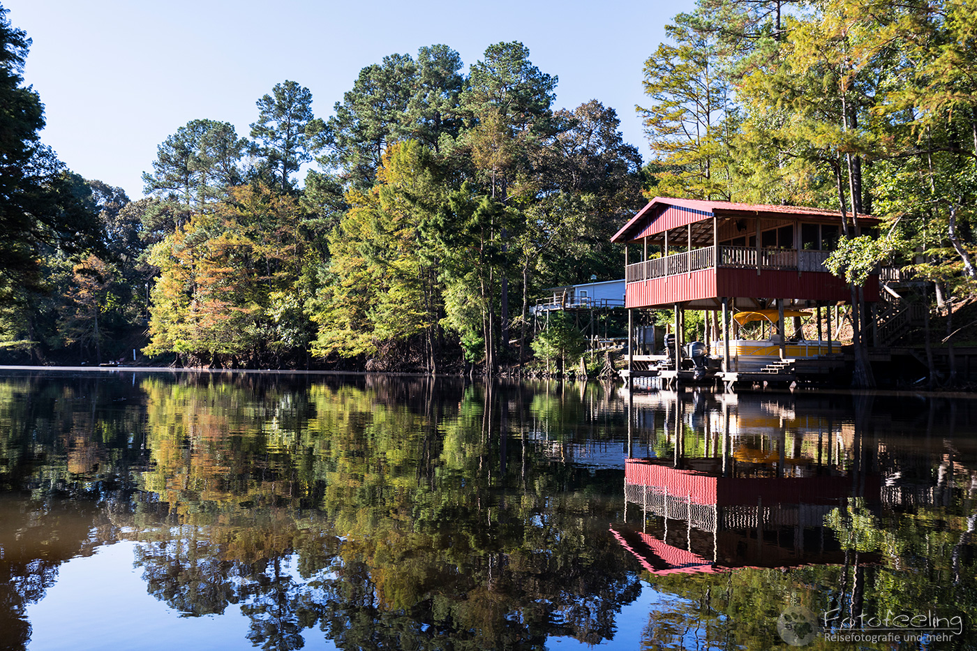 Für den Morgen hatten wir uns noch ein letztes Mal das Kajak ausgeliehen und diesmal paddelten wir schon in der Dämmerung los. Wieder war es sehr kühl und feucht. Nebel lag auf dem Wasser. Wir kamen jedoch nicht weit, denn der Himmel verfärbte sich orange-rosa und unsere „Haussumpfzypresse“ lag perfekt im Morgenlicht. So umrundeten wir sie und schossen ein paar Bilder. Danach besuchten wir den Brandon Lake ein letztes Mal und genossen hier die Ruhe und Einsamkeit des Caddo Lakes. Mit uns waren wieder nur Reiher und ein paar andere Wasservögel hier. Als die Sonne den Nebel vertrieben hatte, paddelten wir zurück zum Anleger.
