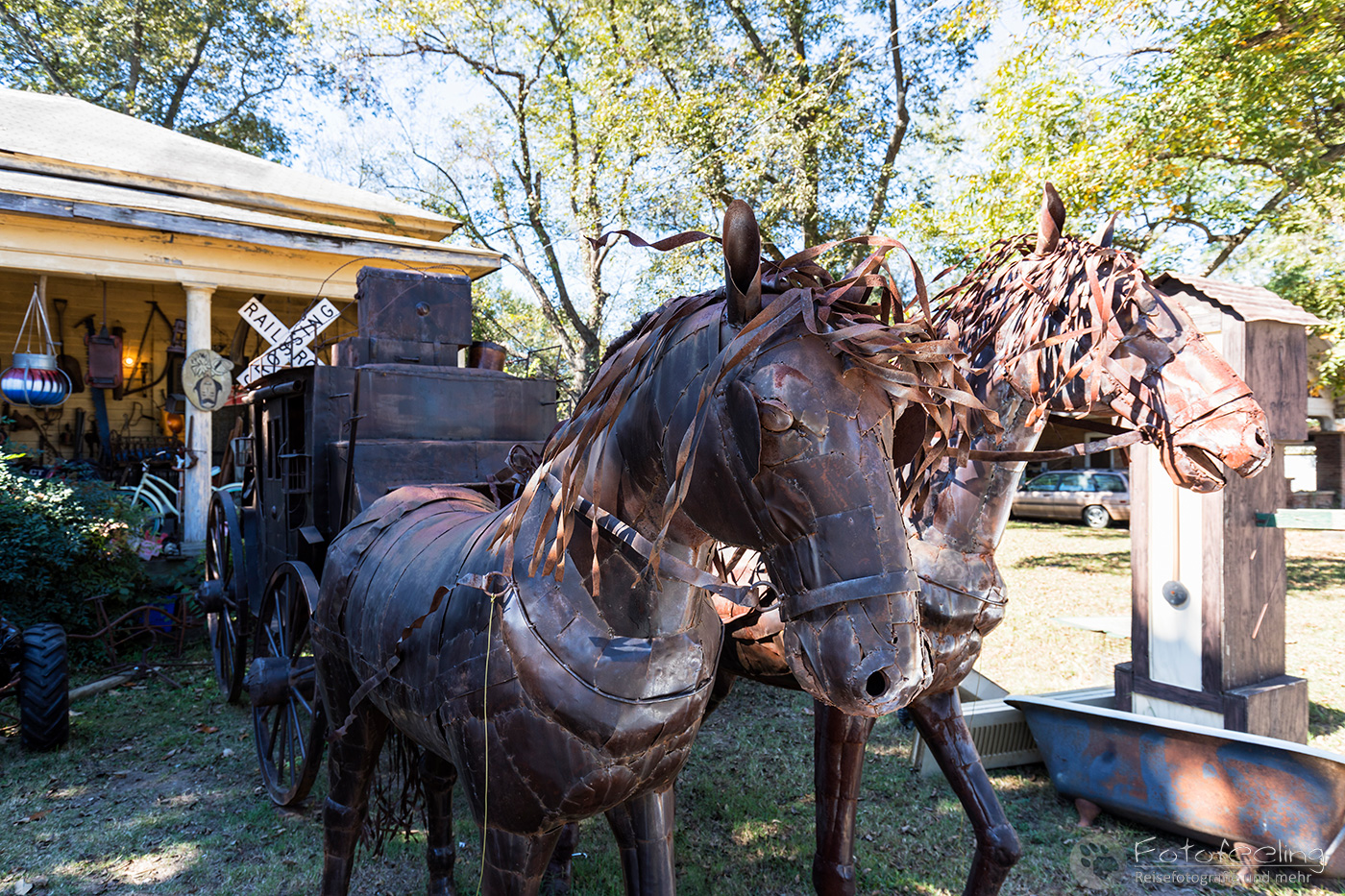 Mittags waren wir zurück auf der Campsite. Was sollten wir nur mit dem halben Tag anfangen? Die Lösung kam von unserer Campsite Betreiberin. Sie schickte uns nach Jefferson, einer kleinen historischen Stadt am Caddo Lake, die heutzutage größtenteils von Flohmärkten und Tourismus lebt. Die Stadt war zwischen 1845 und 1872 einer der wichtigsten Häfen Texas und einer der größten Städte. Hier hielten Dampfschiffe, die in nur 4-5 Tagen von und bis New Orleans fuhren. Im Jahre 1873 sprengte die Armee den Red River Raft, eine natürliche Blockade, die zur Aufstauung des Sees geführt hatte und das Wasser versiegte langsam. Hinzu kam, dass die Pacific Railway von Texarkana nach Marshall Jefferson ausließ und erst in den folgenden Jahren in Jefferson anhielt. Aber noch immer zeugen etliche Villen von dem einstigen Reichtum der Stadt. Wir liefen durch die Straßen und fühlten uns wie in den Südstaaten. Mittags aßen wir in einem kleinen Hamburger Laden abseits der Hauptstraßen und hatten eine gute Wahl getroffen, denn es schmeckte hervorragend.