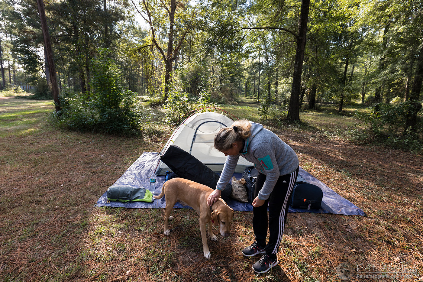 In dem Städtchen Marshall kauften wir noch im Kroger Markt ein, ehe wir in das Gebiet des Caddo Lakes kamen. Eigentlich hatten wir auf der Reise immer Glück und so dachte ich mir nichts dabei, als Chris im Rangerhaus des State Parks verschwand. Aber als er einige Minuten später mit finsterer Miene wieder heraus kam, ahnte ich schon, dass wir diesmal Pech gehabt hatten. Es war überhaupt nichts mehr frei. Zum Glück hatte die Rangerin Chris einen Tipp für einen weiteren Campingplatz gegeben. Doch vorerst versuchten wir es in den Orten am See. Nichts war zu finden. Entweder war niemand vor Ort oder es gab keine Campsite mehr. Jedenfalls verzweifelten wir langsam. Nicht einmal eine Hütte war noch zu haben. Okay, nachdem wir ziemlich frustriert waren, versuchten wir den Tipp und fuhren zu Backwater Jacks, etwas außerhalb. Dort hatten wir Glück. Als einzige Zeltcamper hatten wir einen schönen großen Platz nahe dem Fluss ganz für uns alleine. Die Vermieter, ein sehr nettes älteres Ehepaar, gaben uns gleich reichlich Tipps und Ratschläge für unseren Aufenthalt hier am Caddo Lake. Es gab heiße Duschen und gute Toiletten.