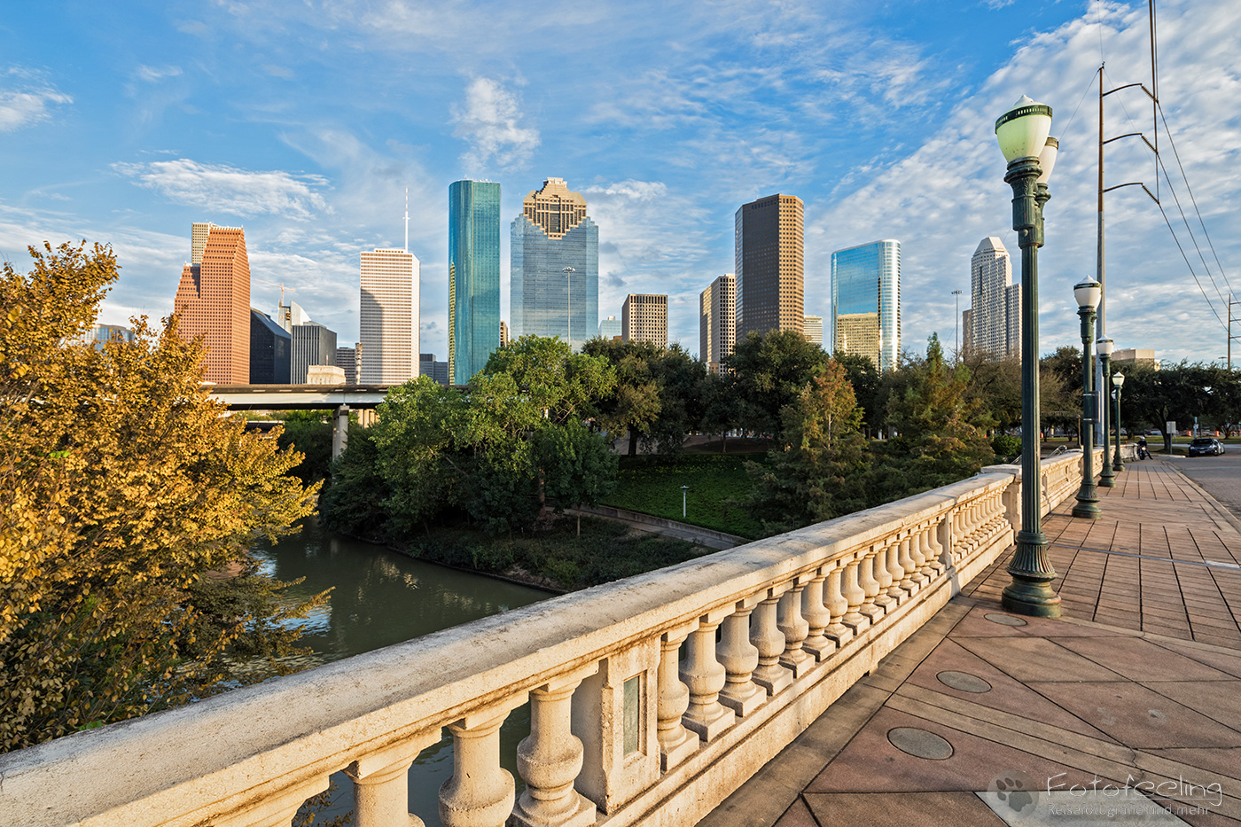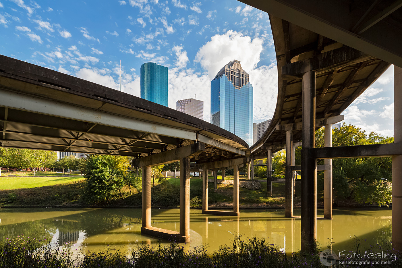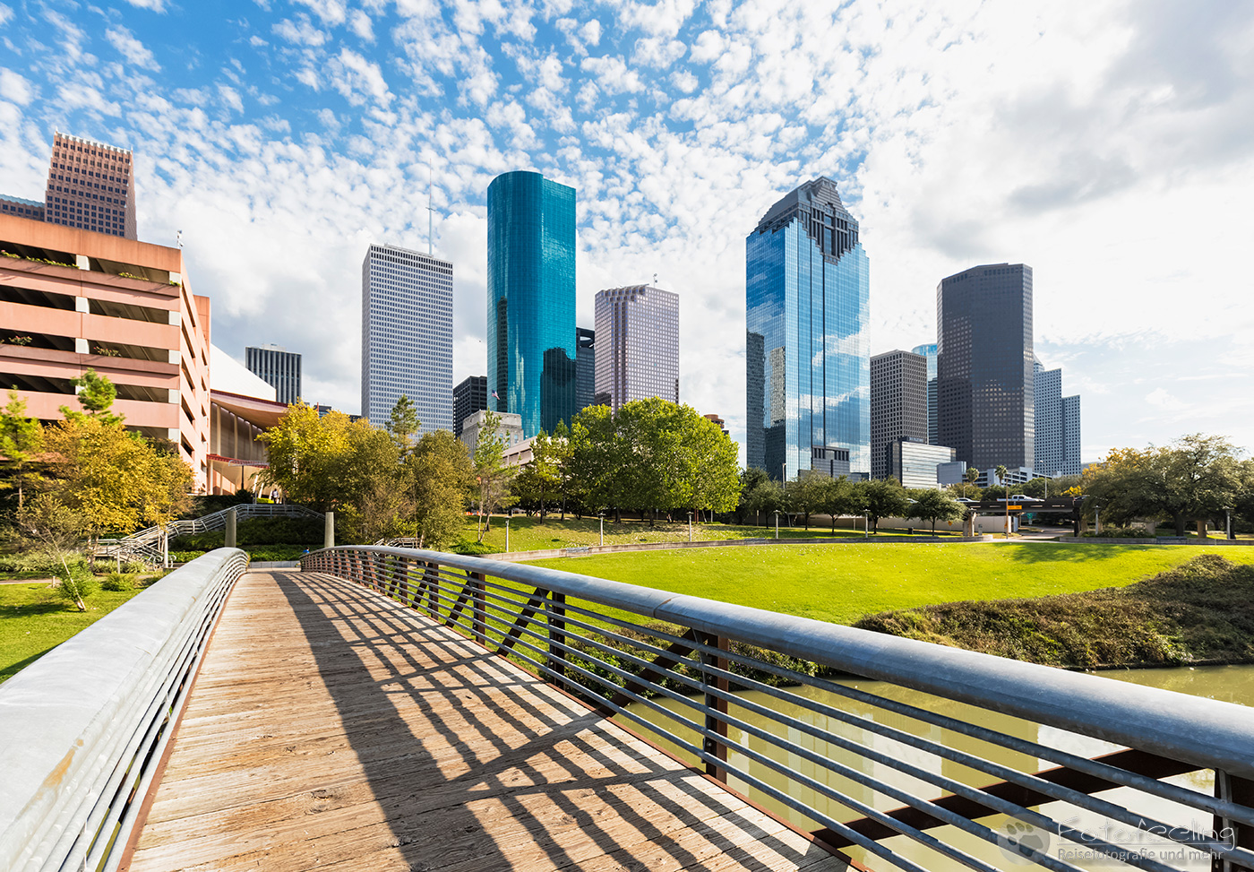 Dank unseres Navis fanden wir problemlos unsere Unterkunft, das Best Western Plus Downtown Inn & Suites in der Nähe des Zentrums und des Eleanor Tinsley Parks, wo wir am Abend die Skyline fotografieren wollten. Doch zuerst schauten wir uns den Park an und spazierten weiter in die Stadt hinein. Alles war irgendwie wie ausgestorben, aber es war ja auch Sonntag. Trotzdem kam es uns etwas trostlos vor in den Straßen von Houston. Wir schauten uns Wells Fargo Plaza an und im Sam Houston Park die St. John Church. Dahinter türmten sich riesig die Hochhäuser auf. Besonders schön fand ich die Aussicht von einer Brücke auf den Buffalo Bayou.