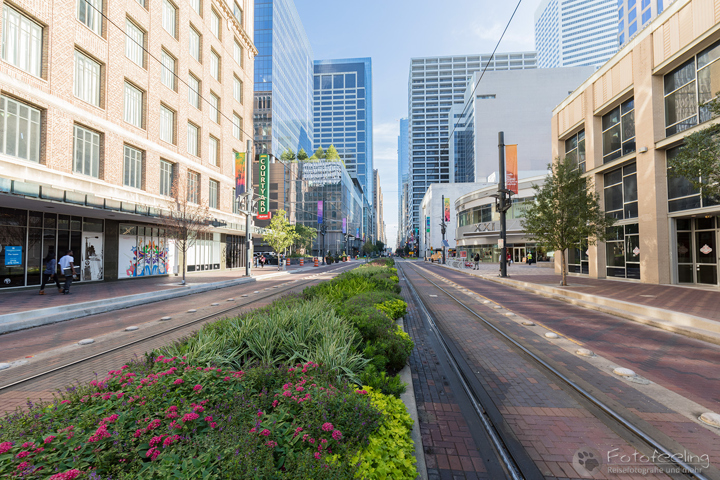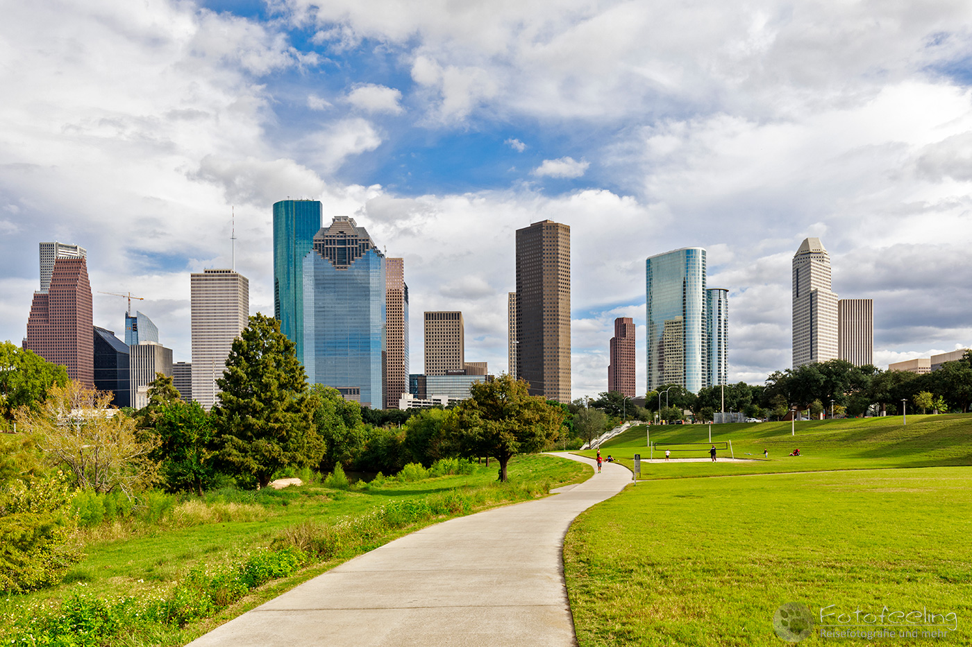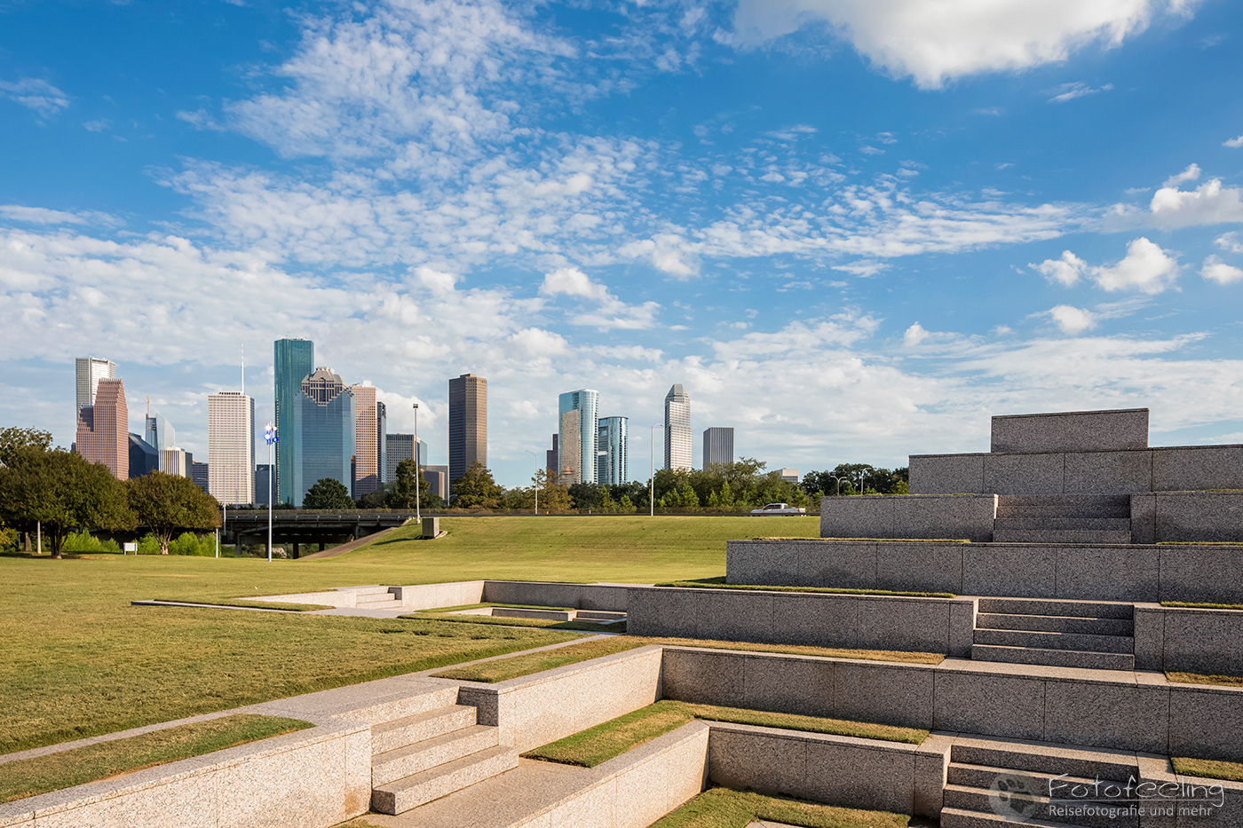 Dank unseres Navis fanden wir problemlos unsere Unterkunft, das Best Western Plus Downtown Inn & Suites in der Nähe des Zentrums und des Eleanor Tinsley Parks, wo wir am Abend die Skyline fotografieren wollten. Doch zuerst schauten wir uns den Park an und spazierten weiter in die Stadt hinein. Alles war irgendwie wie ausgestorben, aber es war ja auch Sonntag. Trotzdem kam es uns etwas trostlos vor in den Straßen von Houston. Wir schauten uns Wells Fargo Plaza an und im Sam Houston Park die St. John Church. Dahinter türmten sich riesig die Hochhäuser auf. Besonders schön fand ich die Aussicht von einer Brücke auf den Buffalo Bayou.