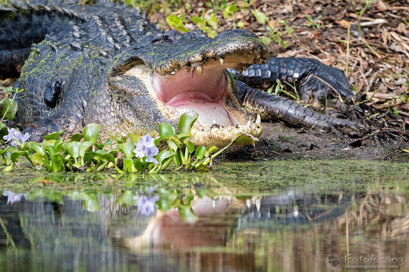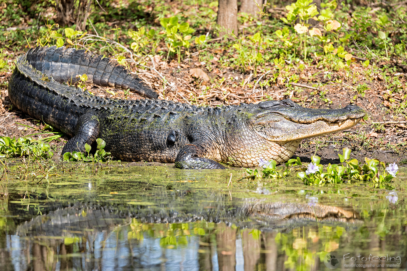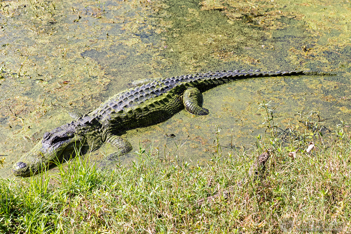 Unterwegs holten wir uns noch bei Starbucks Kaffee und Teilchen und kamen gut gestärkt um 7.30 Uhr am Park an, der gerade für die Besucher öffnete. Erst einmal verschafften wir uns einen Überblick und schlenderten entlang der Seen auf der Suche nach den Alligatoren, aber es war noch zu früh und zu kühl an diesem Morgen. Also mussten wir uns erst einmal mit Eichhörnchen und Wasservögeln begnügen. Die Wege und die Landschaft waren sehr schön, so dass die Zeit wie im Flug verging und es langsam wärmer wurde. Um die Mittagszeit herum entdeckten wir unseren ersten Alligator, der seinen Kopf aus dem Wasser streckte. Kurz darauf sichteten wir ein kolossales Exemplar, das träge am Ufer lag und sich von der Mittagssonne wärmen ließ, während es bewegungslos seine Umgebung im Auge behielt. Ab und zu gähnte der Riese und änderte auch mal ein wenig seine Position, aber ansonsten lag er einfach nur da und sonnte sich. Dafür sahen wir noch ein paar Wasserschildkröten und genossen das schöne warme Wetter nach der Kühle des Morgens.
