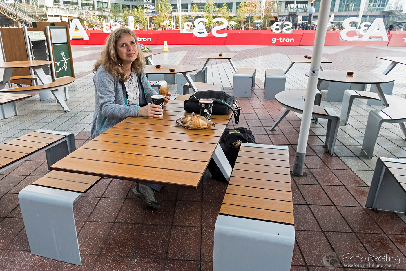 Bei McDonald‘s schlürften wir unseren traditionellen Kaffee und genossen dazu ein Nuss-Nougat-Croissant. Danach gingen wir durch die Sicherheitsschleuse, vor der sich eine lange Menschentraube gebildet hatte, die jedoch schnell abgefertigt wurde. Dann waren wir an der Reihe und hielten mal wieder kurzfristig den Verkehr auf. Aber diesmal gab es nichts zu beanstanden und wir konnten passieren.