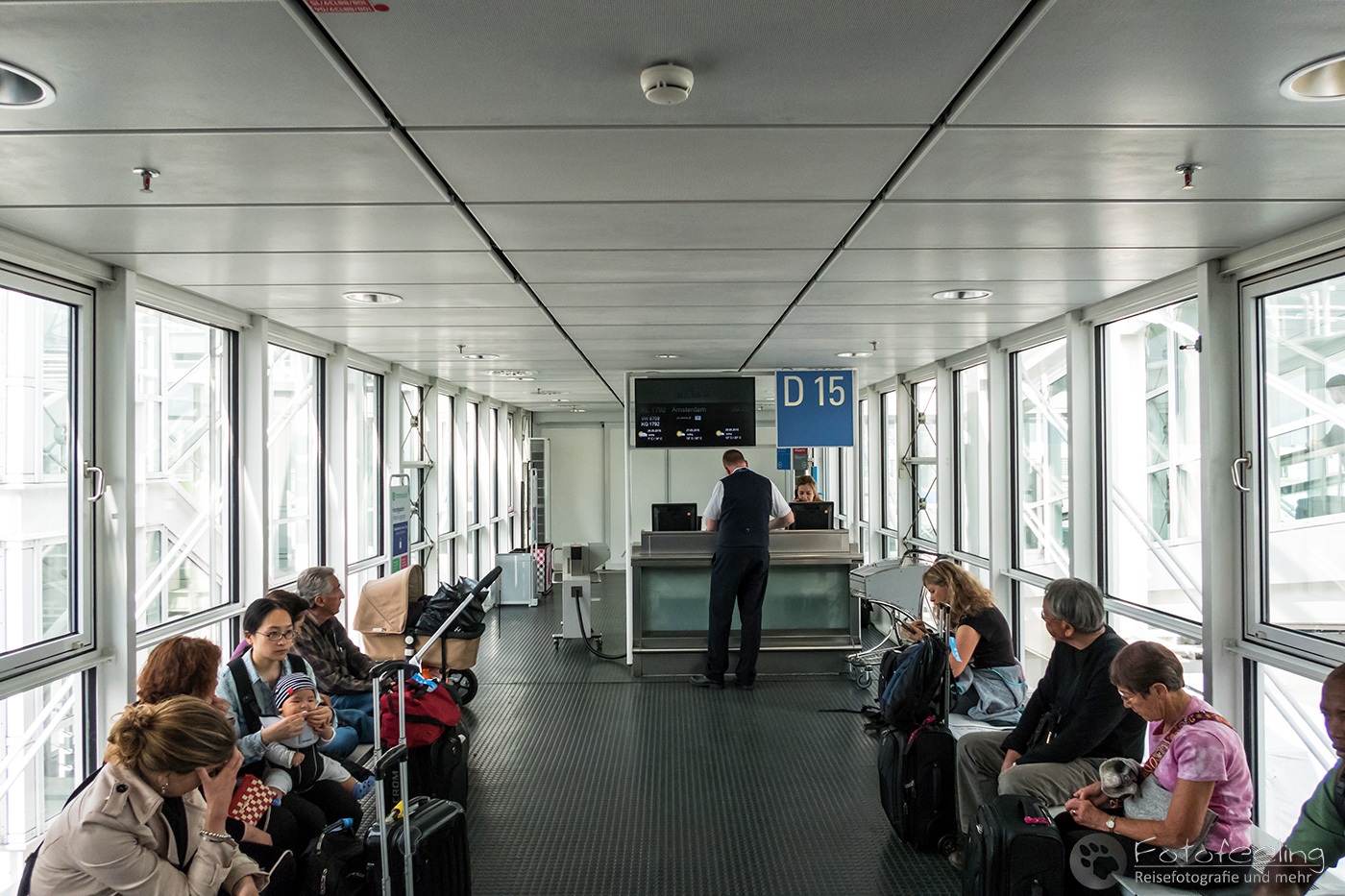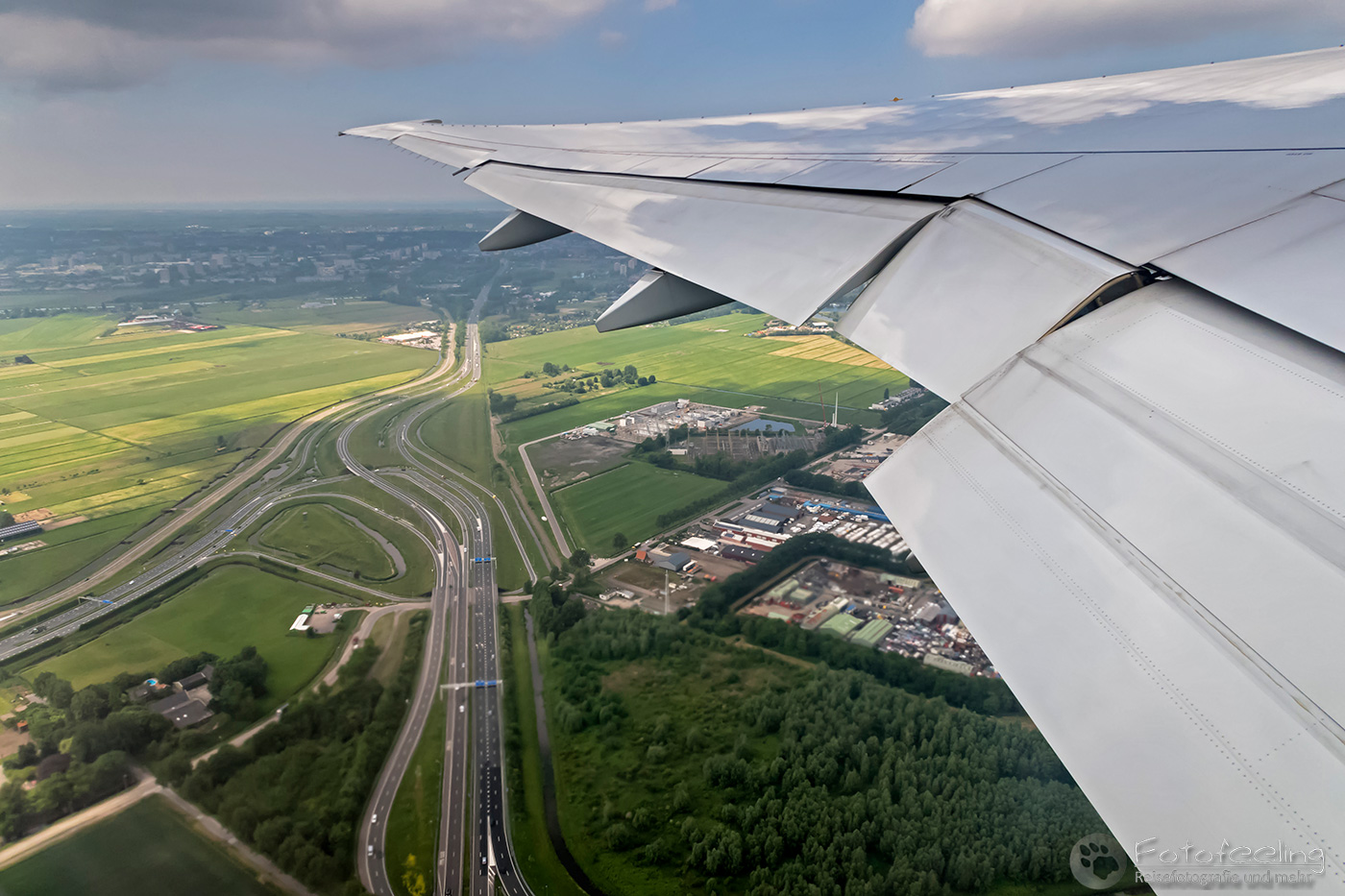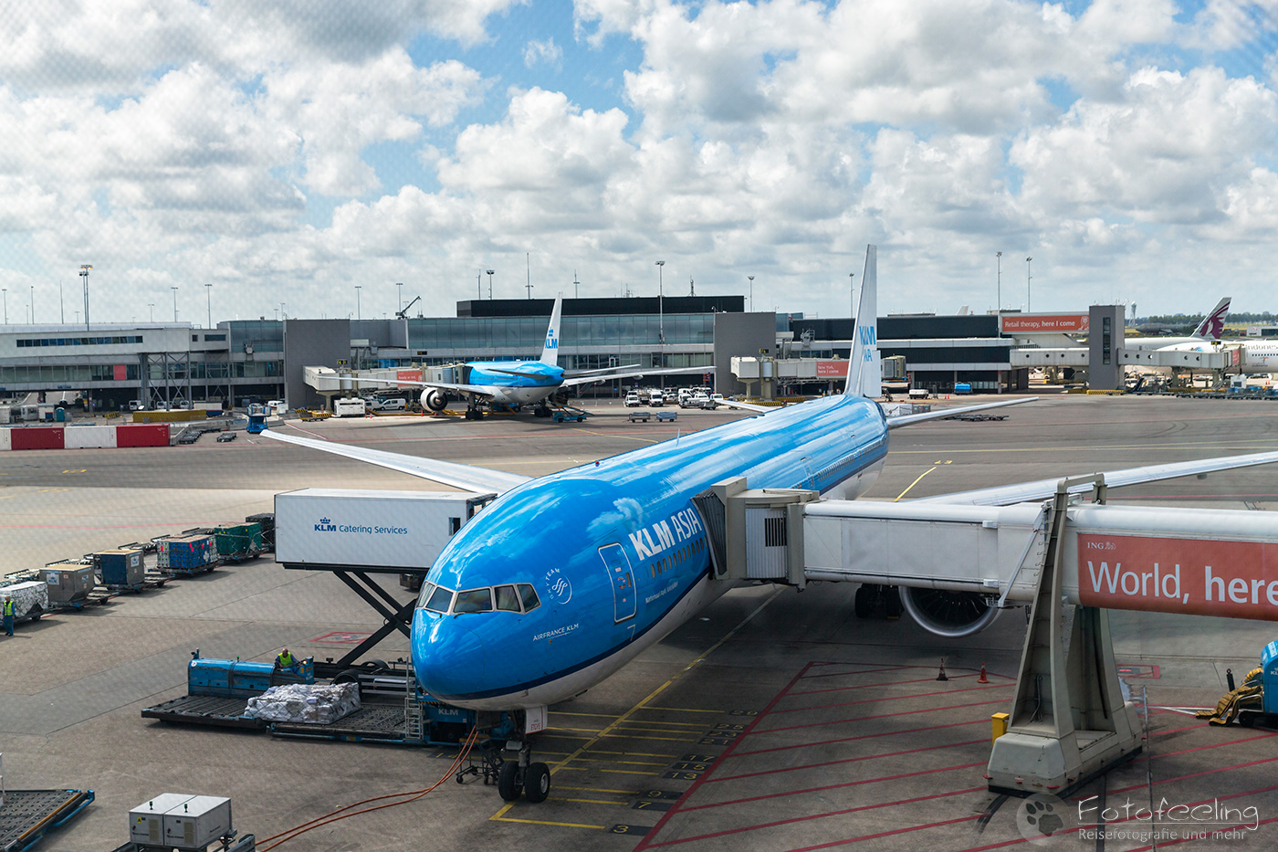 Der Flug nach Amsterdam war kurz und problemlos. Wir landeten auf Gate C und mussten dann auf F6, was wir dank Chris Stechschritt in 15 Minuten schafften. Mit hängenden Zungen „flogen“ wir durch die Passkontrolle und reihten uns in eine sehr lange Schlange vor dem Gate ein. Nach einer weiteren Pass- und Bordkarten-Kontrolle, durften wir in den Flieger, der sehr voll war. Leider hatte er eine 3-4-3er Bestuhlung und als sich ein schmächtiger Asiate lächelnd neben Chris setzte, verflog unsere Hoffnung auf einen freien Sitz. Dummerweise zog der Asiate seine Schuhe aus und ein unangenehmer Geruch zog „lächelnd“ zu uns rüber. Anfangs schaute ich natürlich Chris böse an, der aber vehement verneinte. Zum Glück tat die Klimaanlage bald ihr Bestes und es wurde erträglicher.