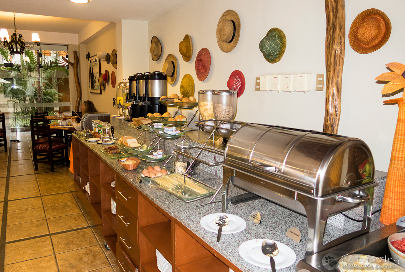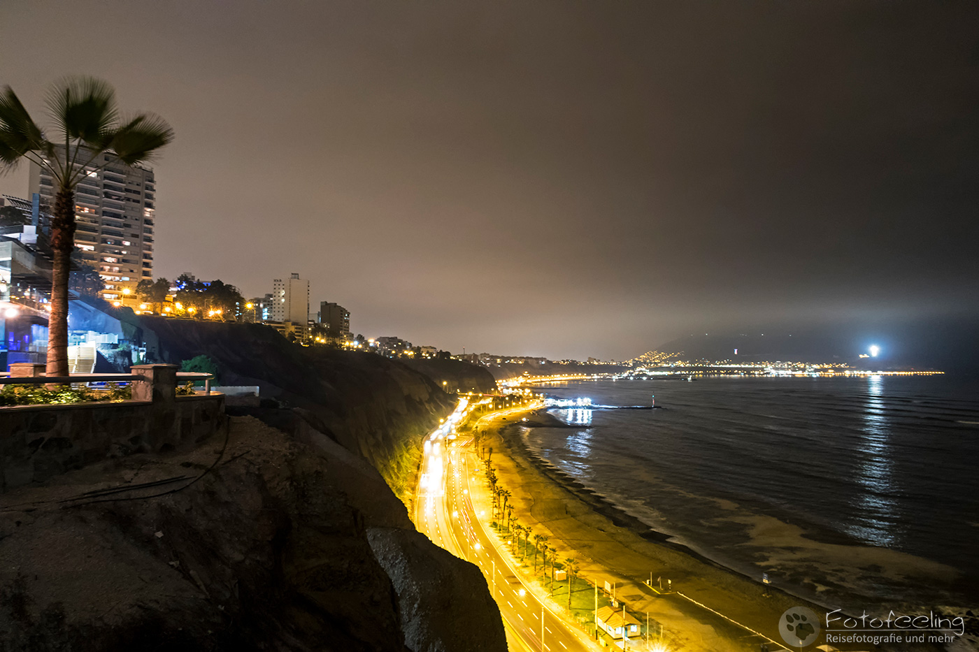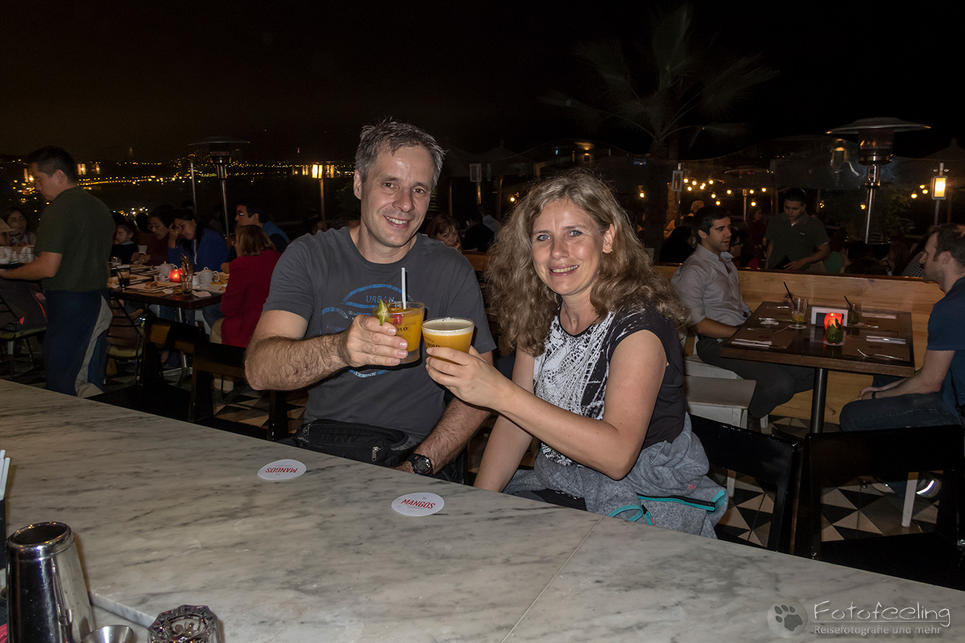 Unser Hotel, das Tierra Viva Miraflores Larco, lag nur ein paar Gehminuten vom Meer entfernt. Wir verstauten schnell unsere Sachen und schon ging es runter ans Wasser. Wir landeten im Einkaufscenter Larcomar, wo es neben sämtlichen teuren Markennamen auch unzählige Restaurants und Fastfood Ketten gibt. Hier hörten wir das Rauschen der Wellen und konnten von der Steilküste auf die darunterliegende Straße und das Meer schauen. Natürlich hatten wir Appetit und so betrachteten wir interessiert die Speisekarten einiger Restaurants. Wir entschieden uns für das Restaurant Mangos und gingen hinein. Zuerst führte uns eine Treppe hinab und dann wieder hinauf. Wir waren schon gespannt, wo wir landen. Einige Plätze waren innen, doch die meisten und schönsten Plätze waren außerhalb in einem kleinen Garten mit Blick hinab von der Steilküste auf das Meer und die Straße. Das Restaurant war absolut voll und uns wurde erst einmal ein Platz an der Bar zugewiesen. Da wir uns schon vor der Reise auf einen Pisco Sour, dem Nationalgetränk Perus gefreut hatten, bestellten wir sogleich zwei Varianten mit Mango und Maracuja und verkürzten uns die Wartezeit. Nach ca. 15 Minuten bekamen wir einen tollen Tisch ganz am Rand des kleinen Gartens zugewiesen. Hier waren wir fast alleine und hatten eine umwerfende Aussicht auf die Steilküste und das Meer. Natürlich aßen wir nach Jahren des Entzugs endlich wieder Ceviche (kleingeschnittener, roher Fisch, der ca. 15 Minuten in Limettensaft mariniert wird) und ein weiteres bekanntes Gericht Perus, das Lomo Saltado (ein Pfannengericht aus zartem Rindfleisch, Tomaten, Zwiebeln, Reis und Kartoffeln). Das war richtig lecker und eine super Einstimmung auf unseren Urlaub.