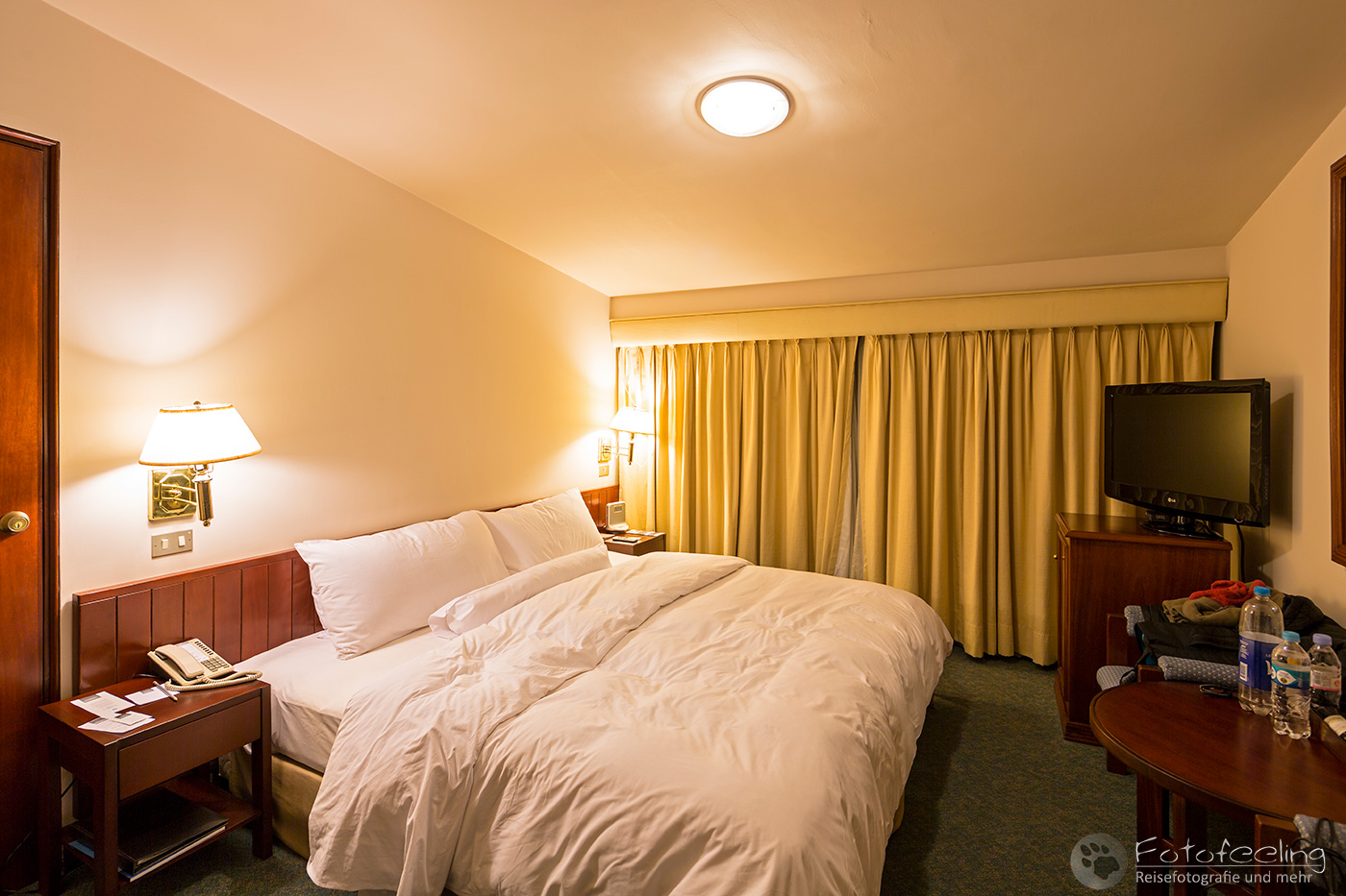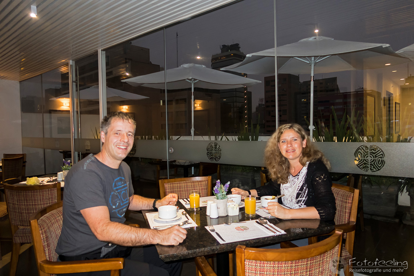 Als wir aus dem Zoll kamen, wartete schon unser Fahrer auf uns. Während wir ins Hotel fuhren, erzählte er uns einiges zu Lima, den Straßenverhältnissen und Peru. Als wir nach der Sicherheitslage fragten, erklärte er uns, dass es Viertel gibt, in die kein Tourist gehen sollte, aber Miraflores und auch das alte Stadtzentrum seien dagegen sehr sicher. Das klang ja schon mal sehr gut und die Sorgen der letzten Tage verblassten langsam. Um ca. 19.00 Uhr waren wir in unserem Hotel, trotzdem die Fahrt durch Lima ganz schön heftig war. Aus zwei Spuren wurden schnell mal Vier, ständig hupte jemand und der Stärkere setzte sich immer gnadenlos durch. Chris war heilfroh, dass er an diesem ersten Tag noch nicht fahren musste.