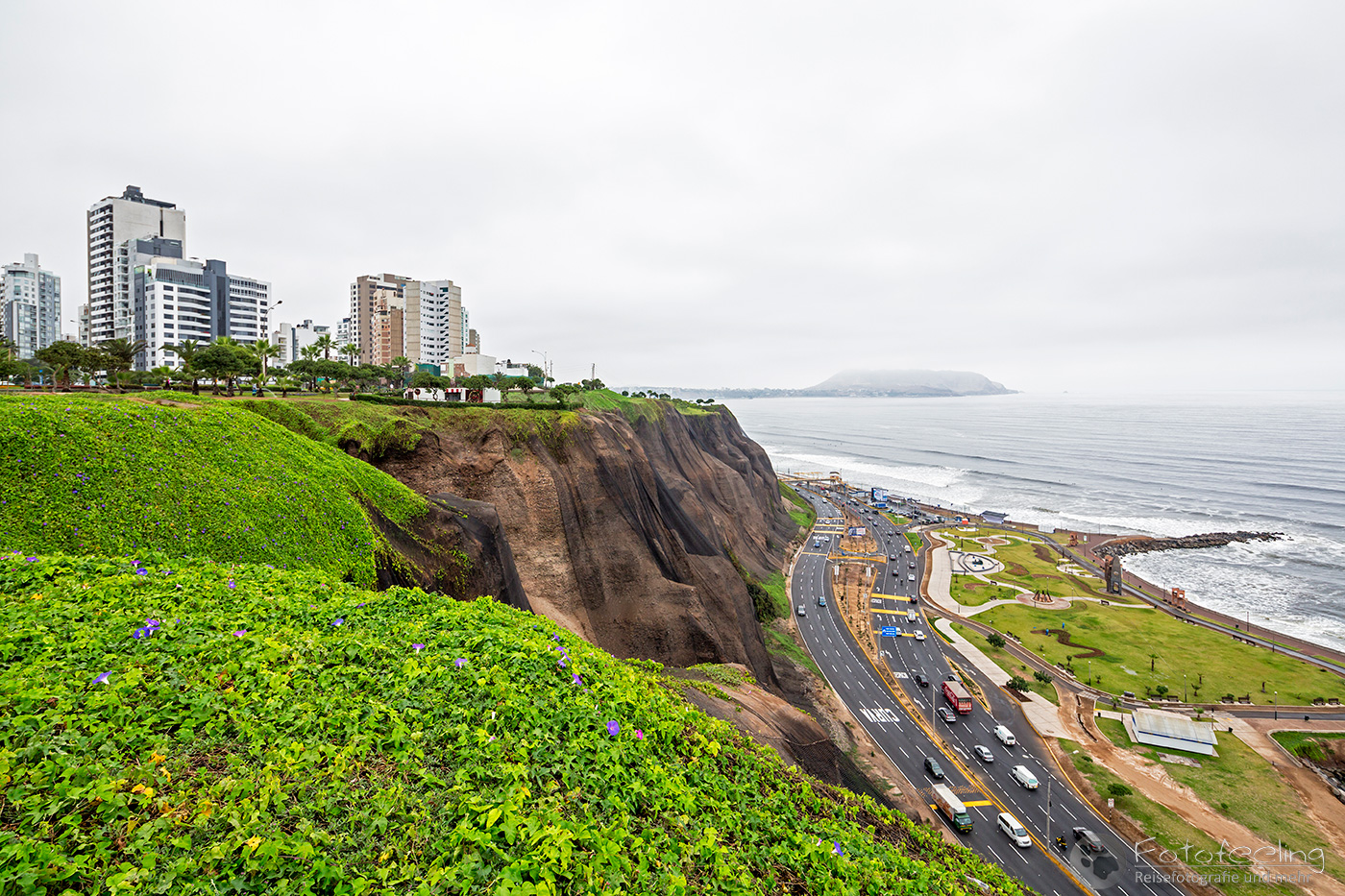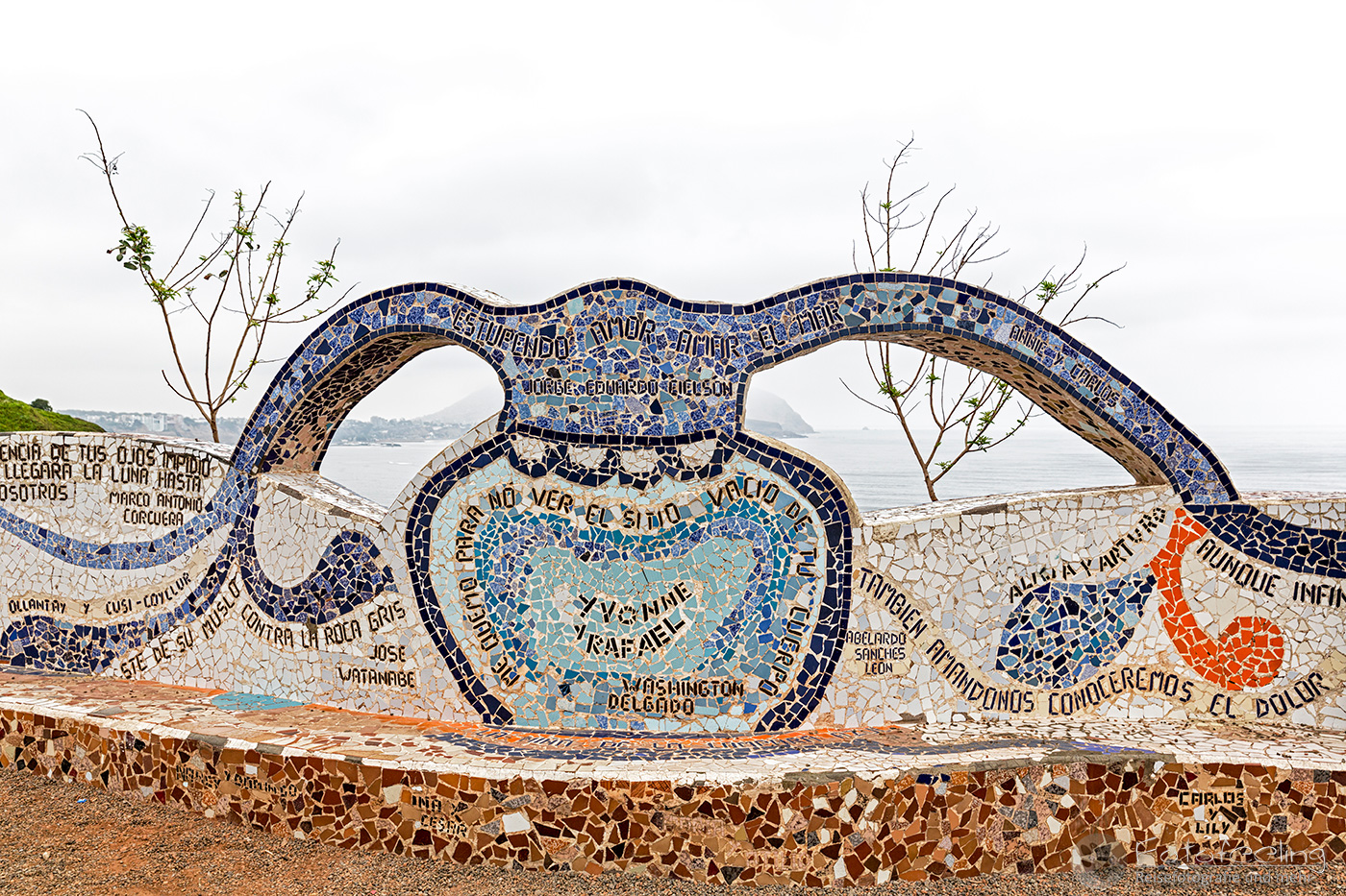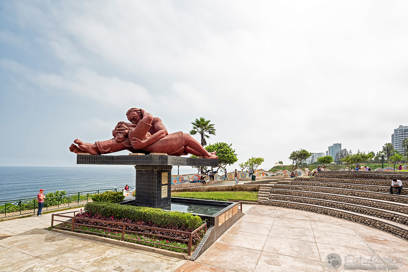 Nach einer gut durchschlafenen Nacht saßen wir am Morgen um 6.00 Uhr beim Frühstück. Es war sehr kühl und heftiger Küstennebel ließ uns gerade noch so die Umrisse der Nachbarhäuser erkennen. Das Buffet war gut und der Kaffee super. Besonders die kleinen Semmeln schmeckten klasse und die frischen Fruchtsäfte waren sehr gut. So konnte der Tag beginnen und gut gestärkt wanderten wir zum Miraflores Boardwalk an die Küste vor. An der Steilküste reiht sich ein Park an den anderen, so kann man einige Kilometer durch schöne Parkanlagen wandern oder auch joggen. Immer wieder gibt es Fitnessgeräte und etliche sportliche Südamerikaner kamen uns walkend und joggend entgegen. Gepflegter Rasen, Blumen, Palmen und andere grüne Bäume bestimmen hier das Bild. Fleißige Parkmitarbeiter halten die Anlagen sauber und kümmern sich um den Müll und die Pflanzen. Alles ist sehr sauber und ordentlich. Besonders gut gefiel uns der Parque del Amor (Park der Liebenden) mit seiner riesigen roten Skulptur eines küssenden Paares mit dem Namen El Peso (Der Kuss) von Victor Delfin, die von einer gewellten Mauer mit Trencadis-Mosaik, in die Sitzplätze eingearbeitet sind, umrahmt wird. Überall stehen schöne Sprüche, wie z.B. „Liebe ist das Licht des Lebens”.