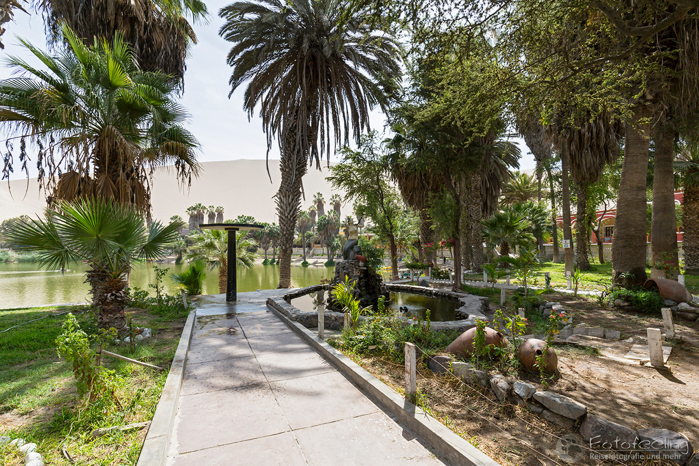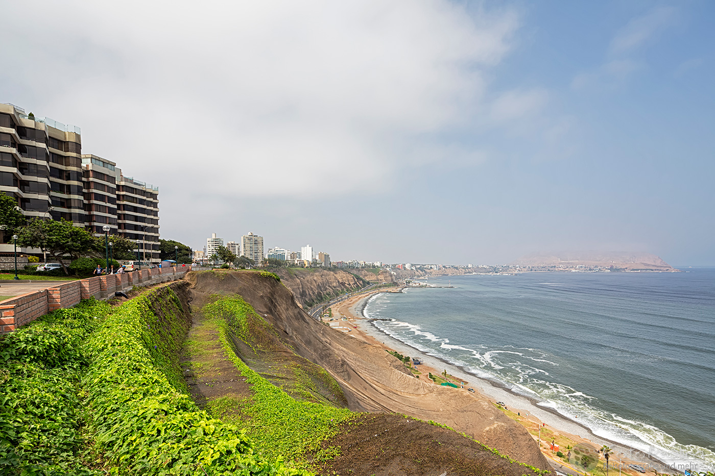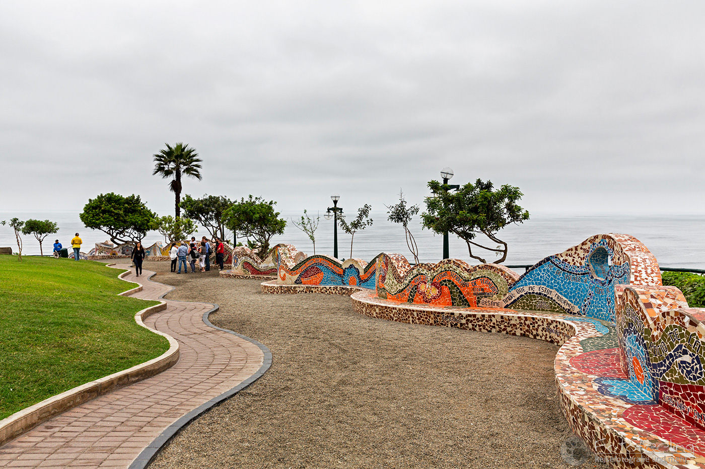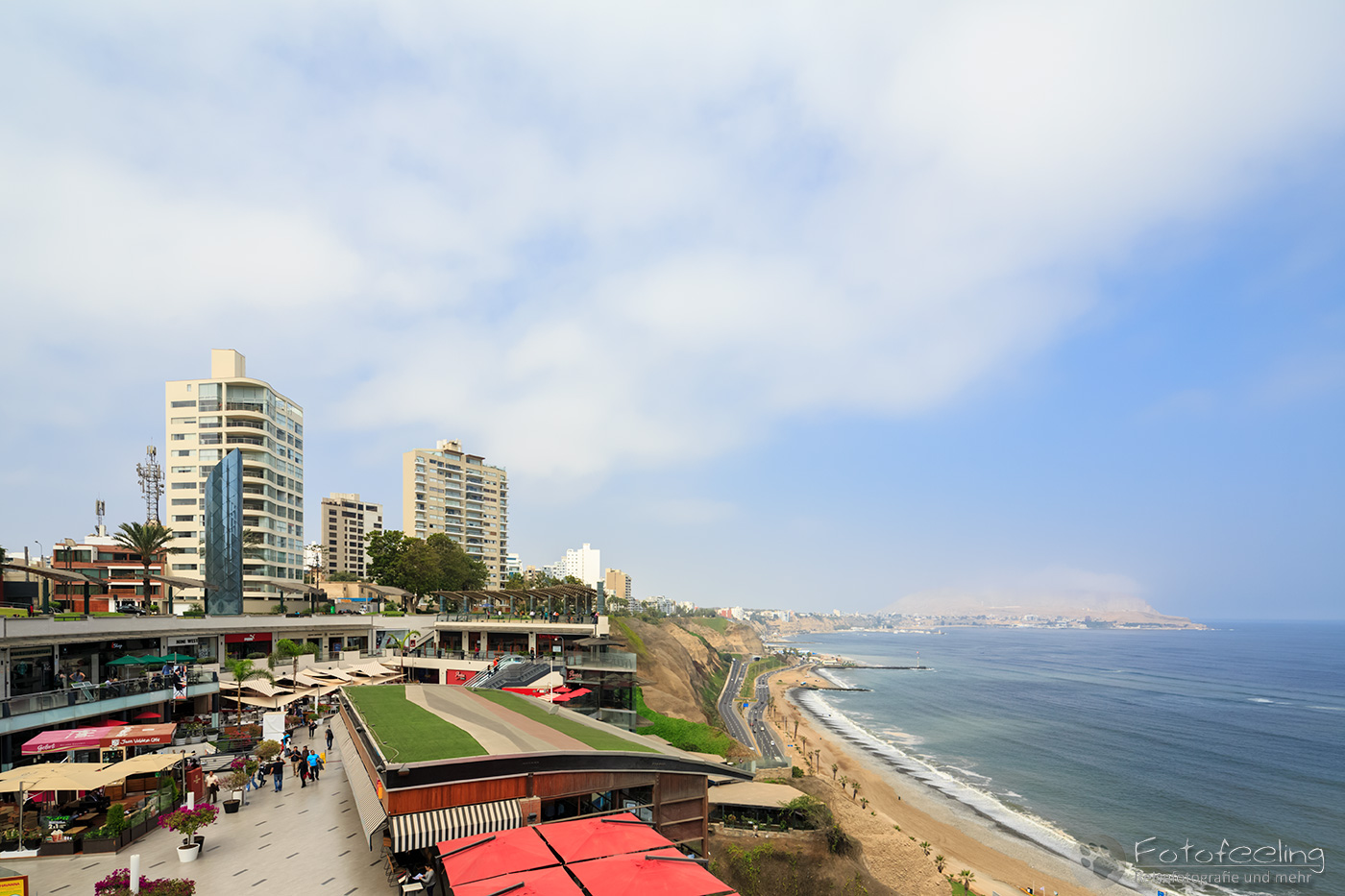 Nach einer gut durchschlafenen Nacht saßen wir am Morgen um 6.00 Uhr beim Frühstück. Es war sehr kühl und heftiger Küstennebel ließ uns gerade noch so die Umrisse der Nachbarhäuser erkennen. Das Buffet war gut und der Kaffee super. Besonders die kleinen Semmeln schmeckten klasse und die frischen Fruchtsäfte waren sehr gut. So konnte der Tag beginnen und gut gestärkt wanderten wir zum Miraflores Boardwalk an die Küste vor. An der Steilküste reiht sich ein Park an den anderen, so kann man einige Kilometer durch schöne Parkanlagen wandern oder auch joggen. Immer wieder gibt es Fitnessgeräte und etliche sportliche Südamerikaner kamen uns walkend und joggend entgegen. Gepflegter Rasen, Blumen, Palmen und andere grüne Bäume bestimmen hier das Bild. Fleißige Parkmitarbeiter halten die Anlagen sauber und kümmern sich um den Müll und die Pflanzen. Alles ist sehr sauber und ordentlich. Besonders gut gefiel uns der Parque del Amor (Park der Liebenden) mit seiner riesigen roten Skulptur eines küssenden Paares mit dem Namen El Peso (Der Kuss) von Victor Delfin, die von einer gewellten Mauer mit Trencadis-Mosaik, in die Sitzplätze eingearbeitet sind, umrahmt wird. Überall stehen schöne Sprüche, wie z.B. „Liebe ist das Licht des Lebens”.