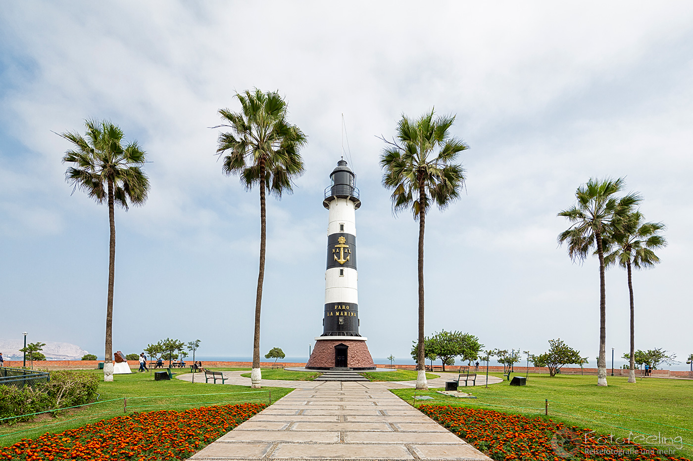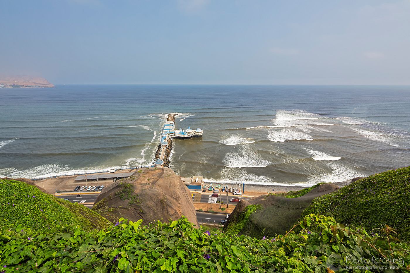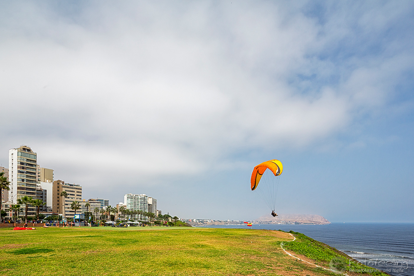 Immer wieder wanderte unser Blick hinab zum Pazifik, wo sich große Wellen am Strand brachen. Wir entdeckten das bekannte Gourmetrestaurant „La Rosa Nautica”, das in einem Pavillon auf Stelzen am Ende eines langen Piers im Meer steht. Die Steilküste ist einfach toll. Durch den Nebel wachsen auf den Felsen allerhand grüne Pflanzen und es gibt immer wieder Treppen hinab zum Meer. So schlenderten wir bis zum Parque El Faro (Leuchtturm Park) vor. Schon von weitem erblickt man den Leuchtturm. Auch diese Parkanlage ist sehr gepflegt. Unterwegs sahen wir den Start und Landeplatz der Paraglider von Lima, wo wir etwas später einen jungen Burschen beim Testflug beobachten konnten. Es sah einfach spektakulär aus, wie er mit seinem Gleitschirm über der Steilküste glitt und wieder punktgenau auf dem Rasen landete. Die Zeit verging wie im Fluge. Im Laufe des Vormittags sammelten sich auch immer mehr Menschen an, die einen trieben Sport, andere spazierten, so wie wir und wieder andere arbeiteten. Wir beobachteten einen Hundesitter, der mit ca. 10 Hunden unterwegs war. Es war unglaublich wie gut die Hunde hörten und er trainierte sie weiter. So saßen alle Hunde auf ihnen zugewiesenen Plätzen und nur der von ihm angesprochene reagierte auf sein Kommando. Natürlich gab es dafür eine Streicheleinheit bzw. ein Leckerli. So konnte er auch eine große Hundegruppe steuern und wie es aussah, hatten die Hunde auch noch ihren Spaß.