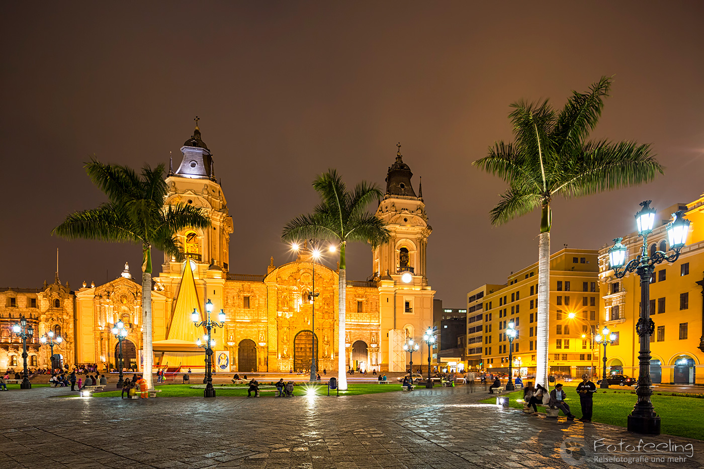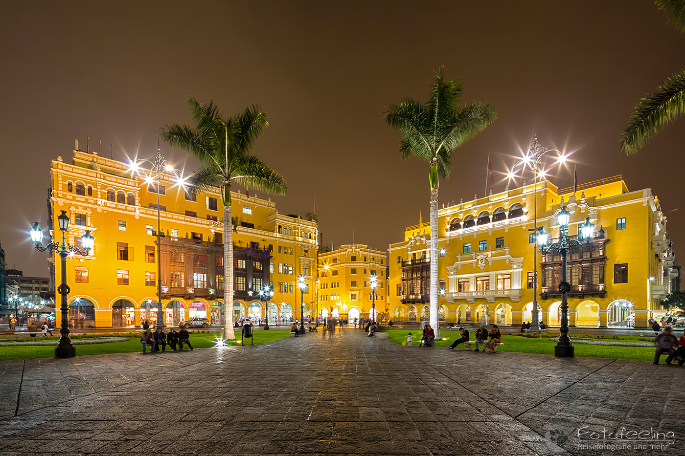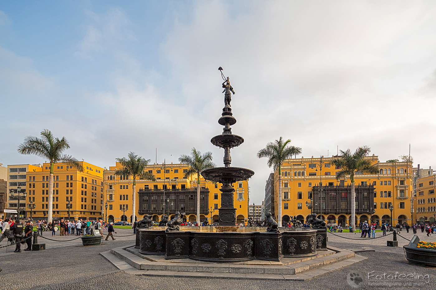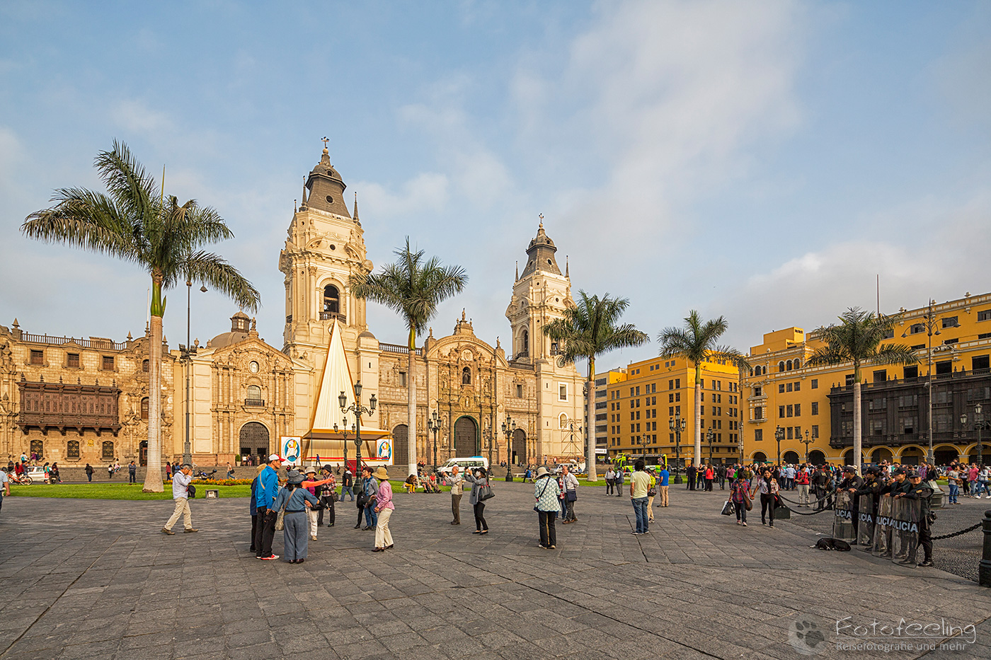 Am späten Nachmittag brachte uns ein Taxi zur Plaza de Armas im alten Stadtviertel Limas ca. 7 km von Miraflores entfernt. Über eine mehrspurige Schnellstraße kamen wir zügig dorthin. Die Plaza besteht aus einem sehr gepflegten Platz mit schönen Häusern im Kolonialstil, dem Präsidentenpalast und der Kathedrale von Lima. Wir fotografierten ein wenig und kamen an eine Brücke, über die es ins angrenzende Armenviertel von Lima ging. Obwohl wir es zu diesem Zeitpunkt nicht wussten, blieben wir beide stehen und kehrten um, was wohl eine gute Entscheidung war, denn nicht selten werden hier Touristen ihres Geldes entledigt. Doch davon lasen wir jedoch erst später. An diesem Nachmittag gingen wir zurück und schlenderten durch die Einkaufspassage, wo wir in einem Starbucks Café Rast machten und auf die Dämmerung warteten.