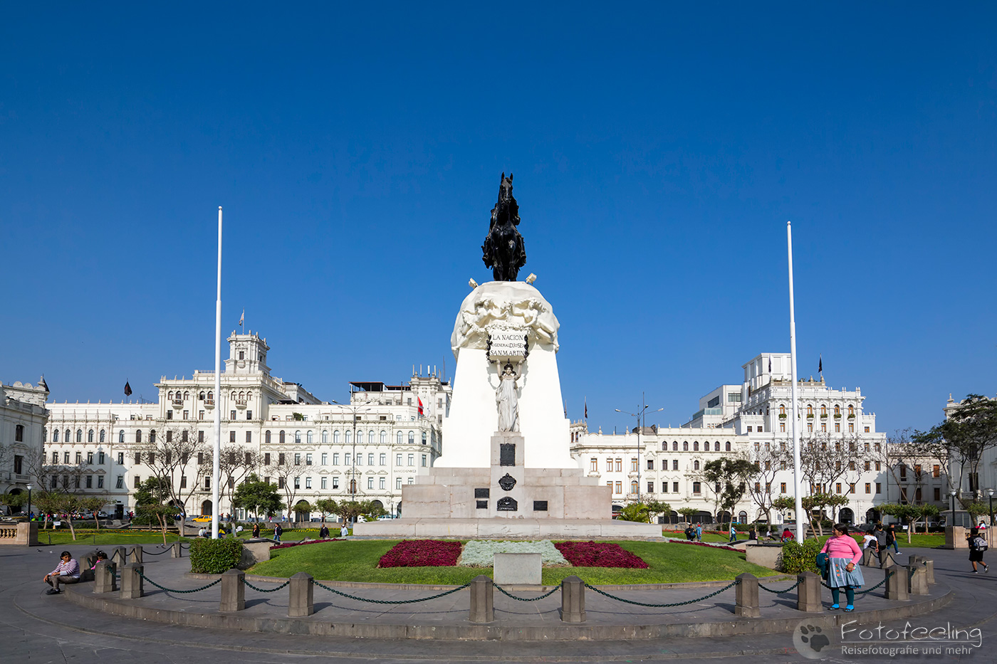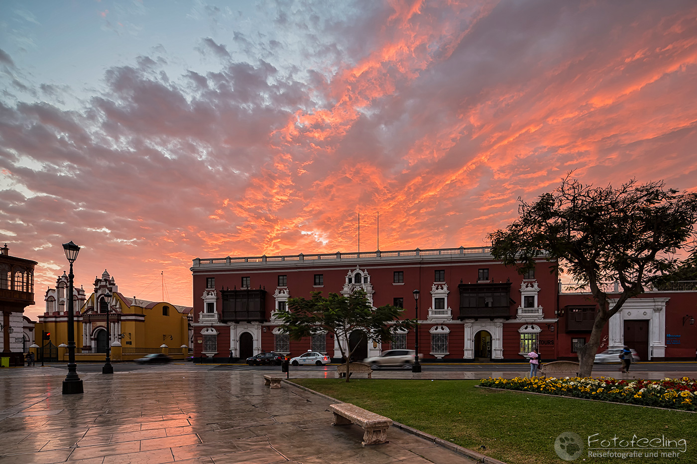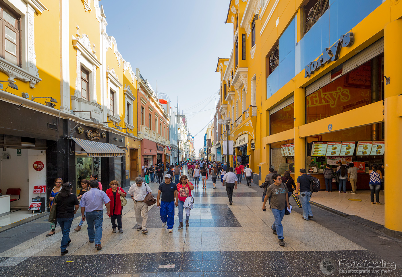 Am späten Nachmittag brachte uns ein Taxi zur Plaza de Armas im alten Stadtviertel Limas ca. 7 km von Miraflores entfernt. Über eine mehrspurige Schnellstraße kamen wir zügig dorthin. Die Plaza besteht aus einem sehr gepflegten Platz mit schönen Häusern im Kolonialstil, dem Präsidentenpalast und der Kathedrale von Lima. Wir fotografierten ein wenig und kamen an eine Brücke, über die es ins angrenzende Armenviertel von Lima ging. Obwohl wir es zu diesem Zeitpunkt nicht wussten, blieben wir beide stehen und kehrten um, was wohl eine gute Entscheidung war, denn nicht selten werden hier Touristen ihres Geldes entledigt. Doch davon lasen wir jedoch erst später. An diesem Nachmittag gingen wir zurück und schlenderten durch die Einkaufspassage, wo wir in einem Starbucks Café Rast machten und auf die Dämmerung warteten.