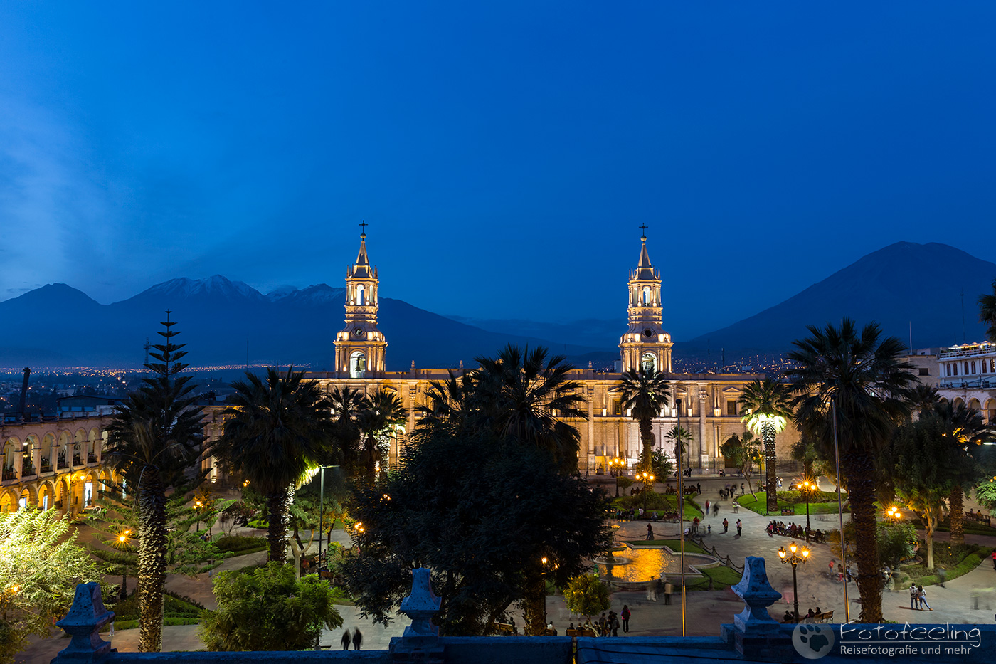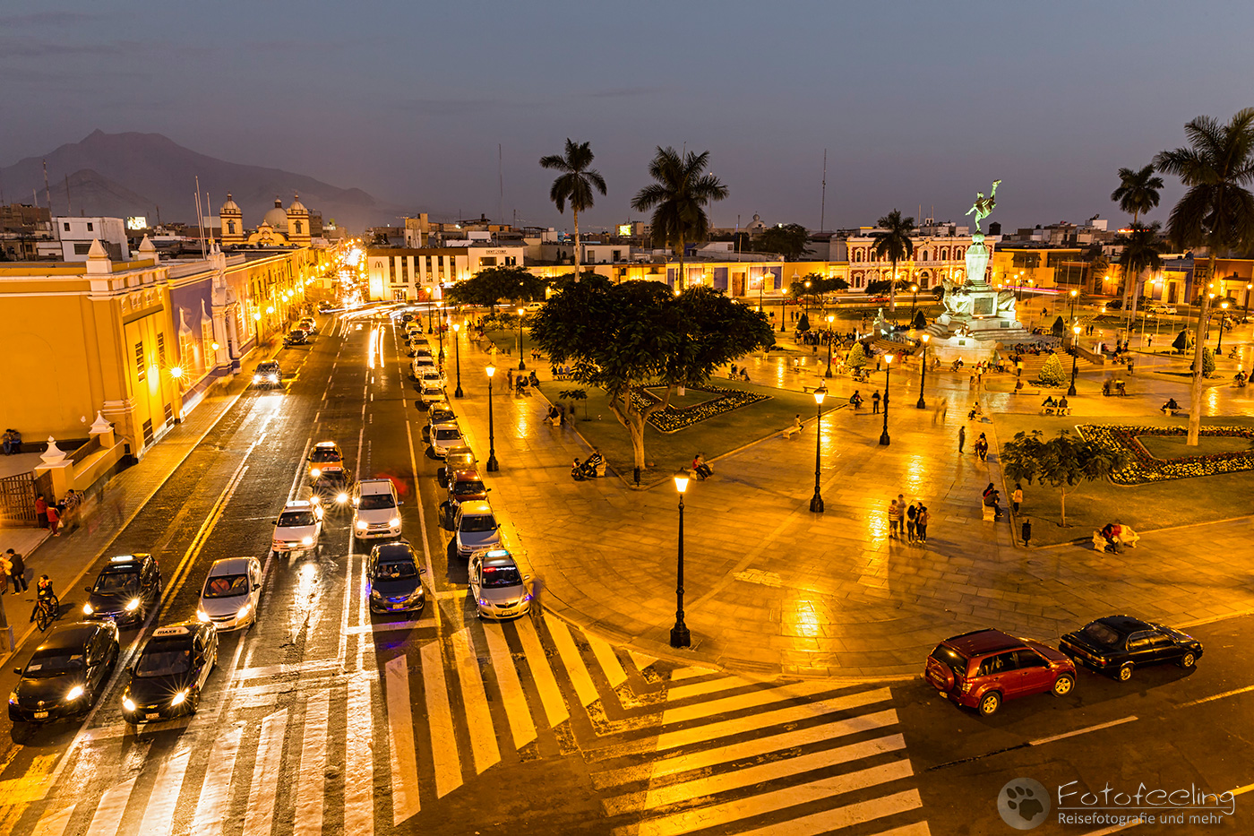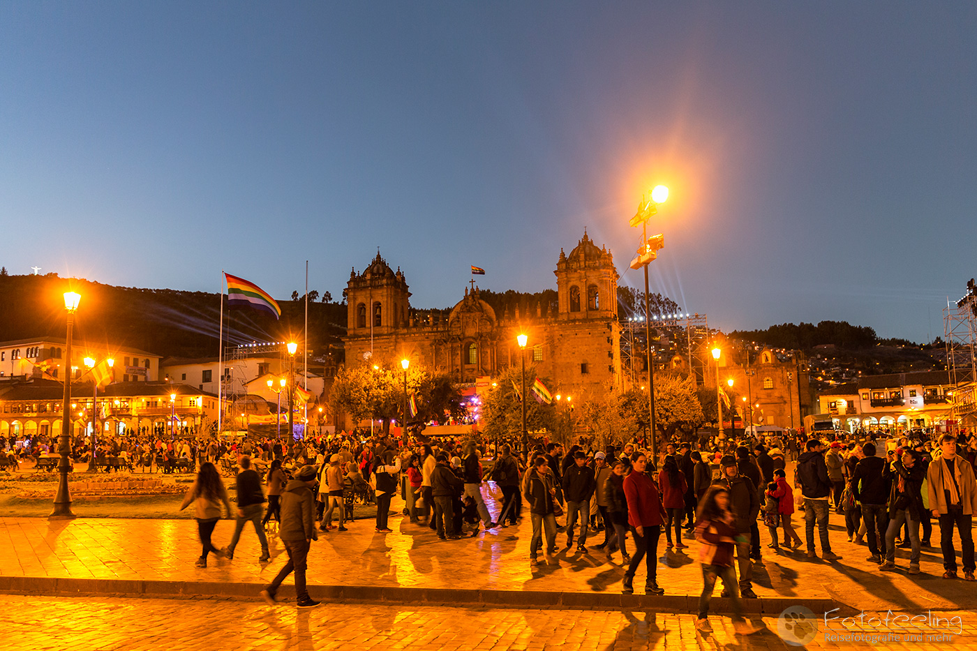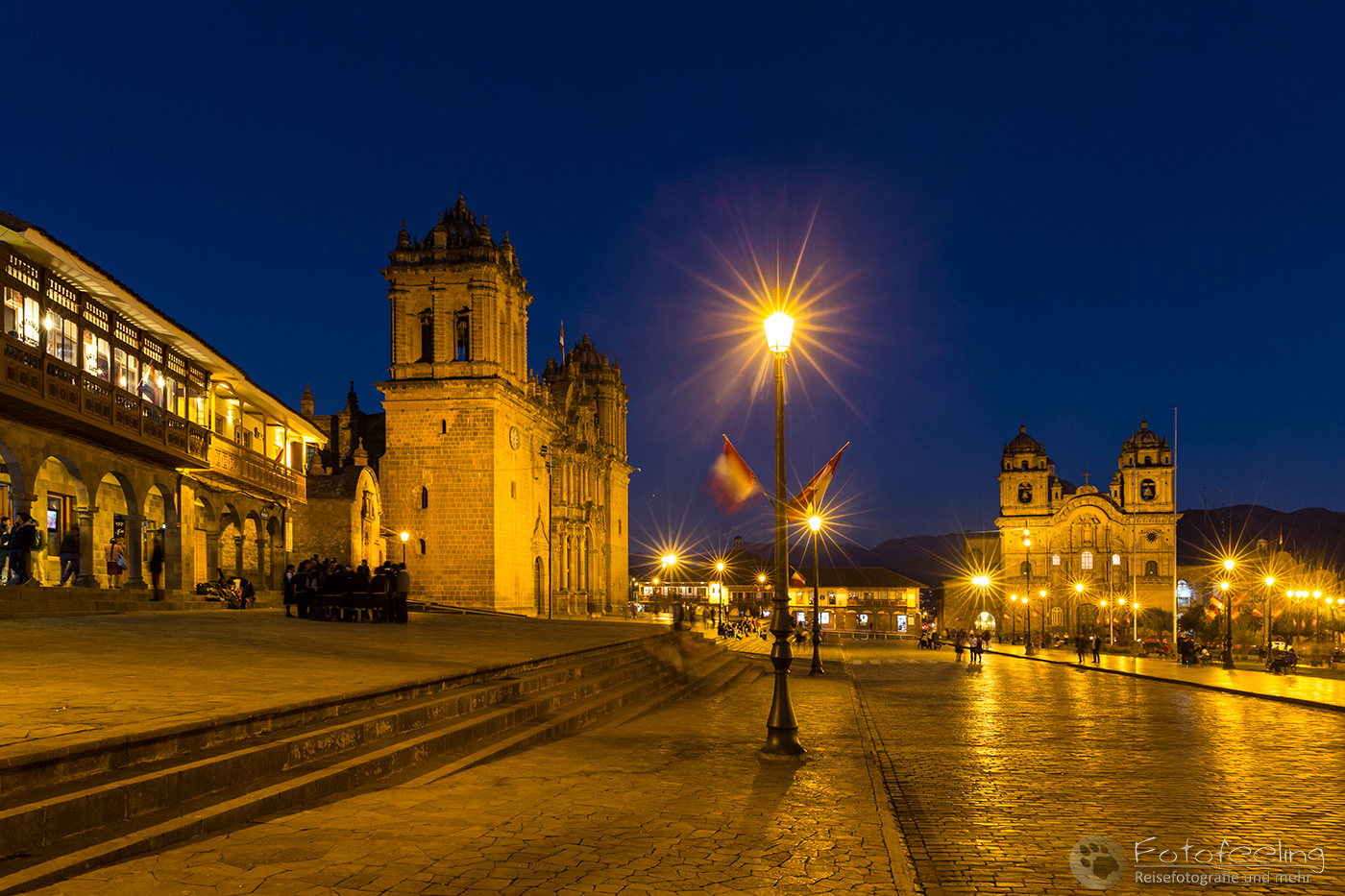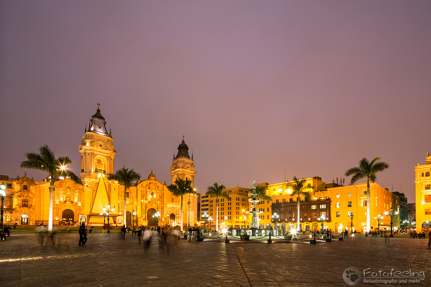 Die blaue Stunde verbrachten wir auf der Plaza de Armas. Es war wie immer ein besonders schönes Schauspiel als die Lichter angingen und die Gebäude im Licht der Dämmerung beschienen.