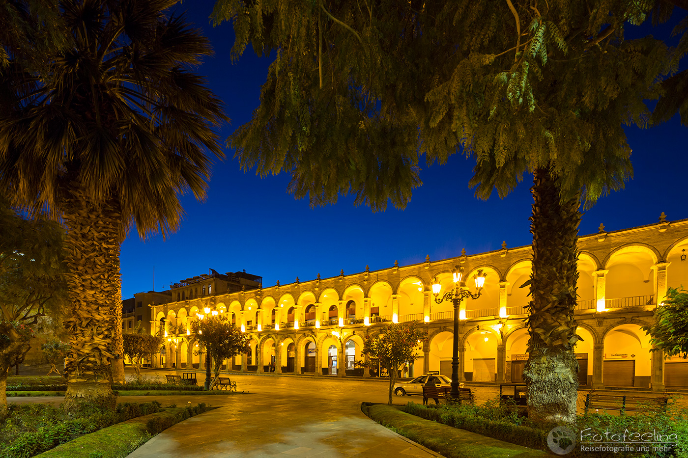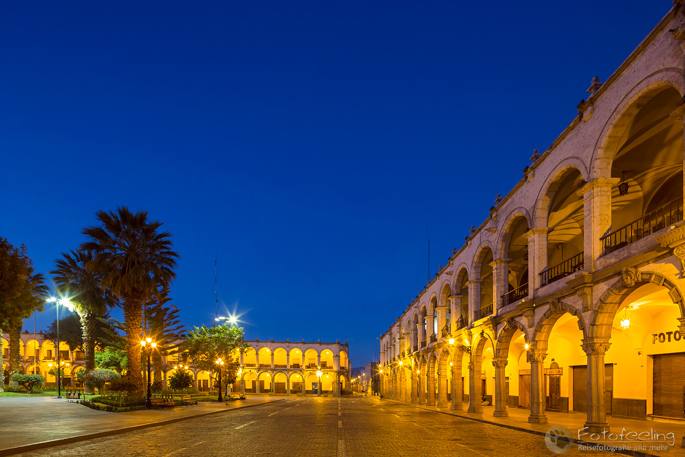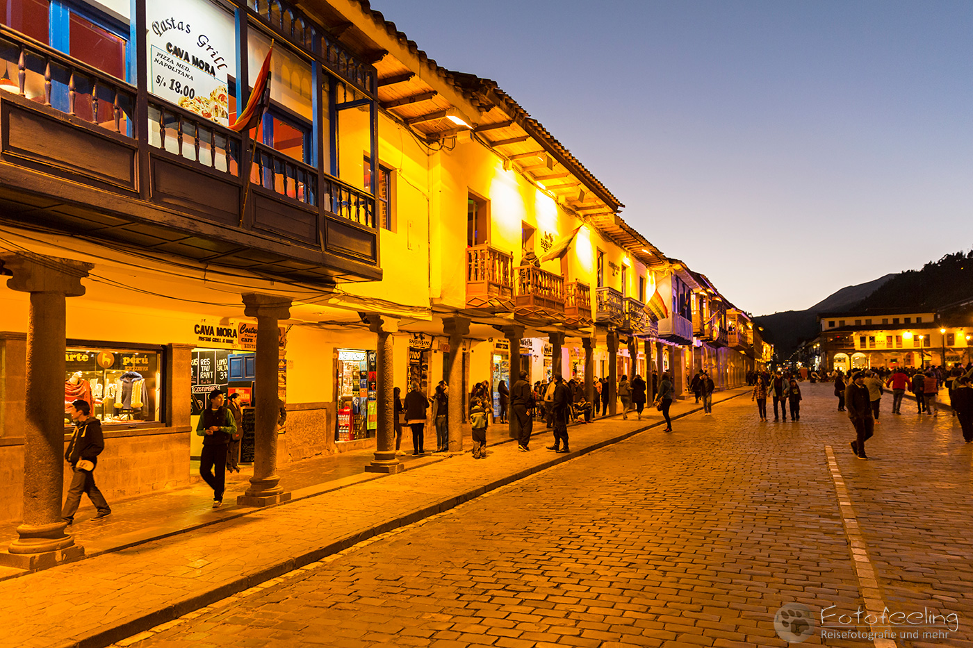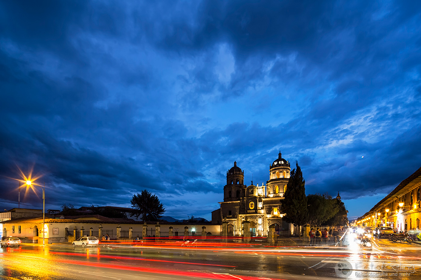 Die blaue Stunde verbrachten wir auf der Plaza de Armas. Es war wie immer ein besonders schönes Schauspiel als die Lichter angingen und die Gebäude im Licht der Dämmerung beschienen.