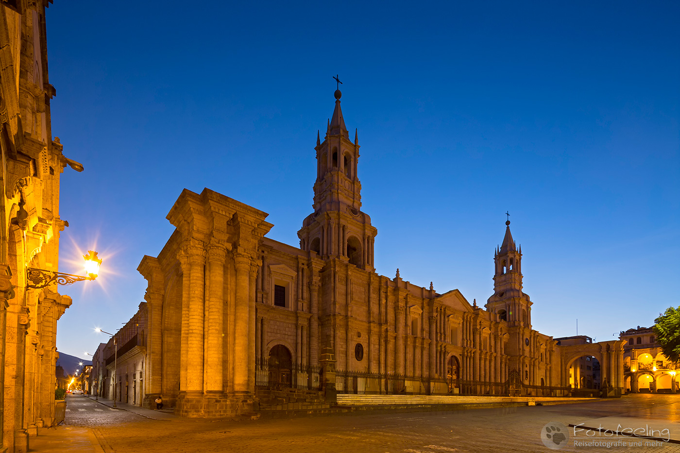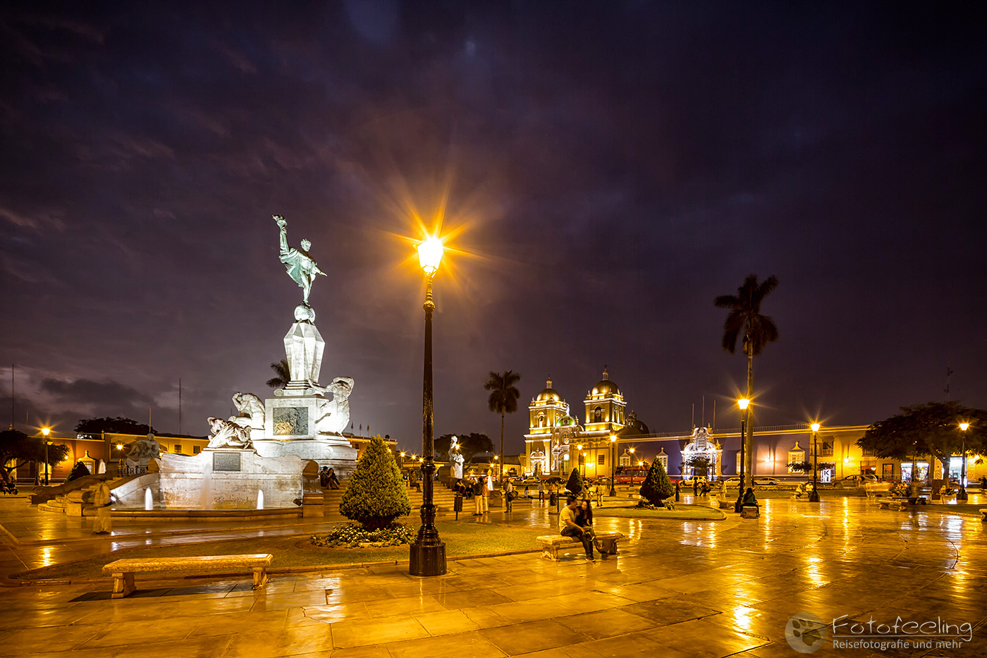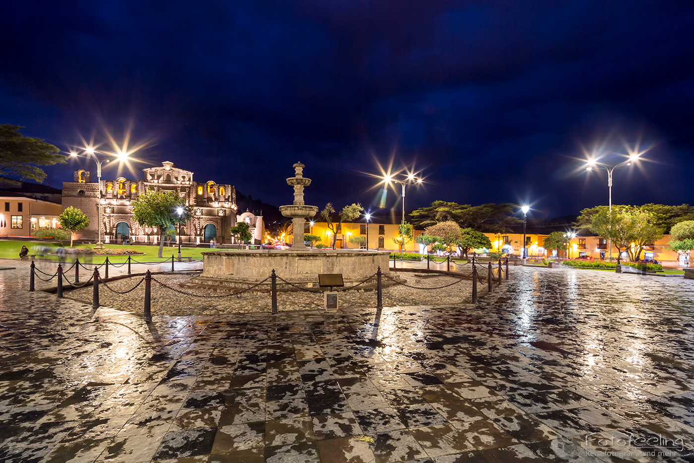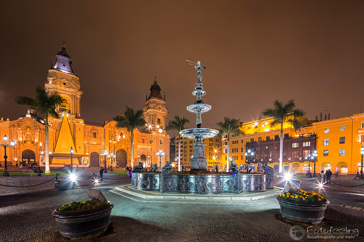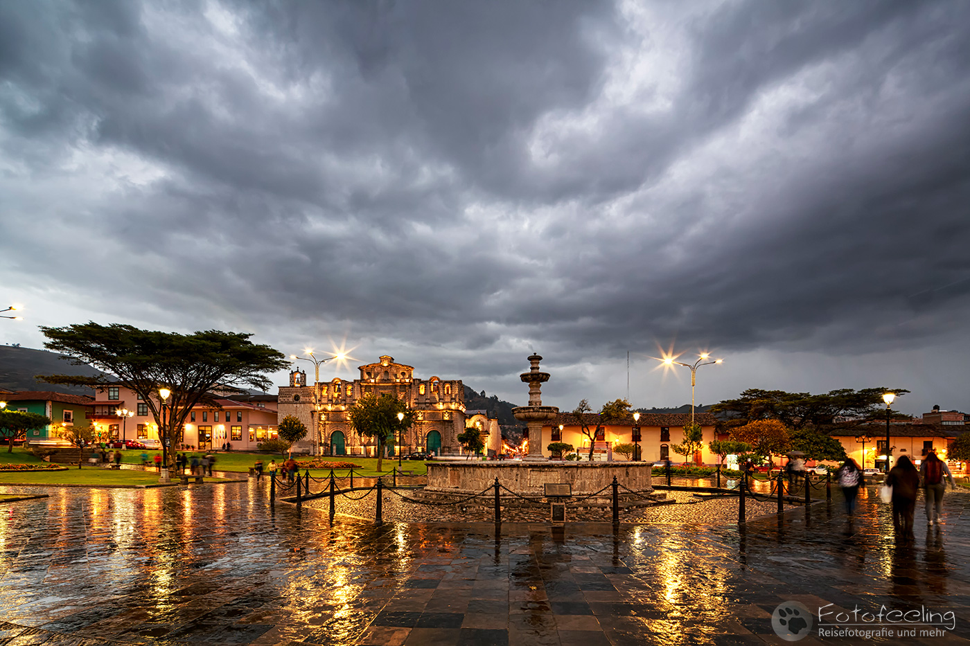 Die blaue Stunde verbrachten wir auf der Plaza de Armas. Es war wie immer ein besonders schönes Schauspiel als die Lichter angingen und die Gebäude im Licht der Dämmerung beschienen.