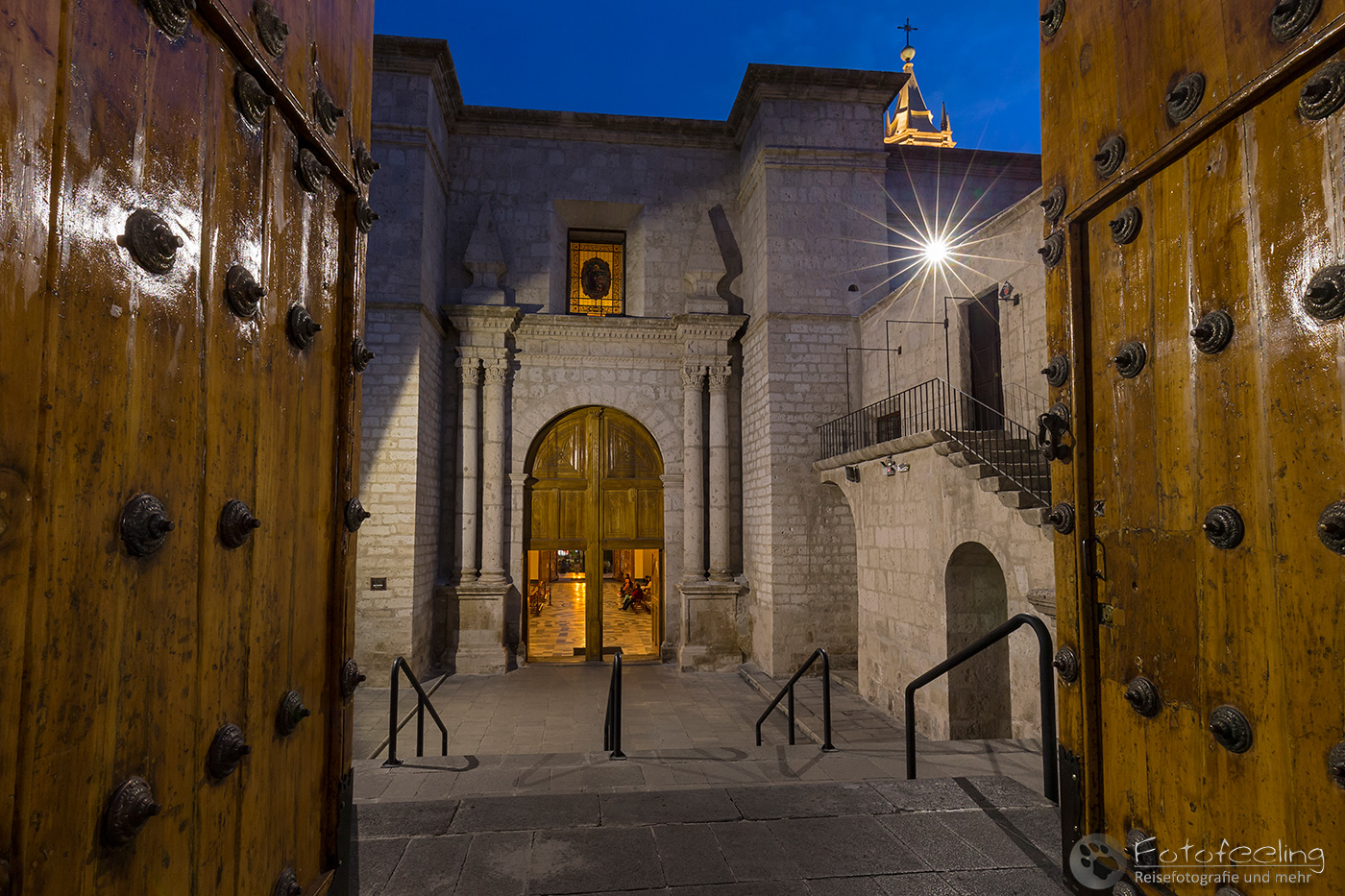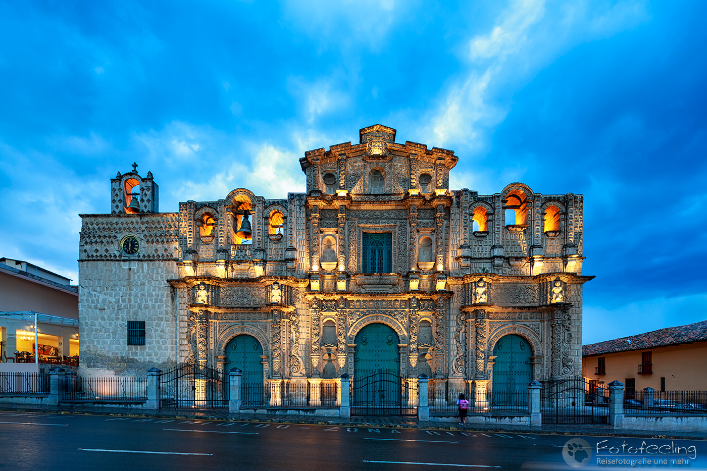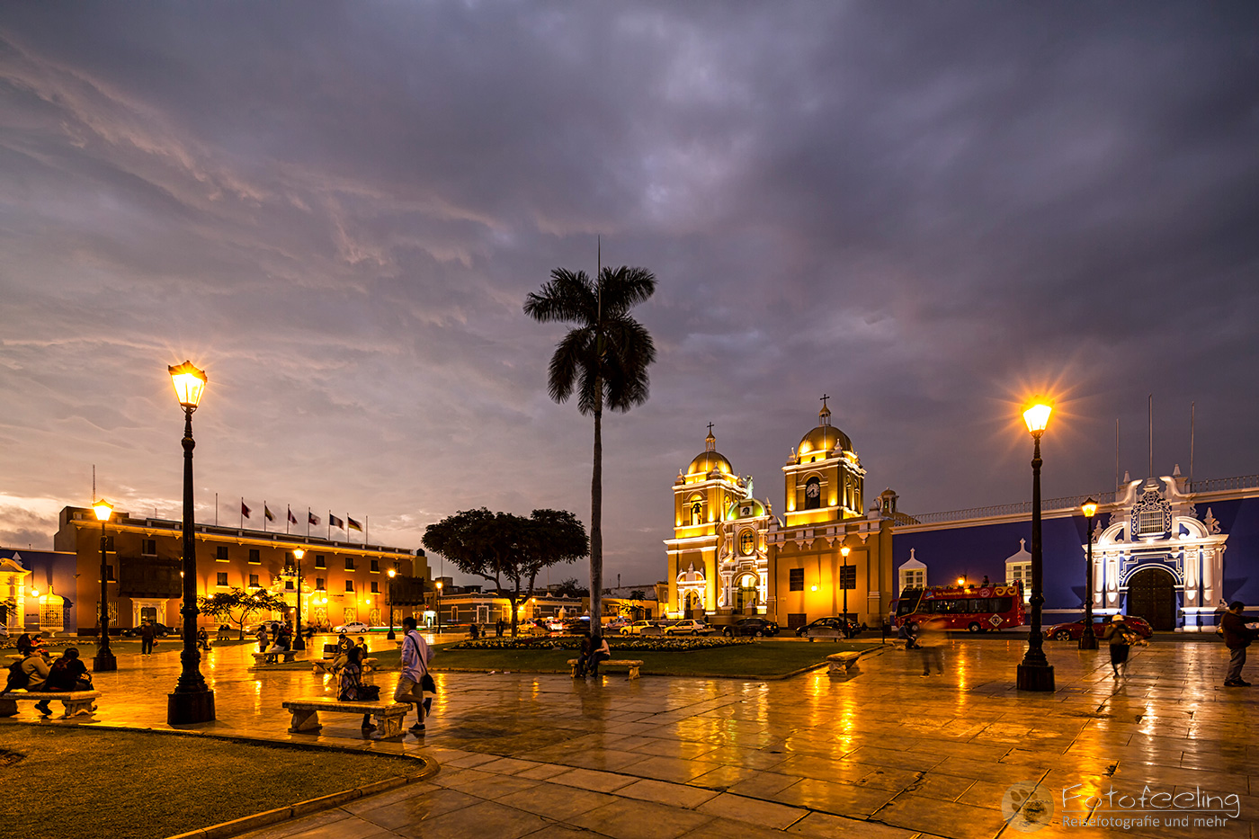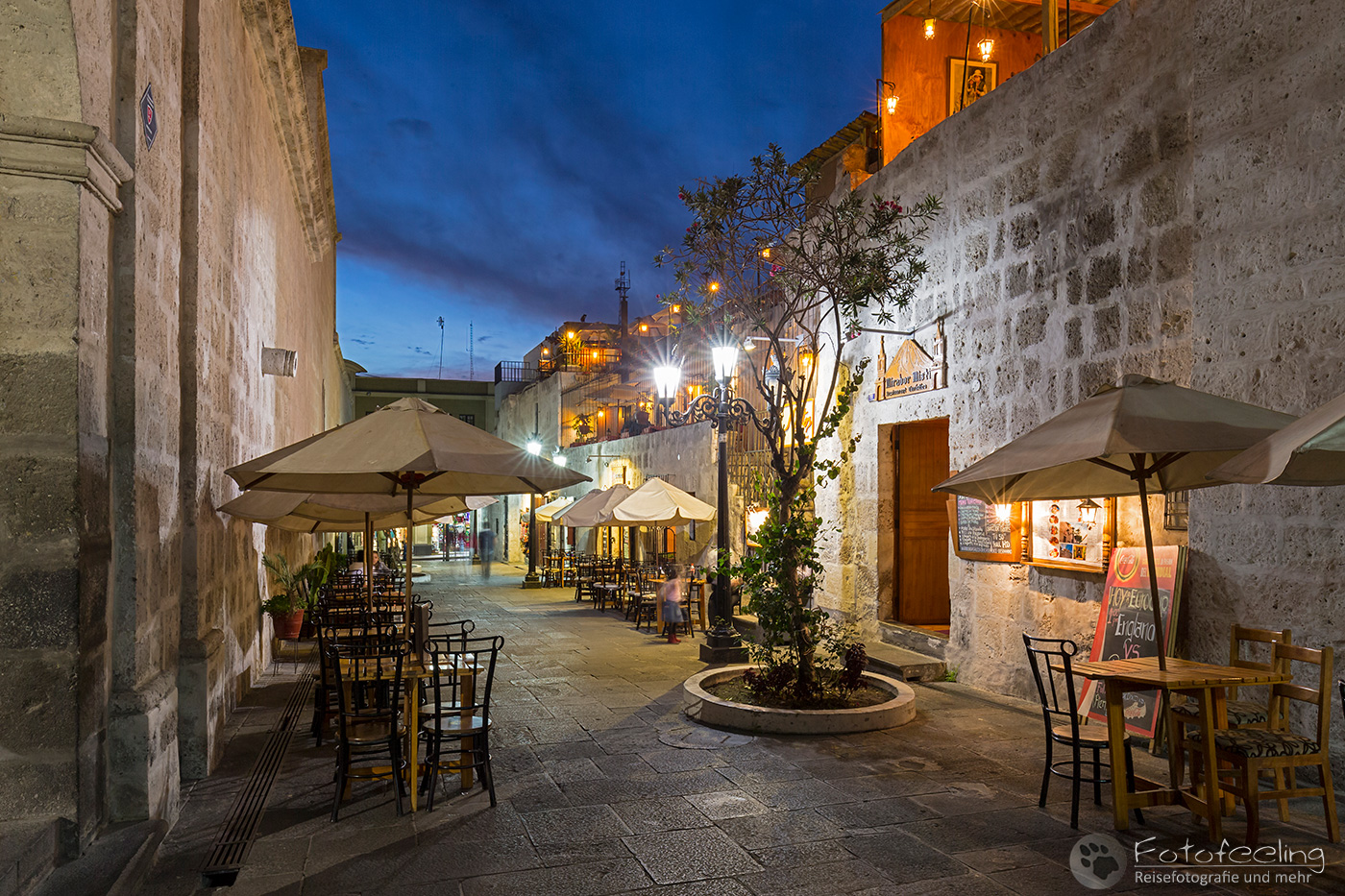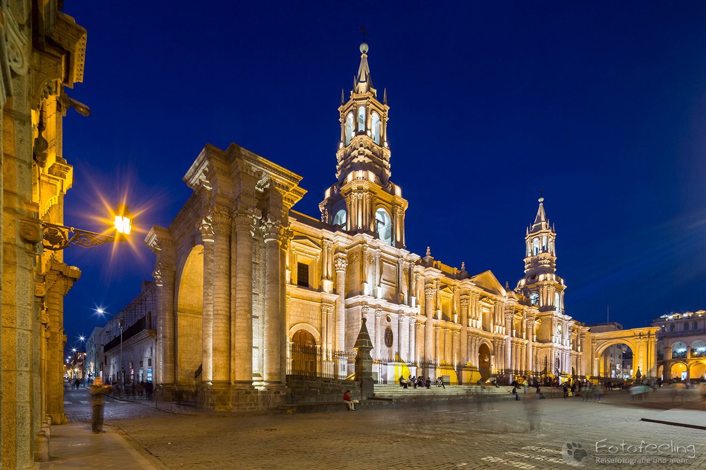 Die blaue Stunde verbrachten wir auf der Plaza de Armas. Es war wie immer ein besonders schönes Schauspiel als die Lichter angingen und die Gebäude im Licht der Dämmerung beschienen.