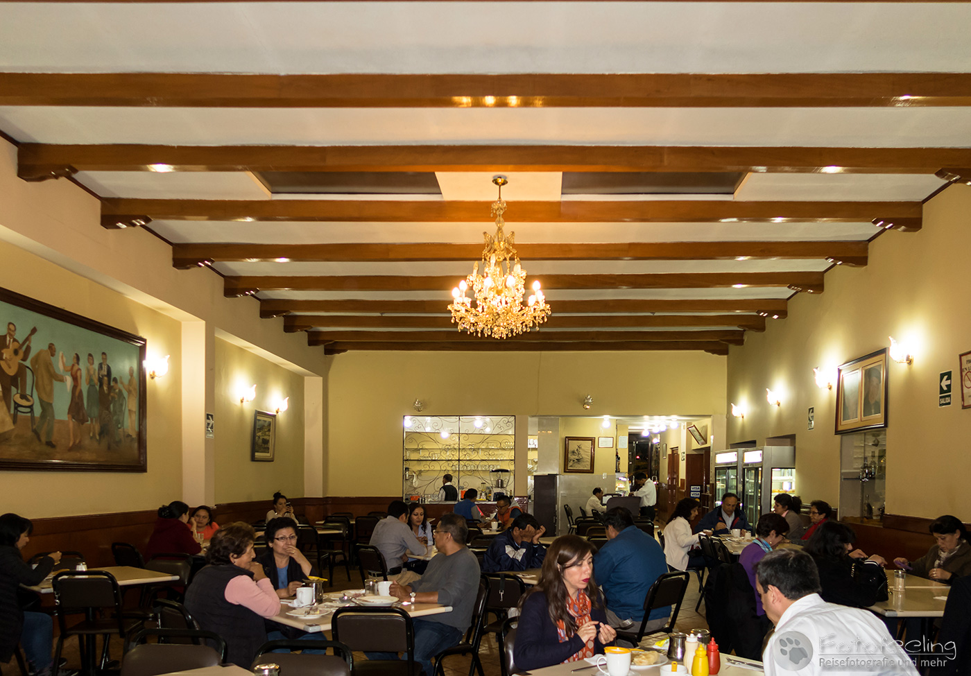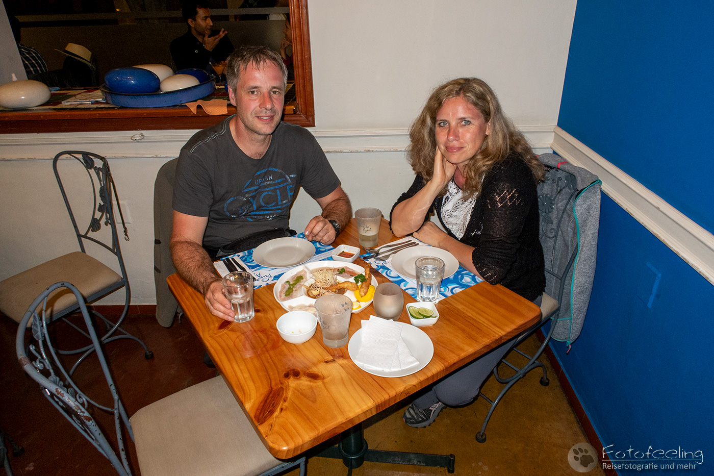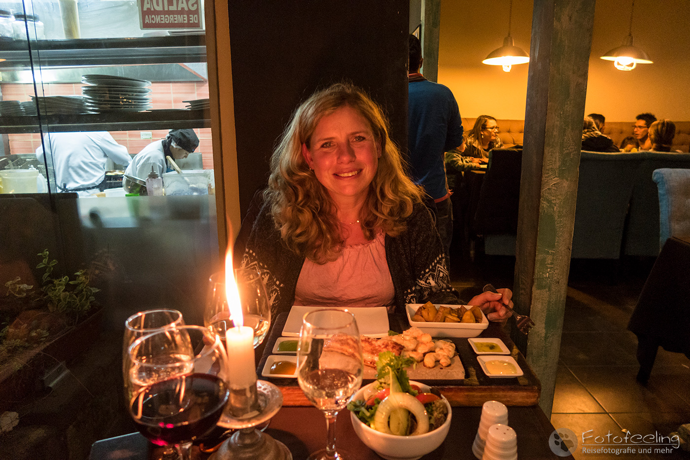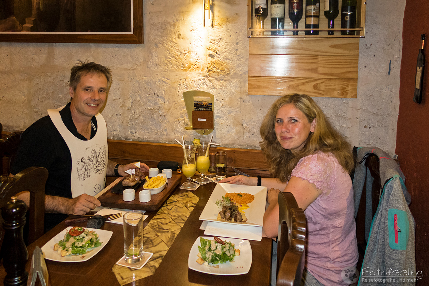 Abends hatten wir einen Tisch im Restaurant „Tipico la Fiesta“ gebucht. Ein Taxi brachte uns dorthin. Die Fenster waren vergittert und man gelangte erst nachdem Klingeln ins Innere. Dort war es jedoch sehr gemütlich. Wir bekamen einen schönen Tisch in Nähe der Bar zugewiesen. Das Essen war sehr gut, aber am meisten gefiel uns, dass der Pisco Sour direkt am Tisch zubereitet wurde.