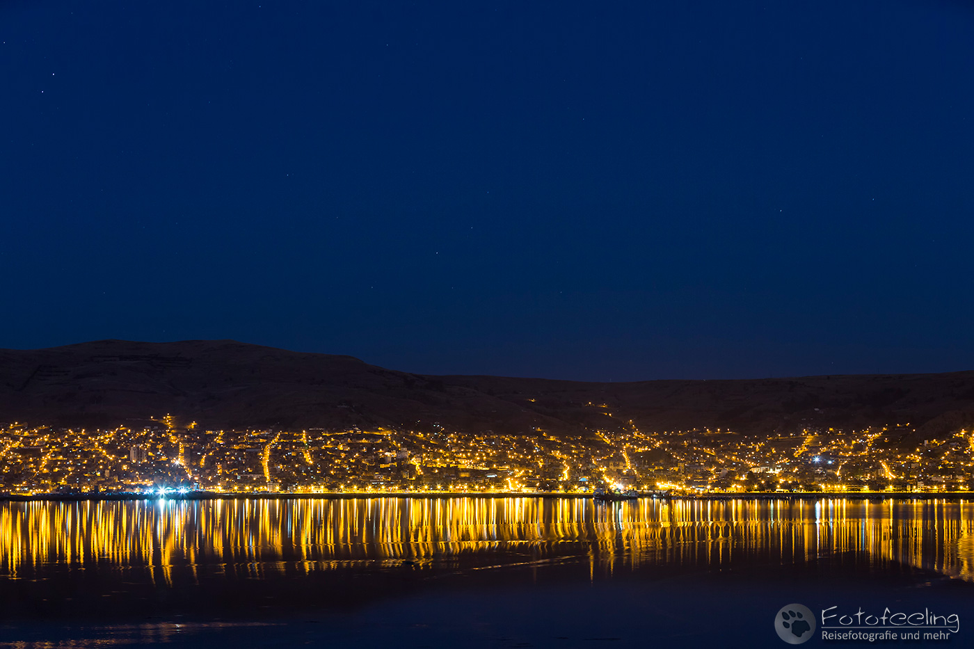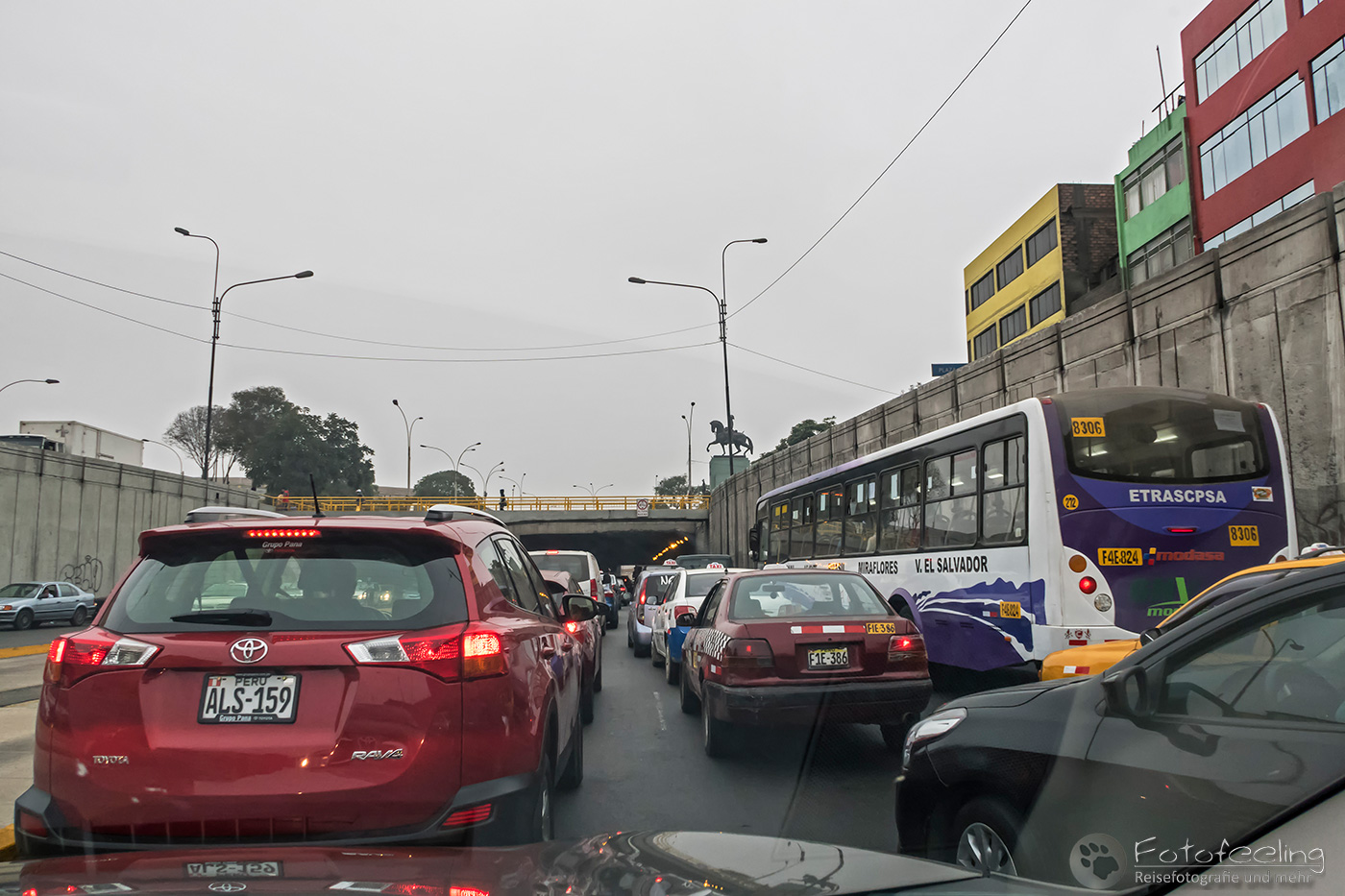 Als es richtig dunkel war, wollten wir nach Miraflores zurück, doch es war gar nicht einfach, ein Taxi zu bekommen. Entweder wurden wir ignoriert, oder der Taxifahrer weigerte sich, nach Miraflores zu fahren. Es kam nur ein „No“ und weg war er. Langsam wurden wir etwas unruhig. Entweder war weit und breit kein Taxi oder der Fahrer wollte nicht fahren. Dann endlich hatten wir Glück und ein Taxi hielt direkt vor uns an und ließ Gäste aussteigen. Chris fragt und der Fahrer willigte ein. Schnell saßen wir im Taxi und fuhren auf der Schnellstraße zurück in Richtung Miraflores. Kurz vor dem Ziel ging dann gar nichts mehr. Die Straße war gnadenlos verstopft. Das war sicherlich ein Grund, warum kaum ein Taxifahrer dorthin fahren wollte. Unser Fahrer quetschte sich irgendwie durch, doch wir kamen nur langsam voran. Immer wieder wechselte er die Spur, nahm Ausfahrten, um gleich darauf wieder die Abfahrt auf die Schnellstraße zu fahren und betätigte kräftig die Hupe. Auch hier sahen wir wieder, der Stärkere und Frechere gewinnt. Wir brauchten für die 7 km trotzdem 45 Minuten, bis wir vor unserem Hotel standen.