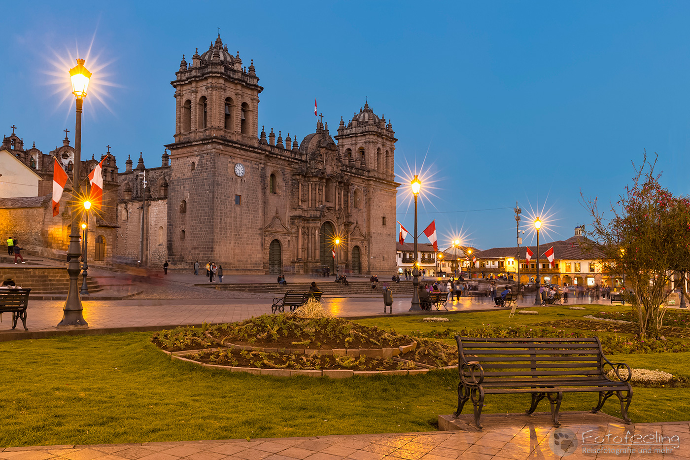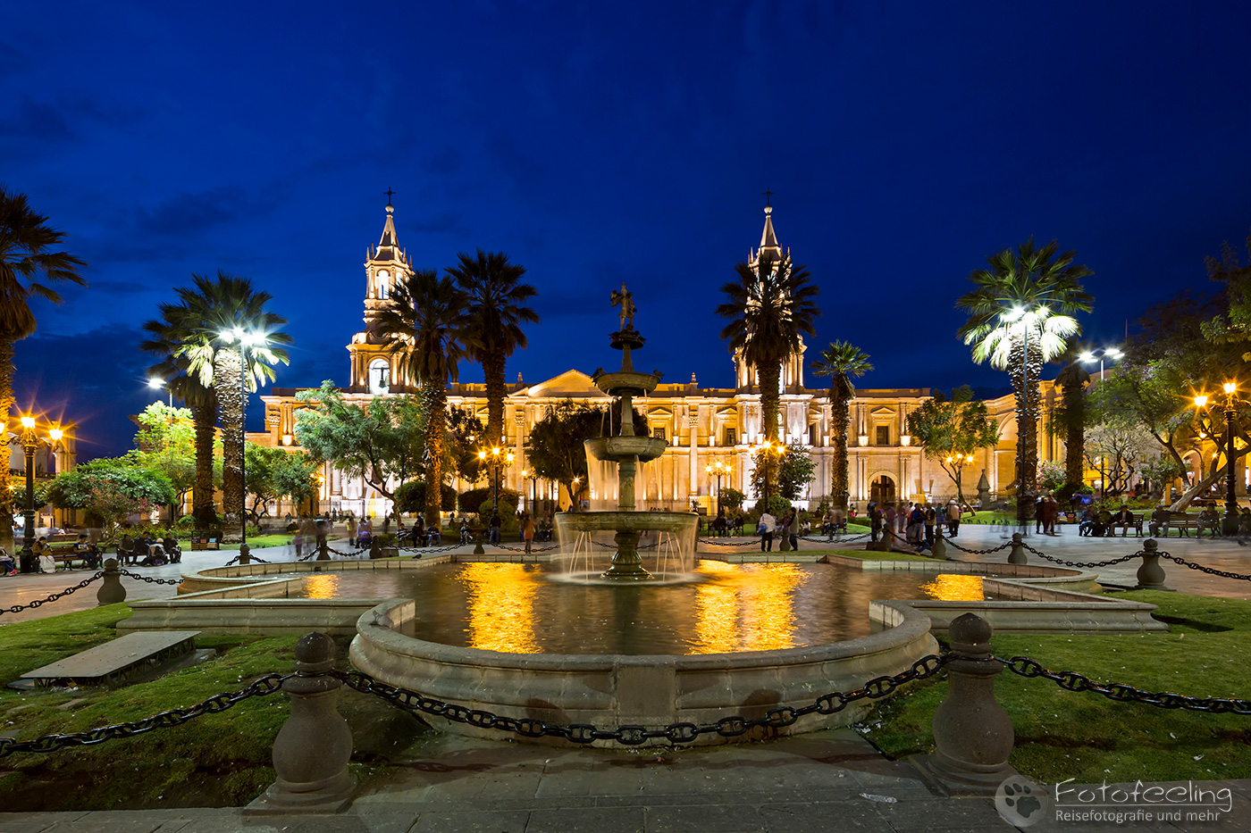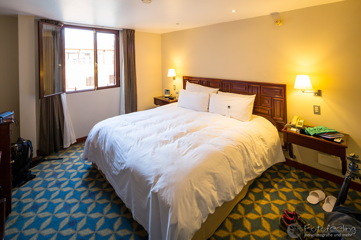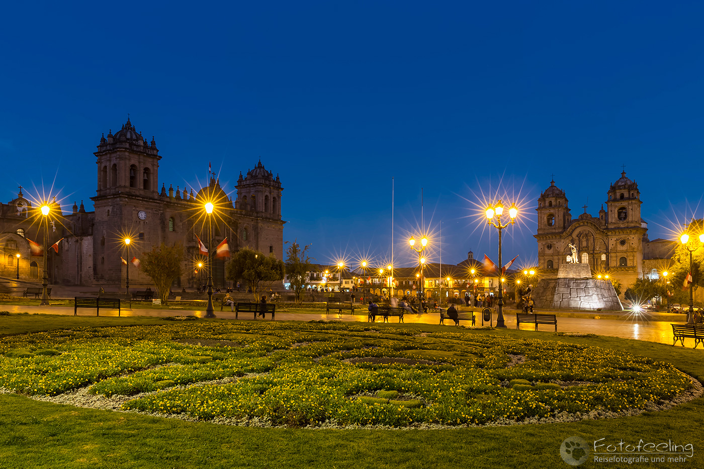 Unser Zimmer lag im dritten Stock mit einem riesigen Kingsizebett und Poolblick. Dadurch war es sehr ruhig. Doch wir hielten uns nicht lange auf, sondern gingen auf die große gepflegte Plaza. Üppige Grünanlagen mit vielen Blumen waren liebevoll angelegt und gut bewacht. Niemand durfte den Rasen betreten, jeder Verstoß wurde mit einem Pfiff aus einer Trillerpfeife geahndet, egal ob der Übeltäter ein Erwachsener, ein Kind oder ein Hund war. Dazu liefen mehrere „Parkwächter“ herum, die man an ihren Warnwesten erkannte. Reinigungspersonal beseitigte sofort jeden Müll und so war es sehr sauber. Viele Menschen tummelten sich auf der Plaza. Meist ältere Fotografen suchten nach Models, um sich ein paar Sol zu verdienen, Zuckerwatteverkäufer und viele andere Händler liefen an den Touristen vorbei und boten ihre Waren feil. Es gab wirklich viel zu sehen. Wir blieben natürlich bis zum Sonnenuntergang und warteten die blaue Stunde ab. Es war einfach toll. Erst gingen langsam die Laternen an, dann wurden die Häuser wie die Kathedrale und die umliegenden Kolonialbauten angestrahlt und boten einen fast schon kitschig schönen Anblick.