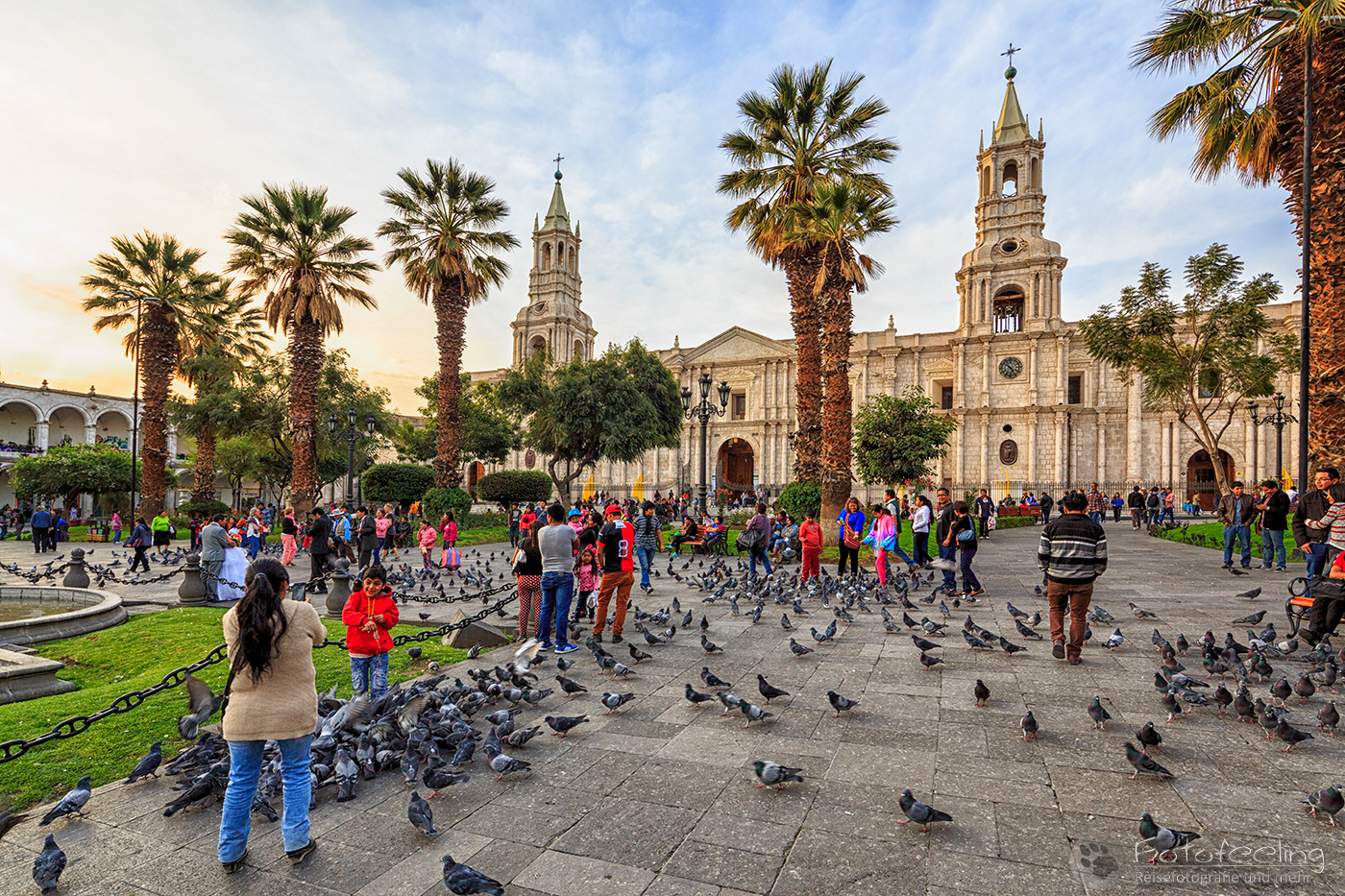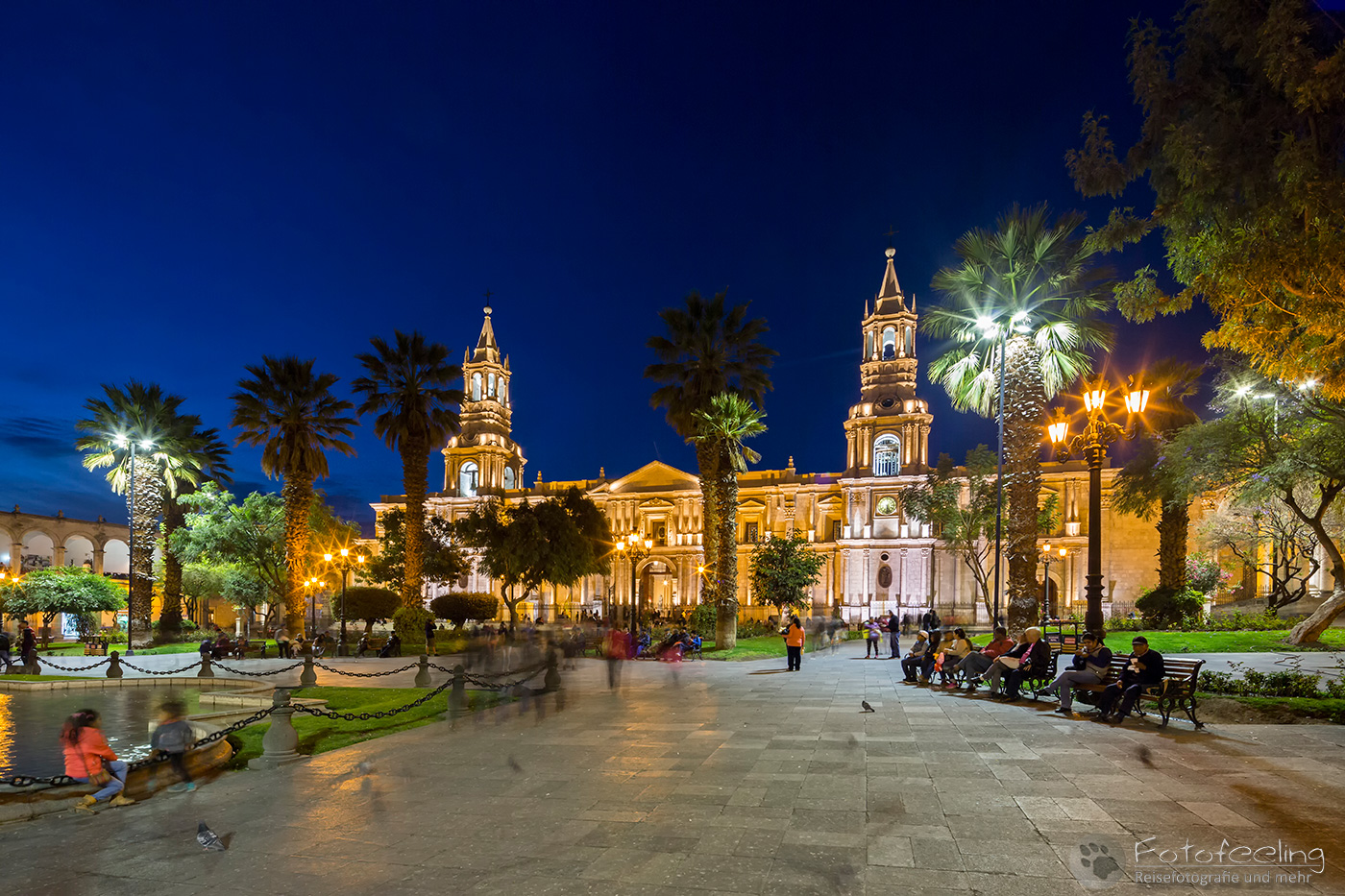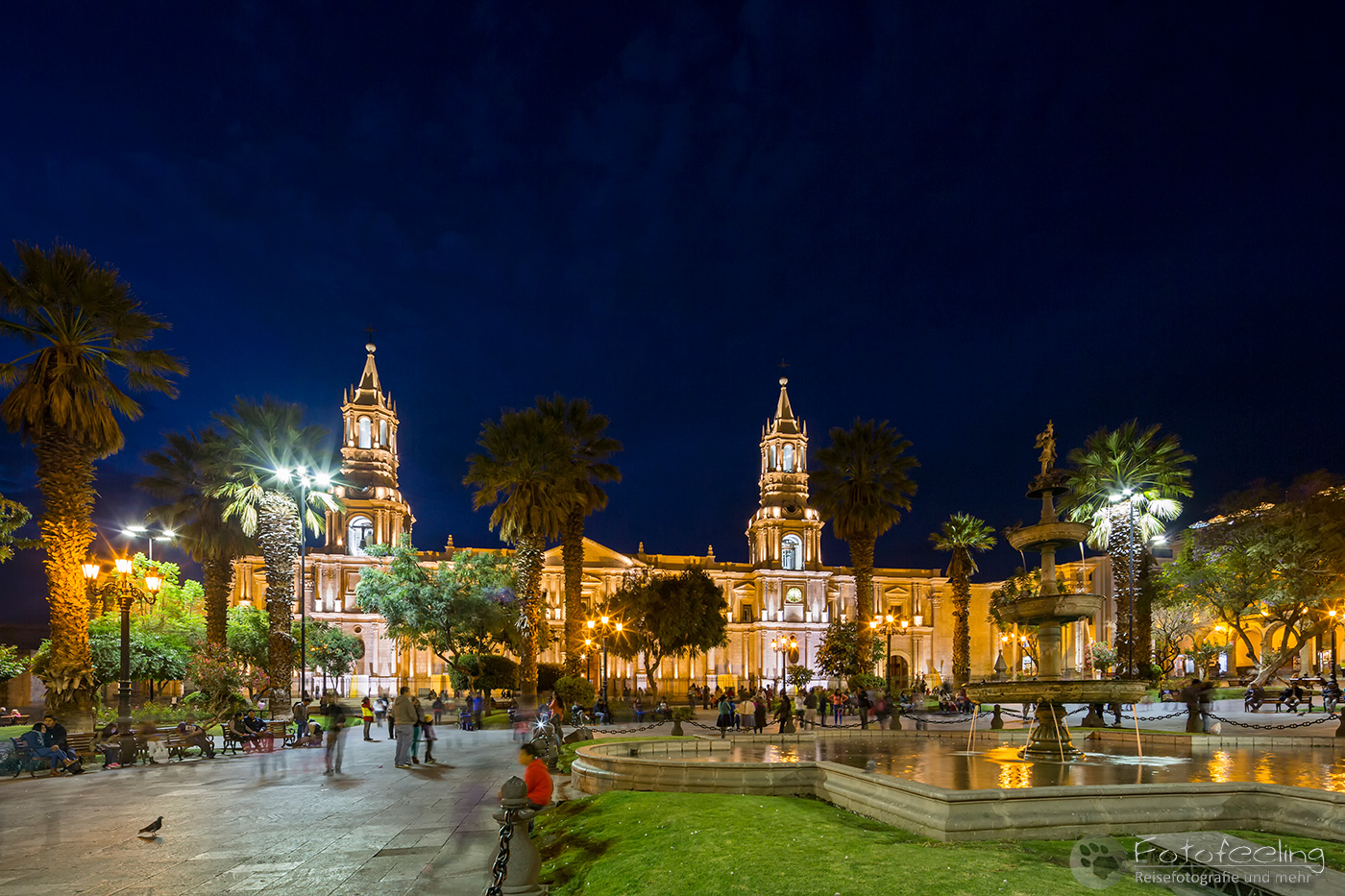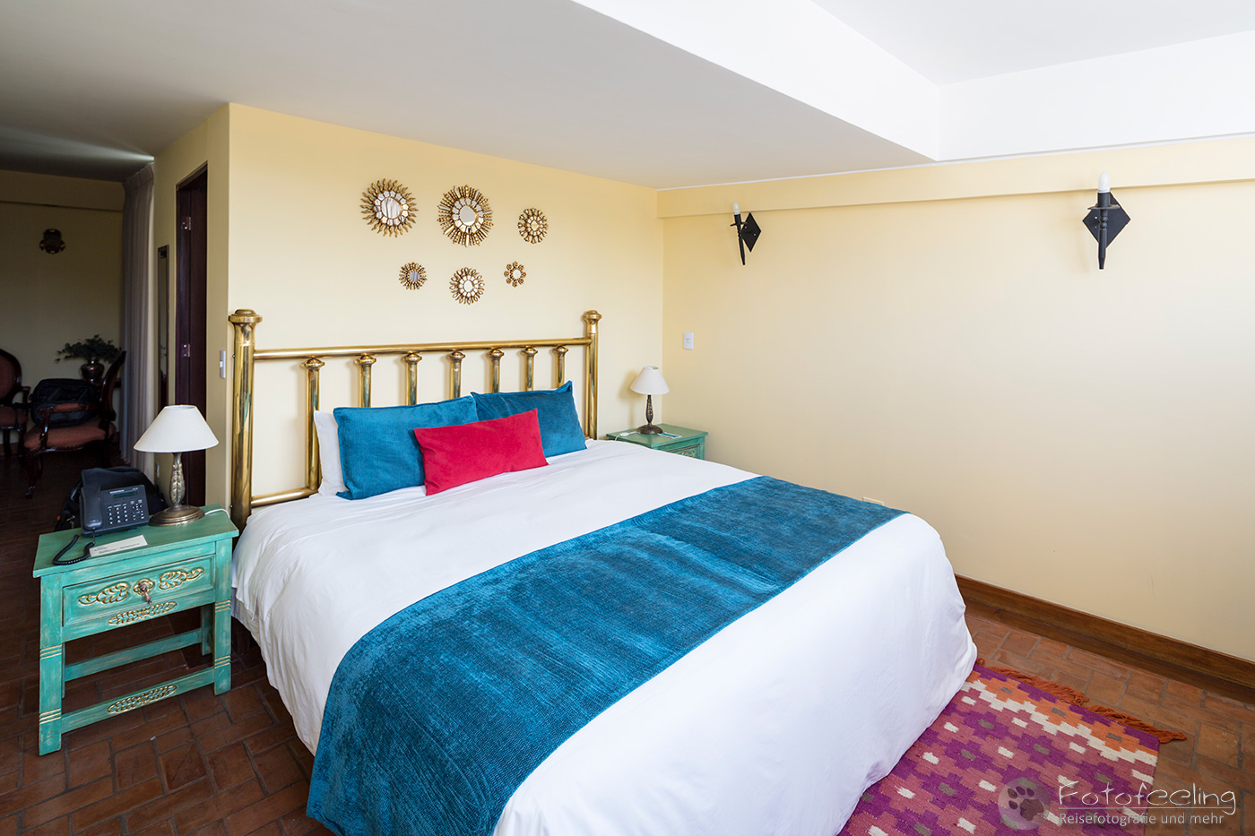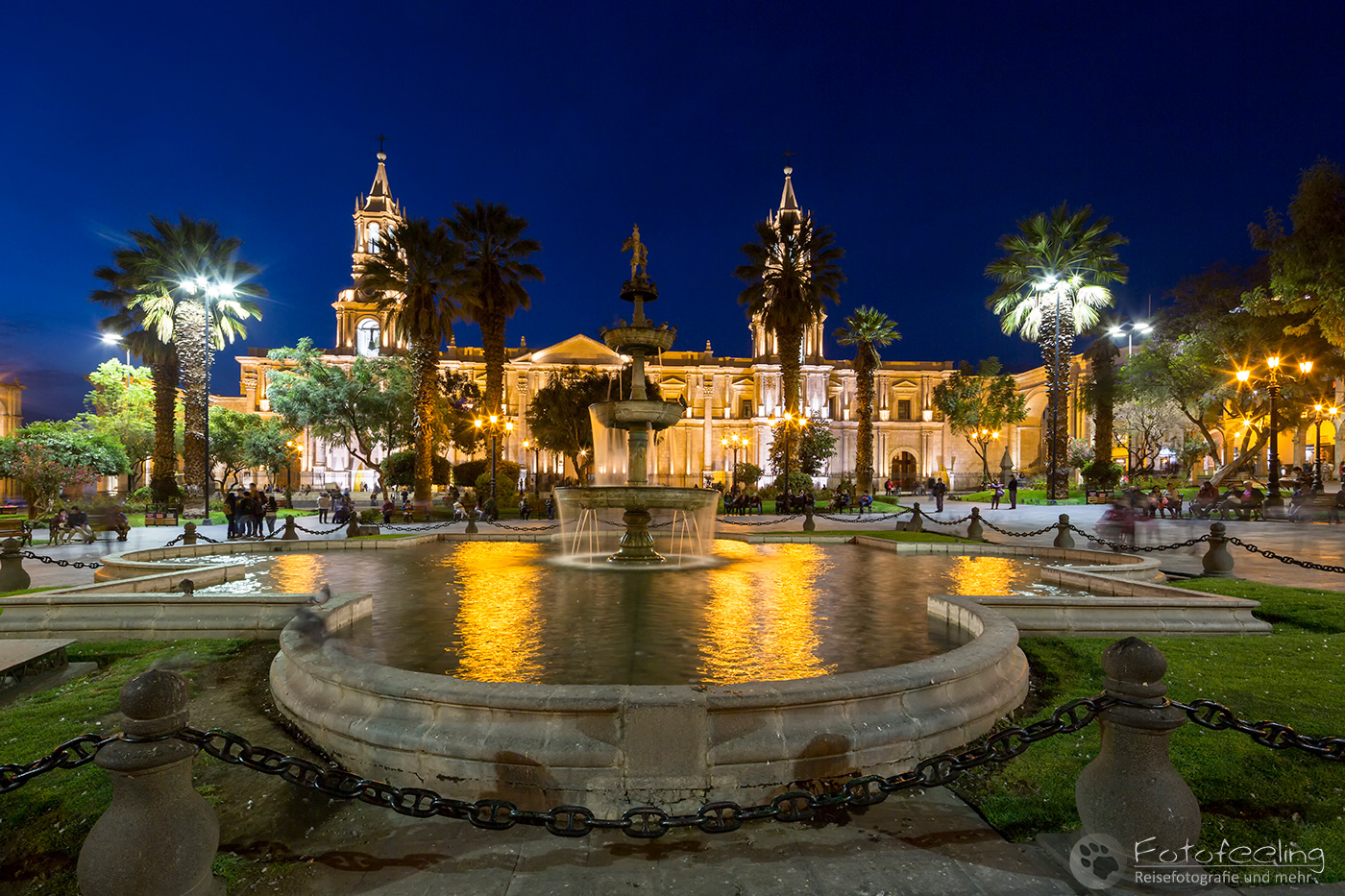 Unser Zimmer lag im dritten Stock mit einem riesigen Kingsizebett und Poolblick. Dadurch war es sehr ruhig. Doch wir hielten uns nicht lange auf, sondern gingen auf die große gepflegte Plaza. Üppige Grünanlagen mit vielen Blumen waren liebevoll angelegt und gut bewacht. Niemand durfte den Rasen betreten, jeder Verstoß wurde mit einem Pfiff aus einer Trillerpfeife geahndet, egal ob der Übeltäter ein Erwachsener, ein Kind oder ein Hund war. Dazu liefen mehrere „Parkwächter“ herum, die man an ihren Warnwesten erkannte. Reinigungspersonal beseitigte sofort jeden Müll und so war es sehr sauber. Viele Menschen tummelten sich auf der Plaza. Meist ältere Fotografen suchten nach Models, um sich ein paar Sol zu verdienen, Zuckerwatteverkäufer und viele andere Händler liefen an den Touristen vorbei und boten ihre Waren feil. Es gab wirklich viel zu sehen. Wir blieben natürlich bis zum Sonnenuntergang und warteten die blaue Stunde ab. Es war einfach toll. Erst gingen langsam die Laternen an, dann wurden die Häuser wie die Kathedrale und die umliegenden Kolonialbauten angestrahlt und boten einen fast schon kitschig schönen Anblick.