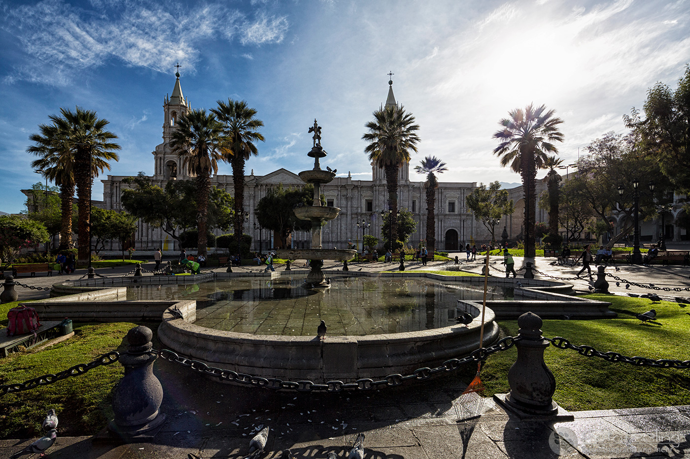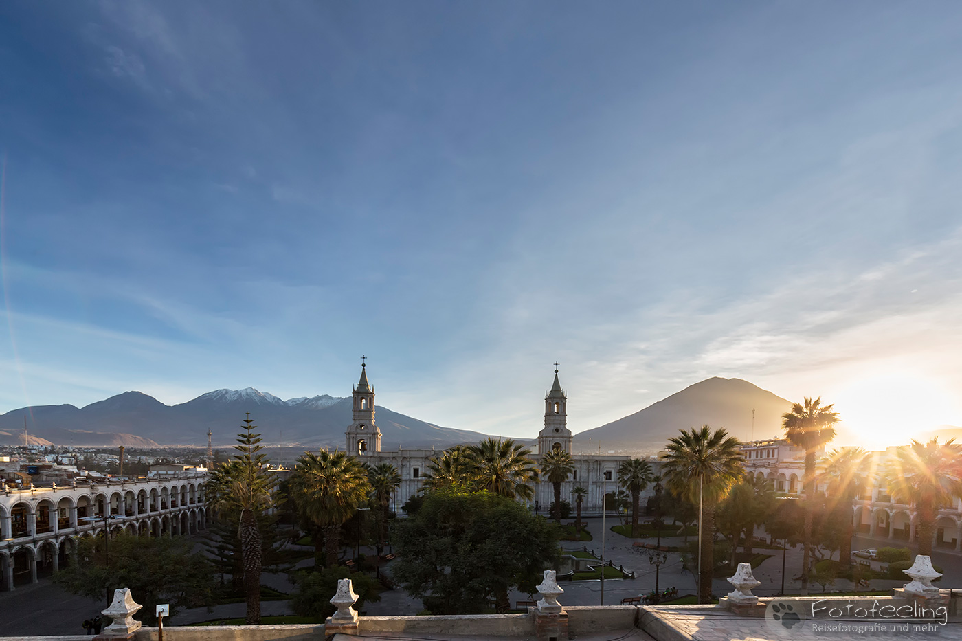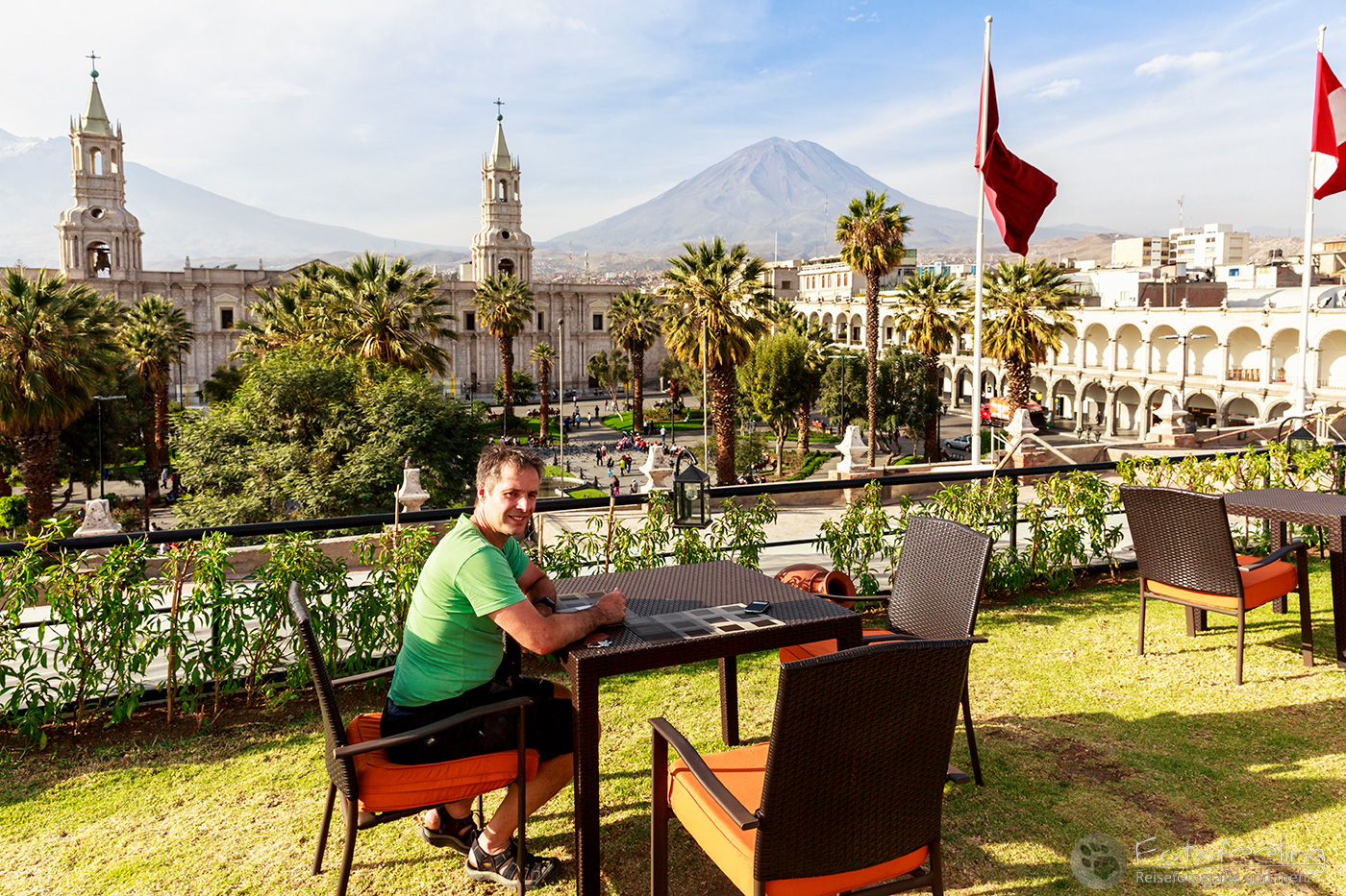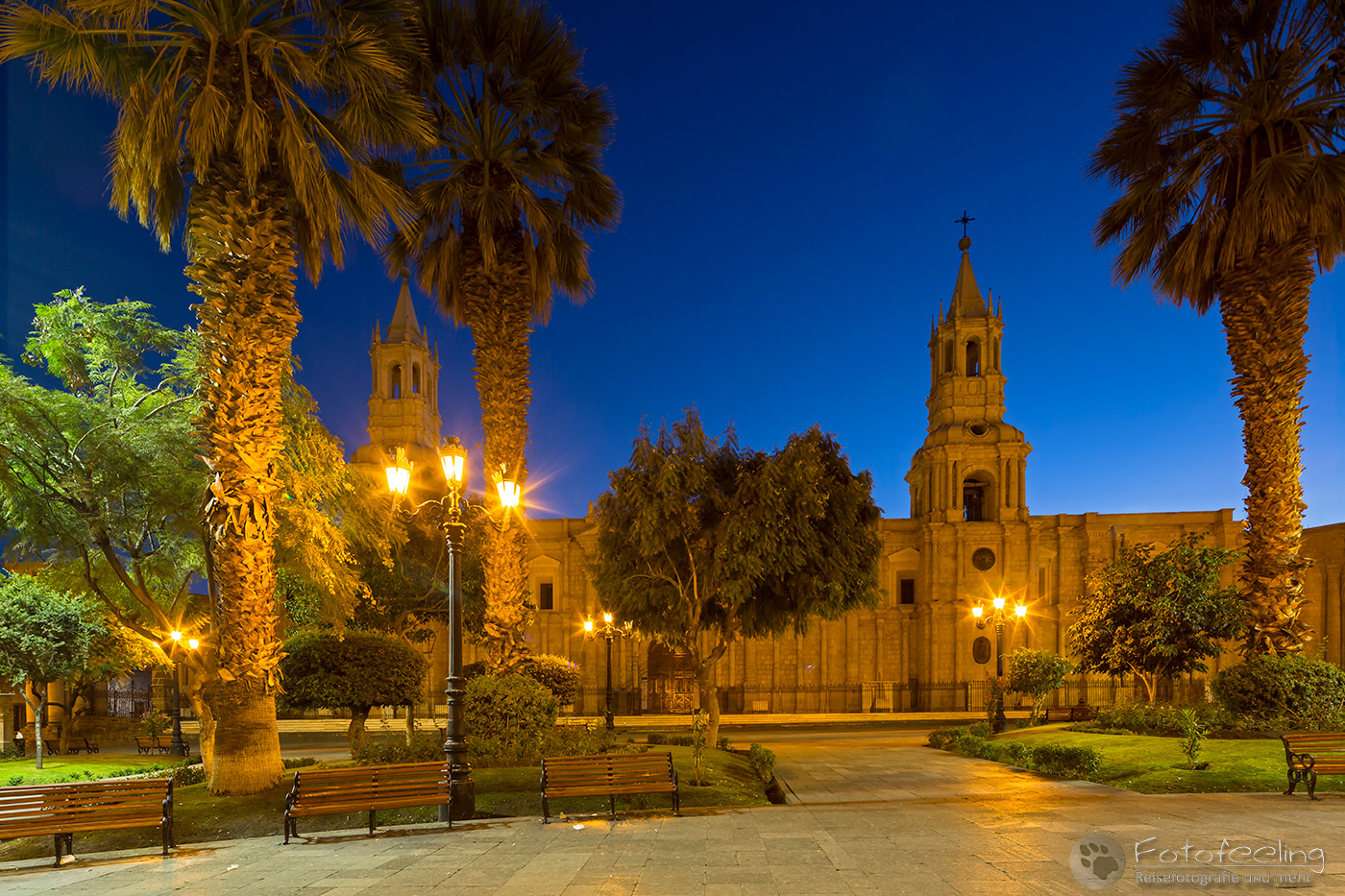 Unser Zimmer lag im dritten Stock mit einem riesigen Kingsizebett und Poolblick. Dadurch war es sehr ruhig. Doch wir hielten uns nicht lange auf, sondern gingen auf die große gepflegte Plaza. Üppige Grünanlagen mit vielen Blumen waren liebevoll angelegt und gut bewacht. Niemand durfte den Rasen betreten, jeder Verstoß wurde mit einem Pfiff aus einer Trillerpfeife geahndet, egal ob der Übeltäter ein Erwachsener, ein Kind oder ein Hund war. Dazu liefen mehrere „Parkwächter“ herum, die man an ihren Warnwesten erkannte. Reinigungspersonal beseitigte sofort jeden Müll und so war es sehr sauber. Viele Menschen tummelten sich auf der Plaza. Meist ältere Fotografen suchten nach Models, um sich ein paar Sol zu verdienen, Zuckerwatteverkäufer und viele andere Händler liefen an den Touristen vorbei und boten ihre Waren feil. Es gab wirklich viel zu sehen. Wir blieben natürlich bis zum Sonnenuntergang und warteten die blaue Stunde ab. Es war einfach toll. Erst gingen langsam die Laternen an, dann wurden die Häuser wie die Kathedrale und die umliegenden Kolonialbauten angestrahlt und boten einen fast schon kitschig schönen Anblick.