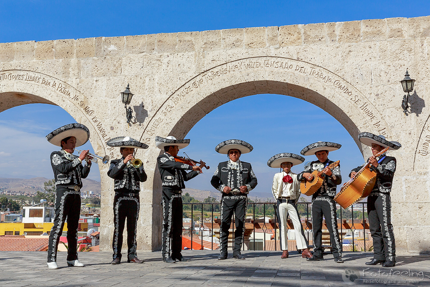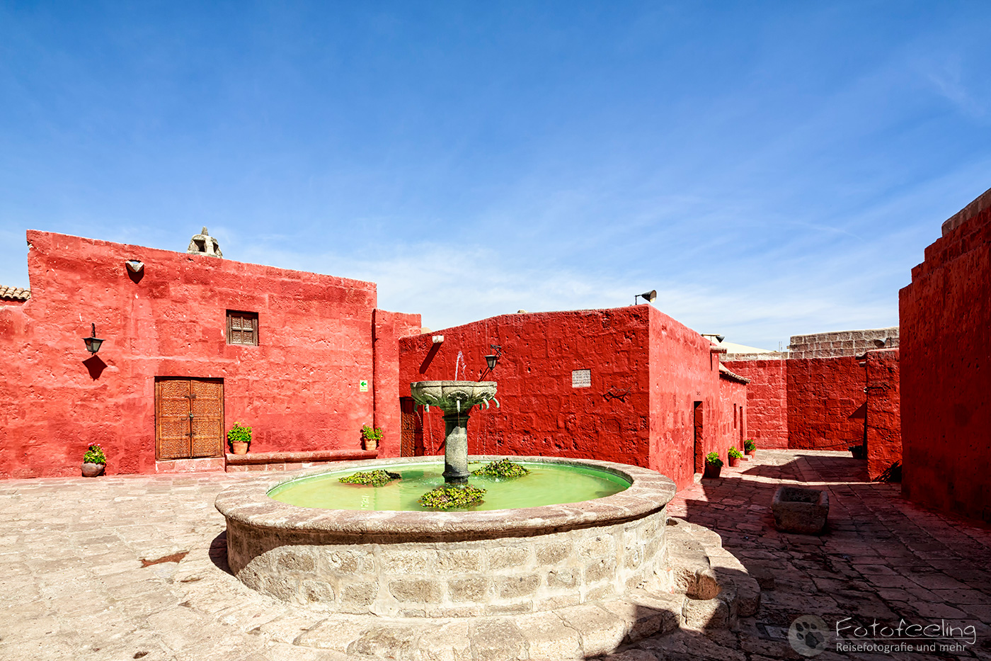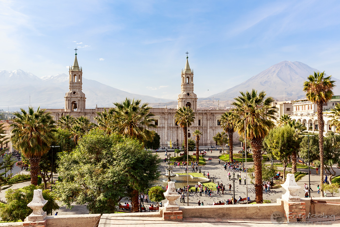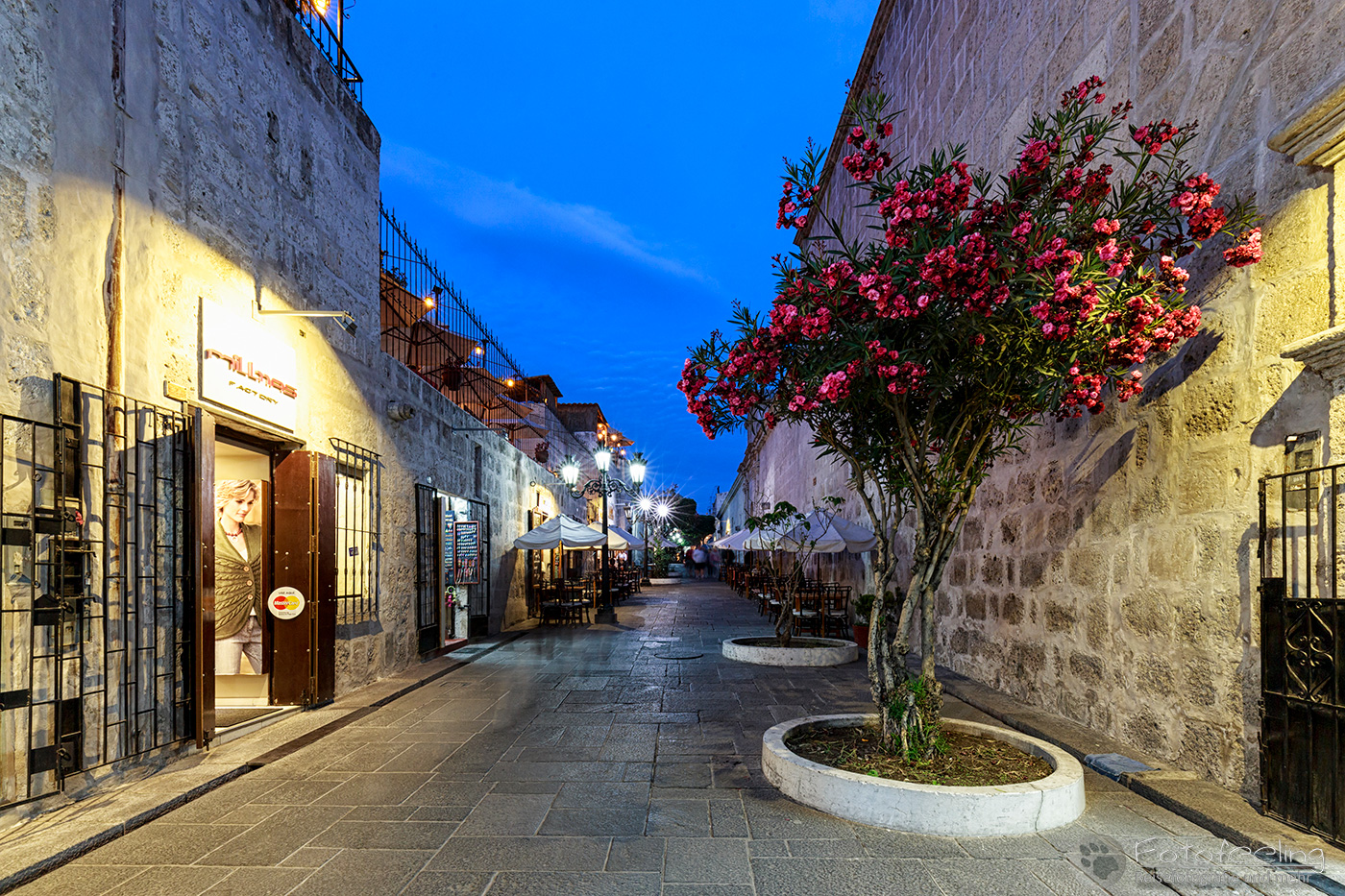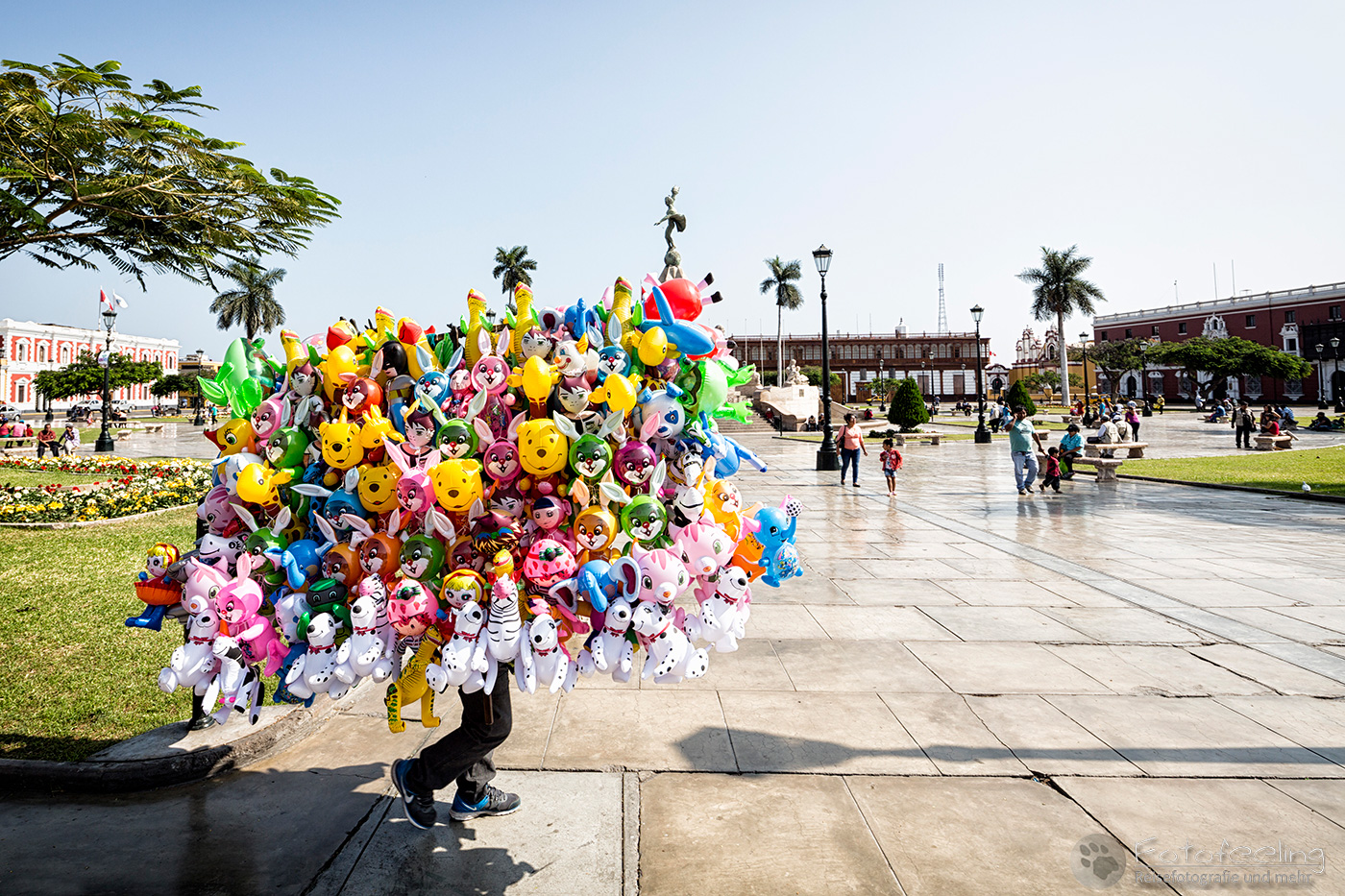 Unser Zimmer lag im dritten Stock mit einem riesigen Kingsizebett und Poolblick. Dadurch war es sehr ruhig. Doch wir hielten uns nicht lange auf, sondern gingen auf die große gepflegte Plaza. Üppige Grünanlagen mit vielen Blumen waren liebevoll angelegt und gut bewacht. Niemand durfte den Rasen betreten, jeder Verstoß wurde mit einem Pfiff aus einer Trillerpfeife geahndet, egal ob der Übeltäter ein Erwachsener, ein Kind oder ein Hund war. Dazu liefen mehrere „Parkwächter“ herum, die man an ihren Warnwesten erkannte. Reinigungspersonal beseitigte sofort jeden Müll und so war es sehr sauber. Viele Menschen tummelten sich auf der Plaza. Meist ältere Fotografen suchten nach Models, um sich ein paar Sol zu verdienen, Zuckerwatteverkäufer und viele andere Händler liefen an den Touristen vorbei und boten ihre Waren feil. Es gab wirklich viel zu sehen. Wir blieben natürlich bis zum Sonnenuntergang und warteten die blaue Stunde ab. Es war einfach toll. Erst gingen langsam die Laternen an, dann wurden die Häuser wie die Kathedrale und die umliegenden Kolonialbauten angestrahlt und boten einen fast schon kitschig schönen Anblick.