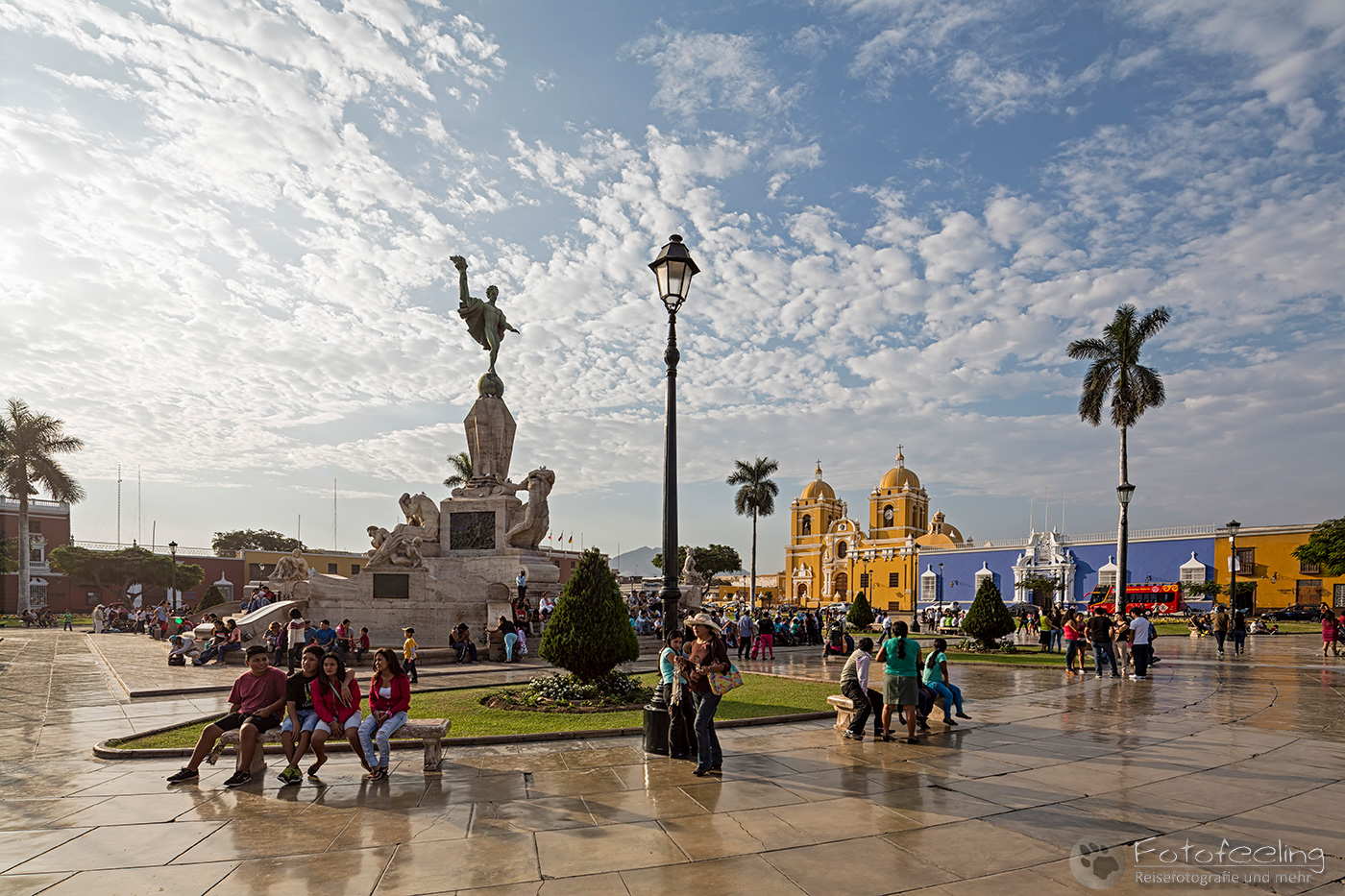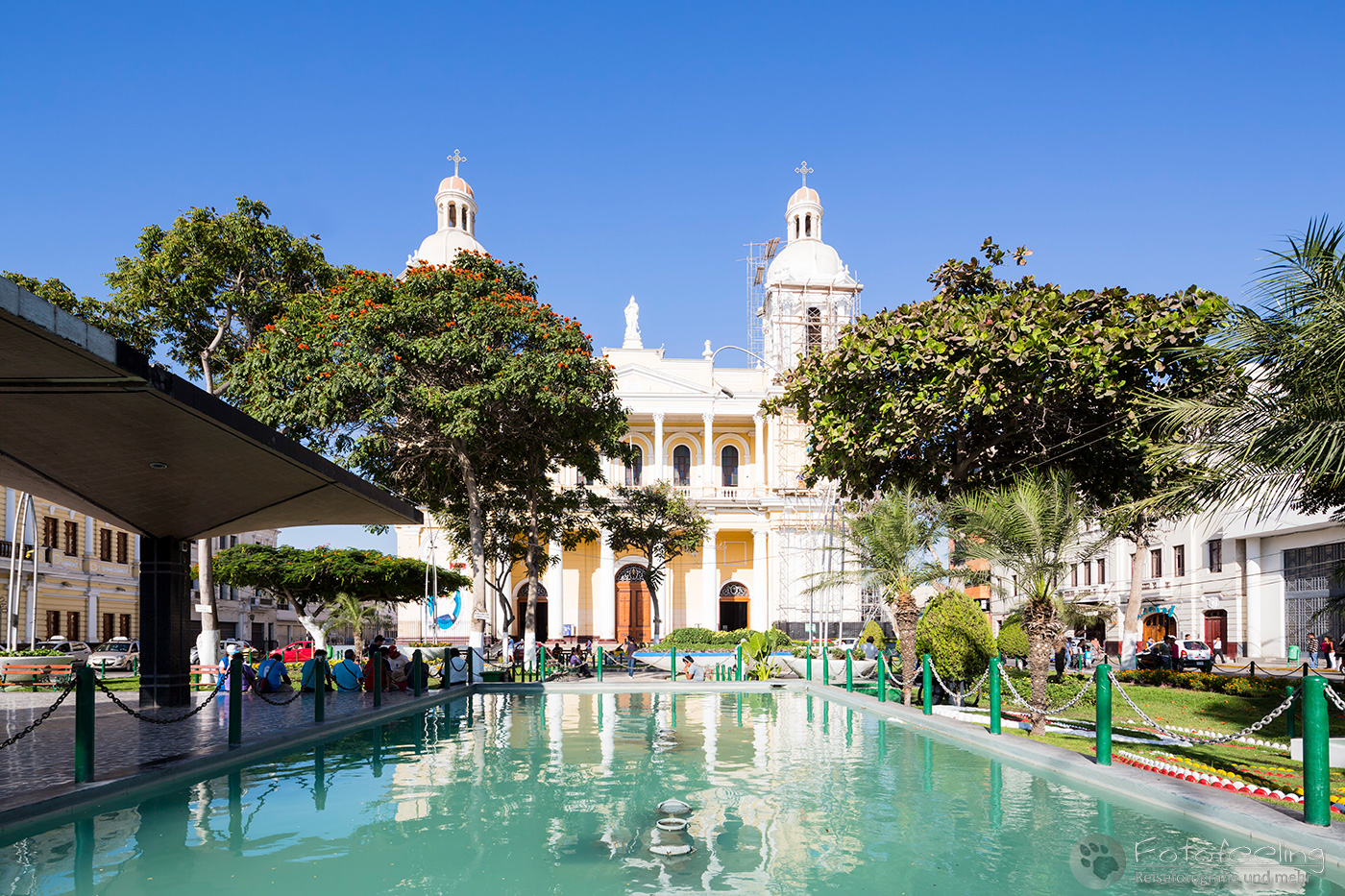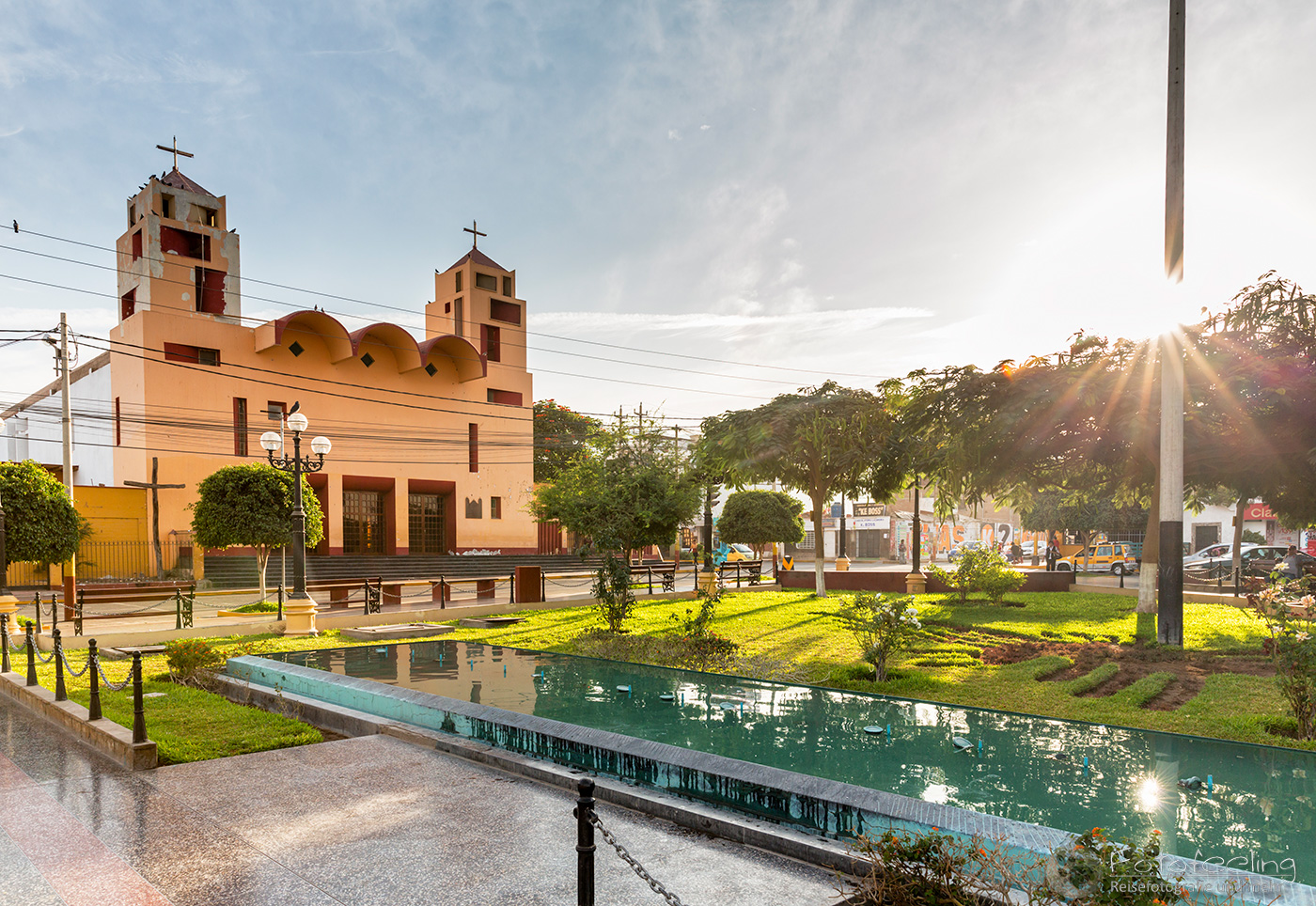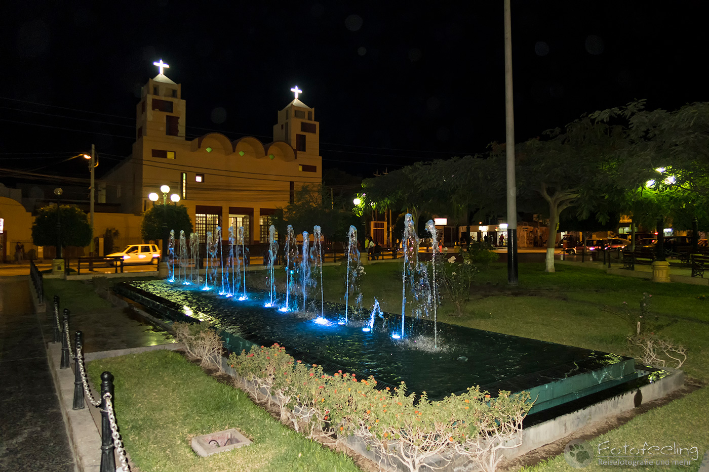 Um ca. 14.30 Uhr waren wir zurück am Hotel und diesmal konnten wir unser Zimmer beziehen. Unser Auto stand in einem großen Hof sehr sicher und vor neugierigen Blicken geschützt. Im Hotelrestaurant tranken wir gemütlich einen Cappuccino. Später spazierten wir in die Stadt und schauten uns die Plaza de Armas an. Damit ja niemand den Rasen betreten kann, war er mit Ketten geschützt und leider war die Iglesia Santa Maria, die Kathedrale von Chiclayo, eingerüstet. So begnügten wir uns mit der Besichtigung und wanderten im Abendlicht zum Hotel zurück. In einem Supermarkt (Metro) kauften wir noch etwas Wein und ein paar Knabbereien ein.