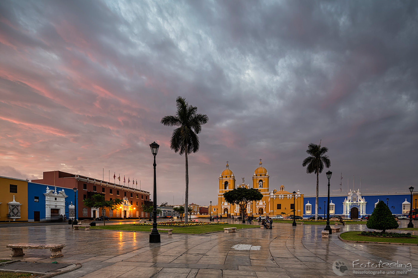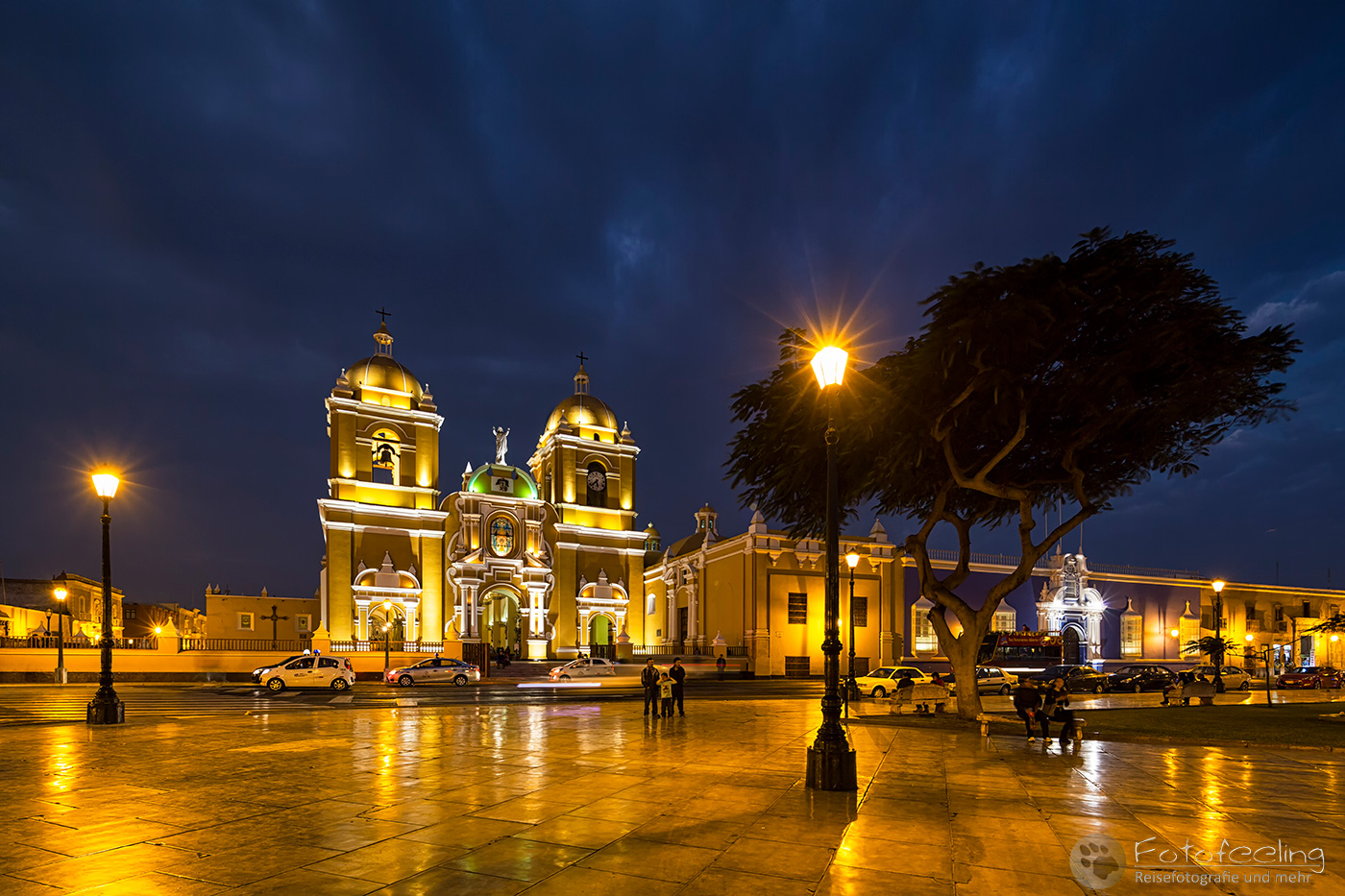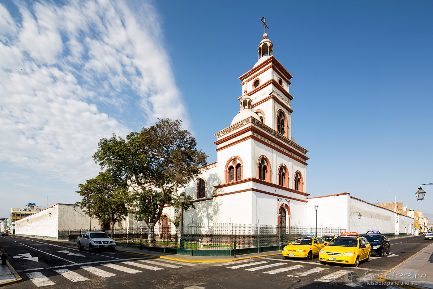 Um ca. 14.30 Uhr waren wir zurück am Hotel und diesmal konnten wir unser Zimmer beziehen. Unser Auto stand in einem großen Hof sehr sicher und vor neugierigen Blicken geschützt. Im Hotelrestaurant tranken wir gemütlich einen Cappuccino. Später spazierten wir in die Stadt und schauten uns die Plaza de Armas an. Damit ja niemand den Rasen betreten kann, war er mit Ketten geschützt und leider war die Iglesia Santa Maria, die Kathedrale von Chiclayo, eingerüstet. So begnügten wir uns mit der Besichtigung und wanderten im Abendlicht zum Hotel zurück. In einem Supermarkt (Metro) kauften wir noch etwas Wein und ein paar Knabbereien ein.