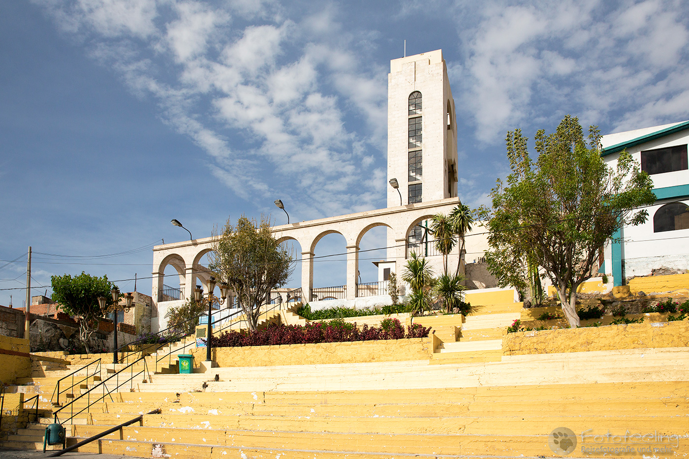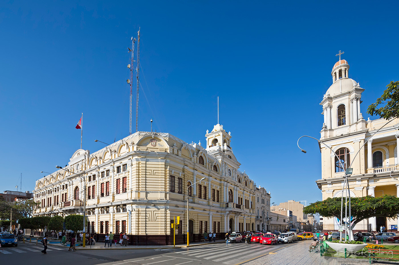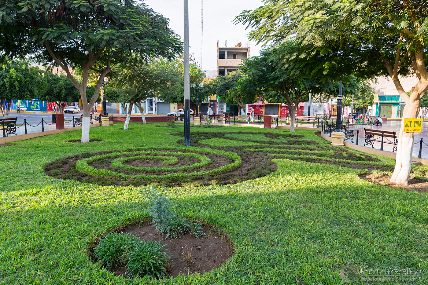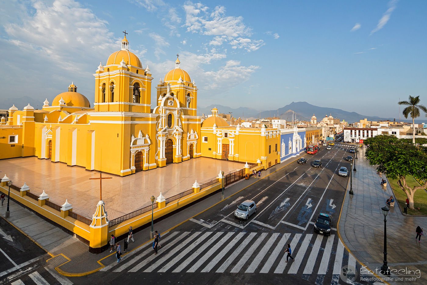 Um ca. 14.30 Uhr waren wir zurück am Hotel und diesmal konnten wir unser Zimmer beziehen. Unser Auto stand in einem großen Hof sehr sicher und vor neugierigen Blicken geschützt. Im Hotelrestaurant tranken wir gemütlich einen Cappuccino. Später spazierten wir in die Stadt und schauten uns die Plaza de Armas an. Damit ja niemand den Rasen betreten kann, war er mit Ketten geschützt und leider war die Iglesia Santa Maria, die Kathedrale von Chiclayo, eingerüstet. So begnügten wir uns mit der Besichtigung und wanderten im Abendlicht zum Hotel zurück. In einem Supermarkt (Metro) kauften wir noch etwas Wein und ein paar Knabbereien ein.