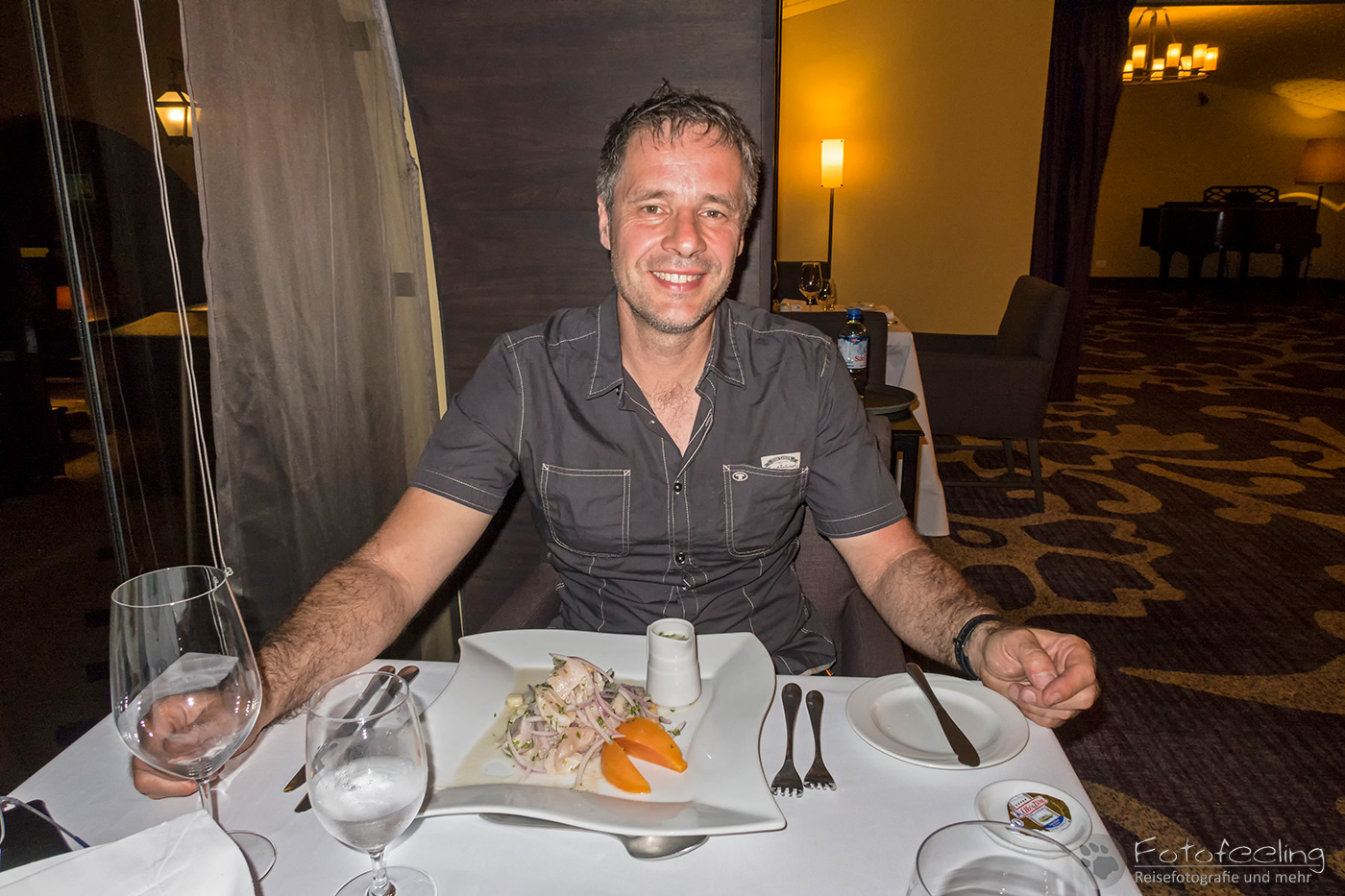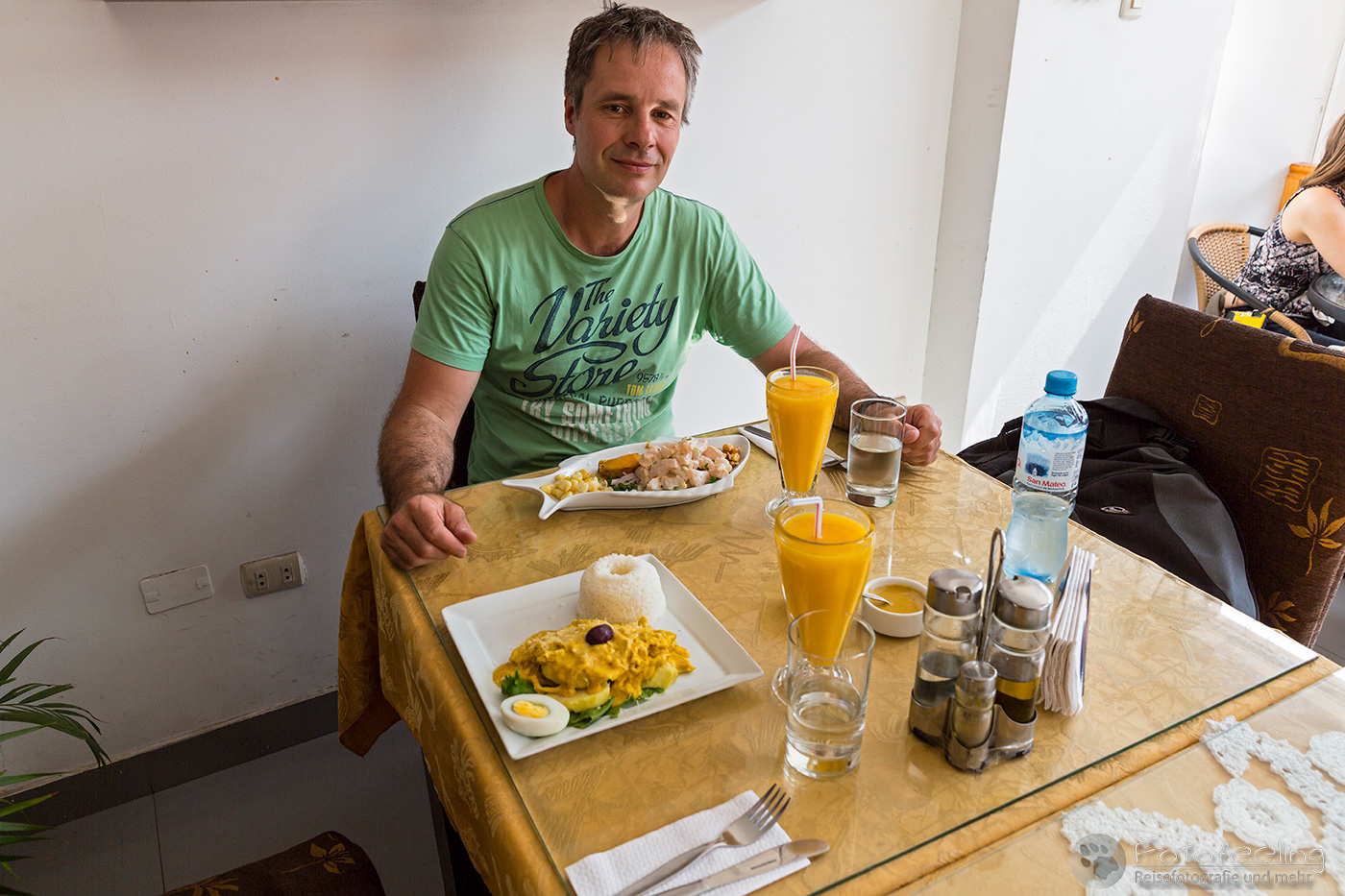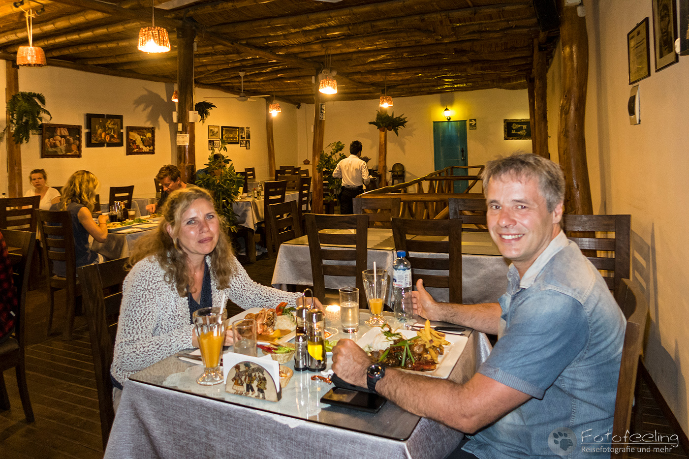 Schnell geduscht und schon waren wir wieder unterwegs. Wir gingen ins Restaurant „Punta Azul“, das ausgebucht war. Zusammen mit anderen Gästen mussten wir ein wenig warten, bis wir einen Tisch bekamen, aber die Warterei hatte sich gelohnt, denn das Essen war fantastisch und der Pisco Sour, der Beste, den wir auf unserer 5 wöchigen kulinarischen Peru Reise getrunken haben. Schon am zweiten Tag waren wir vom peruanischen Essen absolut begeistert. Chris wurde zum freiwilligen Ceviche- und Lomo Saltadoverkoster, während ich immer mal wieder etwas anderes probierte.