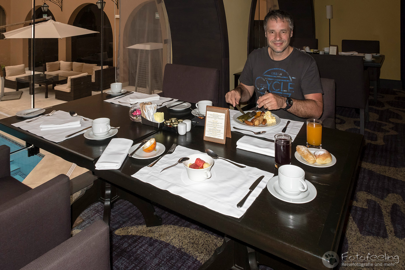 An diesem Morgen schliefen wir aus, denn Frühstück gab es erst ab 8.00 Uhr. So genossen wir unser schönes Zimmer und lasen ein wenig, bis es an der Tür klopfte und uns unser Frühstück im Zimmer serviert wurde. Zu einem frischen Obstsaft gab es leckeres poschiertes Ei mit Gemüse und Salat, dazu frische Semmeln mit Marmelade und Butter.