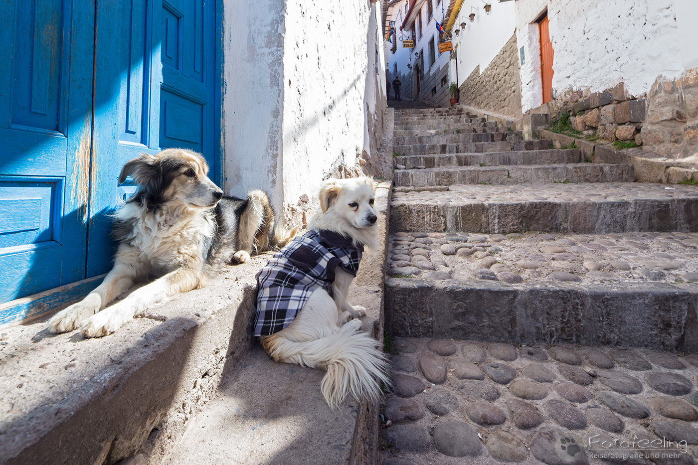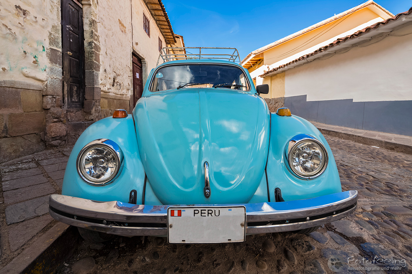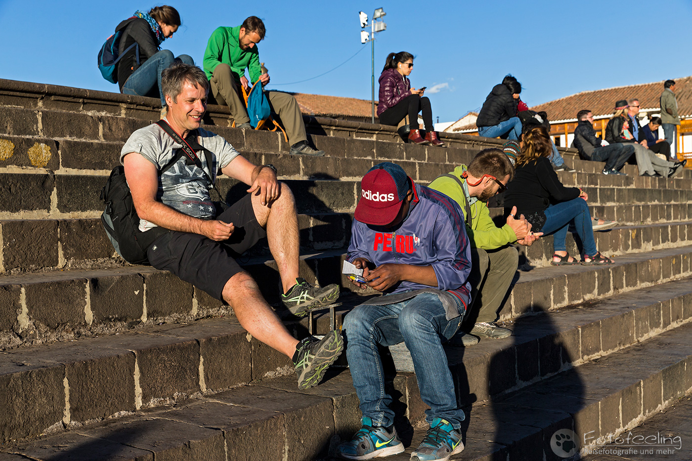 Am Nachmittag machten wir wieder die Straßen Cuscos unsicher und begegneten ein paar echt netten Hunden. Hier sahen wir auch immer wieder fetzige alte „Käfer“, wobei es uns ein hellblauer super gepflegter VW besonders angetan hatte. Wir suchten noch einmal unsere Lieblingsaussichtsplätze auf und landeten zum späten Nachmittagslicht wieder auf der Plaza de Armas. Ständig wurde Chris von Schuhputzern angesprochen, denn an seinen Turnschuhen hatten sich vorne die Gummis abgelöst und standen ab. Außerdem waren die Schuhe extrem dreckig und so ließ er sich überreden, seine Schuhe pflegen und reparieren zu lassen. Die Turnschuhe wurden echt super. Die Gummis hielten und die Turnschuhe sahen wieder schwarz aus. Der Spaß hatte umgerechnet 3 Euro gekostet und die Schuhe hielten sogar noch eine weitere Reise.
