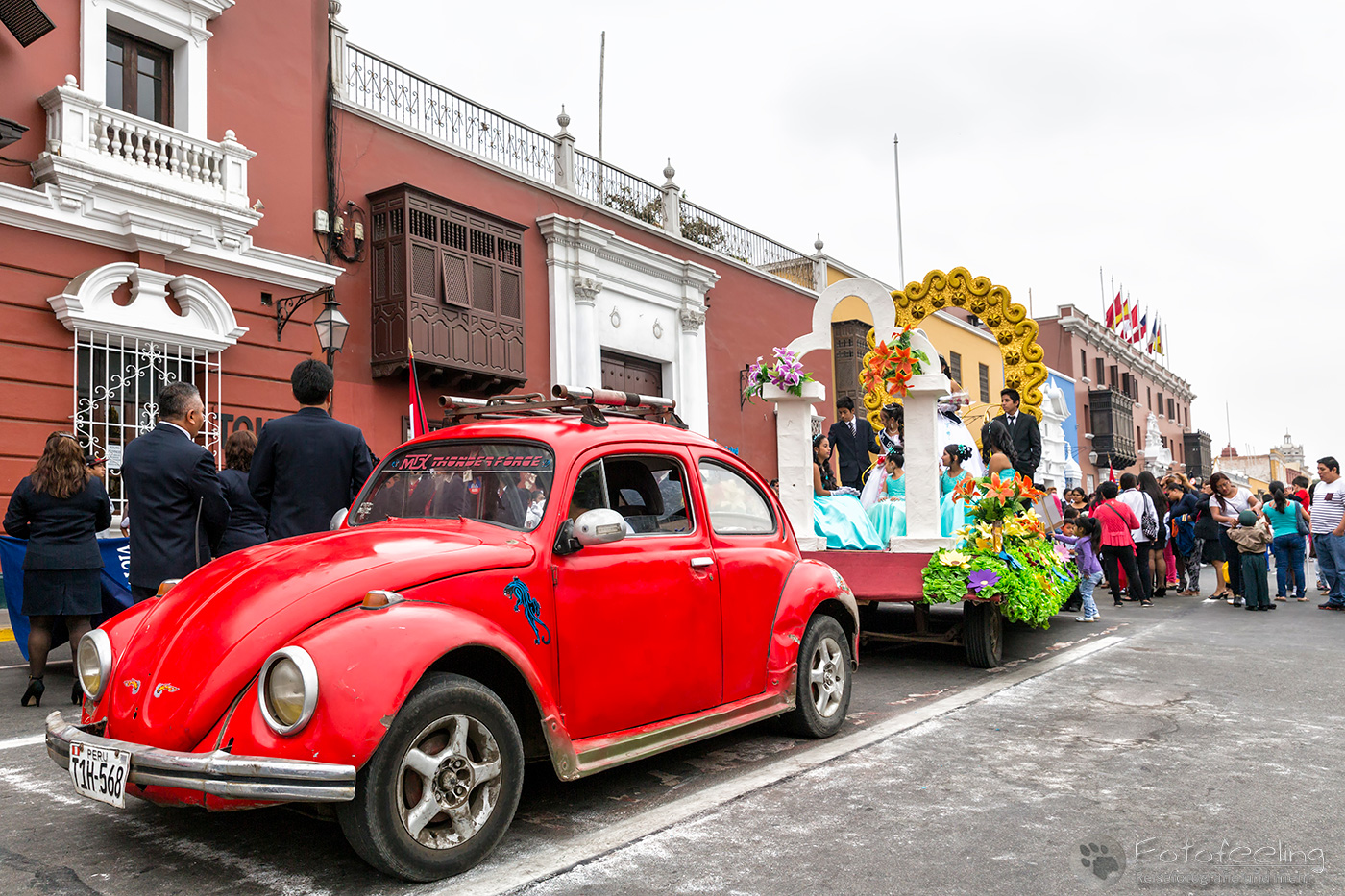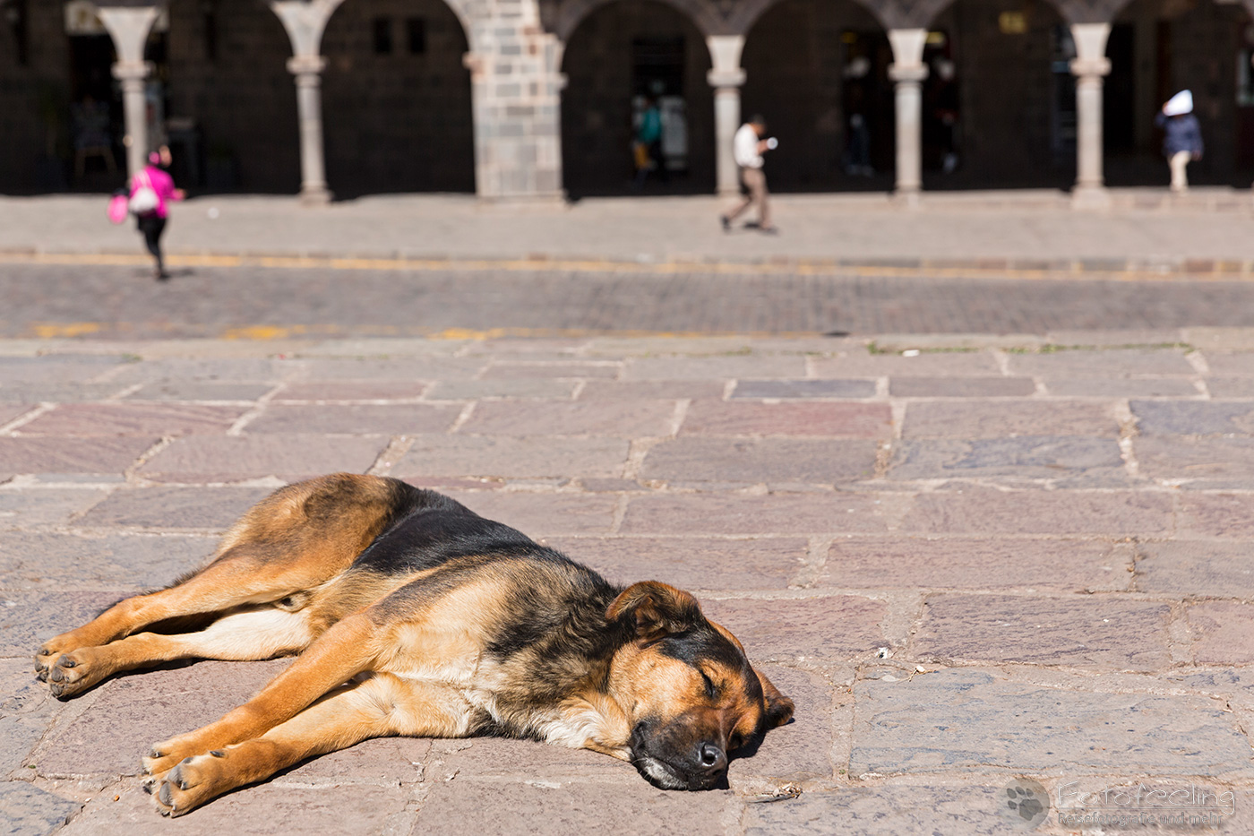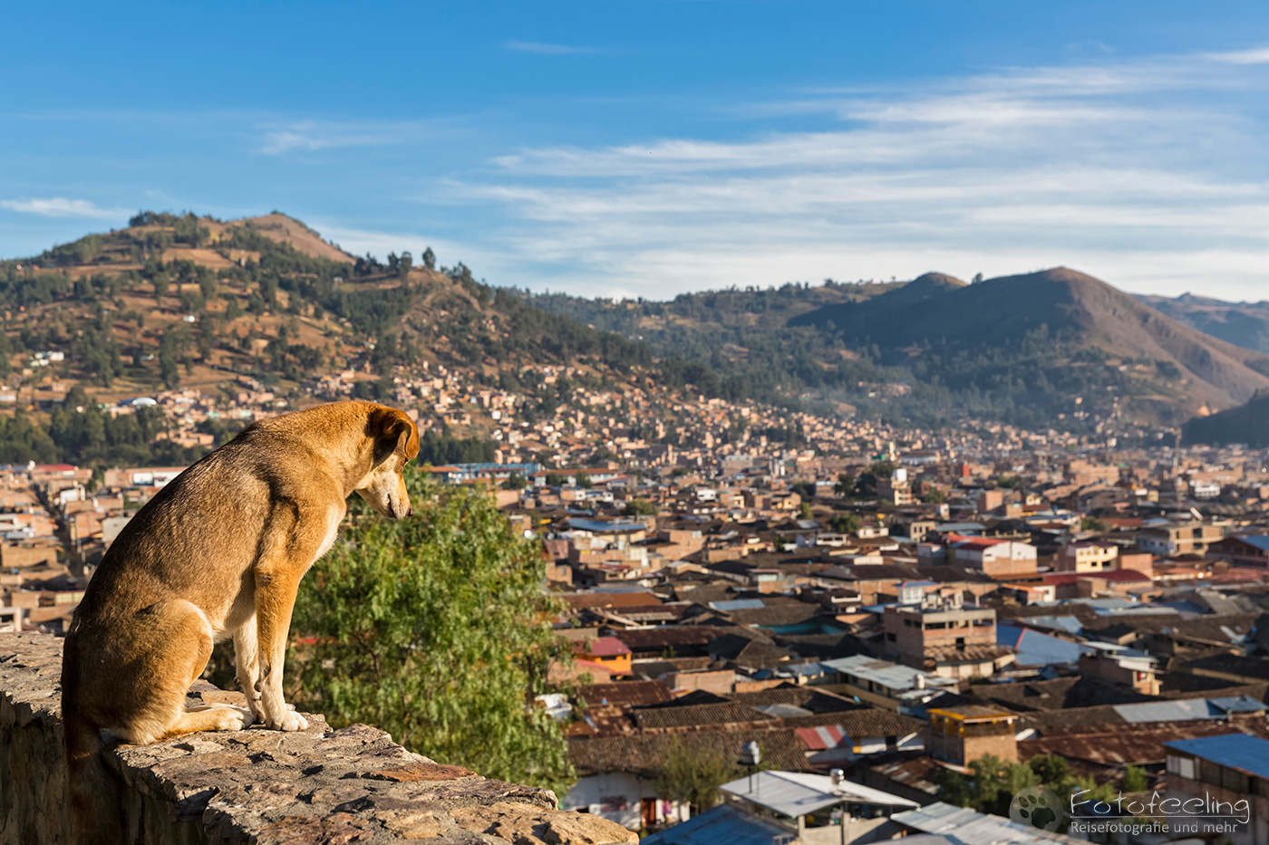 Am Nachmittag machten wir wieder die Straßen Cuscos unsicher und begegneten ein paar echt netten Hunden. Hier sahen wir auch immer wieder fetzige alte „Käfer“, wobei es uns ein hellblauer super gepflegter VW besonders angetan hatte. Wir suchten noch einmal unsere Lieblingsaussichtsplätze auf und landeten zum späten Nachmittagslicht wieder auf der Plaza de Armas. Ständig wurde Chris von Schuhputzern angesprochen, denn an seinen Turnschuhen hatten sich vorne die Gummis abgelöst und standen ab. Außerdem waren die Schuhe extrem dreckig und so ließ er sich überreden, seine Schuhe pflegen und reparieren zu lassen. Die Turnschuhe wurden echt super. Die Gummis hielten und die Turnschuhe sahen wieder schwarz aus. Der Spaß hatte umgerechnet 3 Euro gekostet und die Schuhe hielten sogar noch eine weitere Reise.