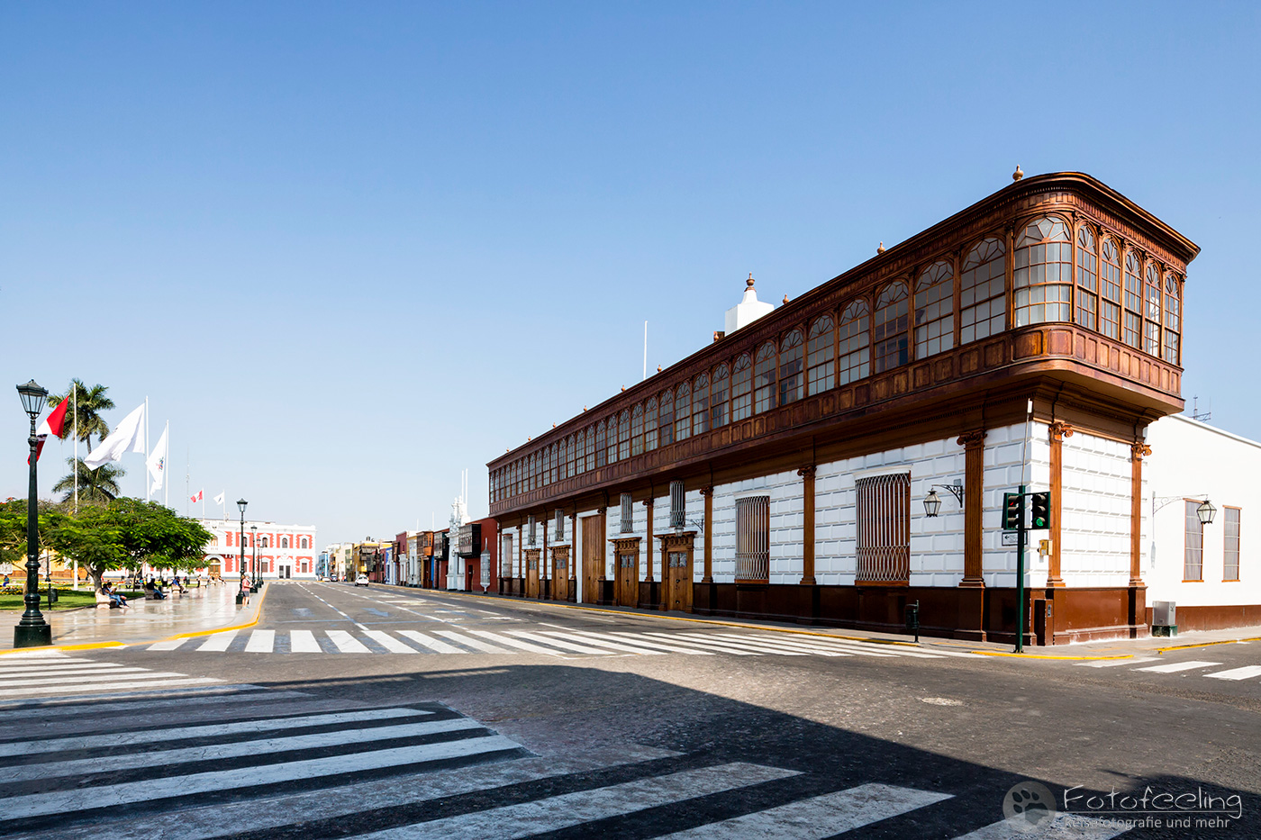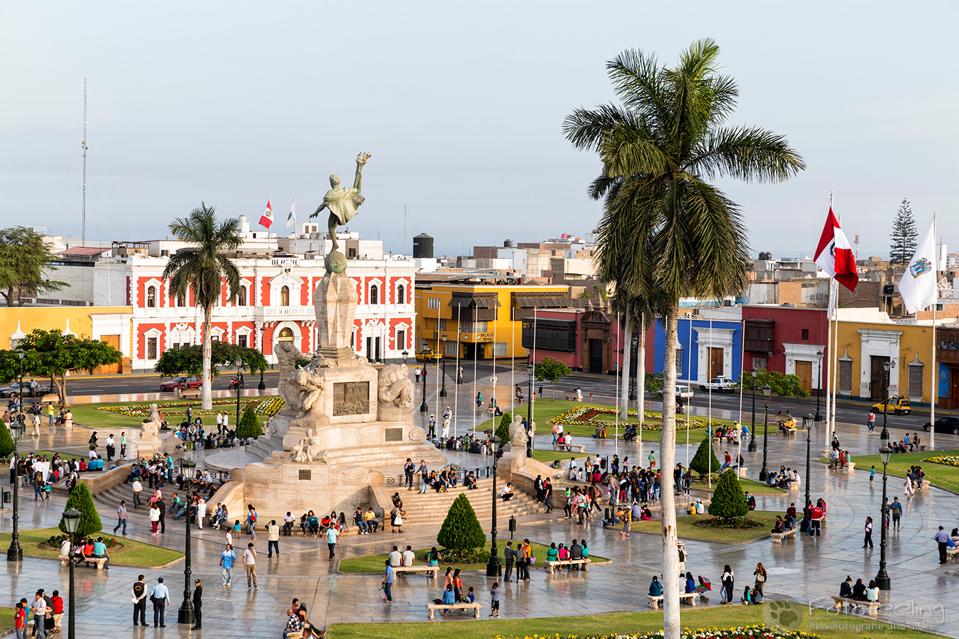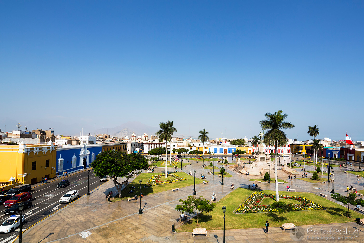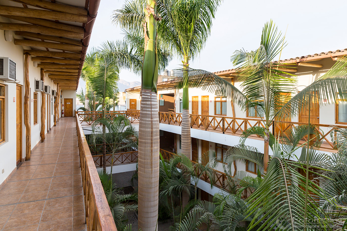 Um 17.00 Uhr kamen wir endlich in Trujillo an. Sie ist die Hauptstadt der Region La Libertad und wichtigste peruanische Stadt nördlich von Lima. Unser Hotel „La Libertador“, ein hübscher rot-weißer Kolonialbau liegt direkt an der Plaza de Armas. Chris parkte unser Auto davor und ich flitzte schnell hinein, da wir erst noch einen Parkplatz organisieren mussten. Die nette Dame an der Rezeption half mir und sofort sprintete ein Angestellter zu Chris und half ihm, das Auto zu entladen und auf einem „ausgelagerten“ hoteleigenen Parkplatz unterzubringen. Derweil füllte ich unsere Anmeldeformulare aus. Unsere Pässe und das Einreisezettelchen wurden kopiert.