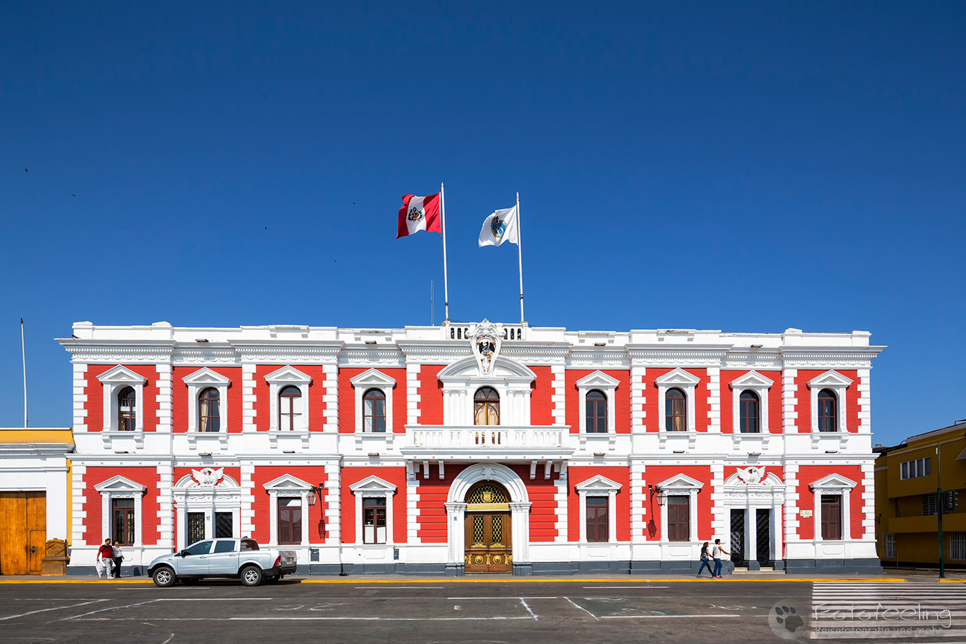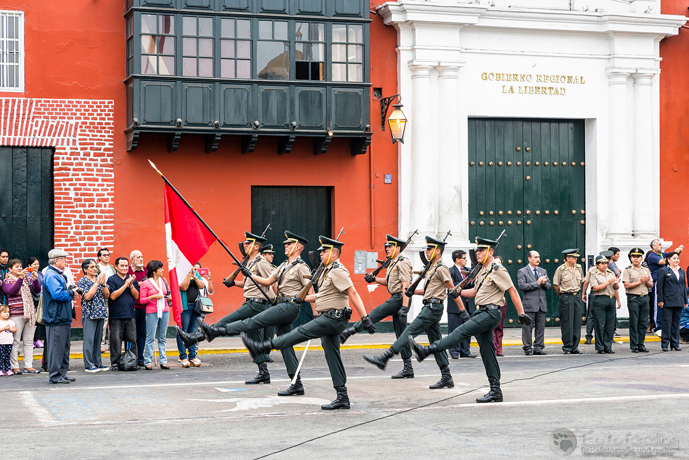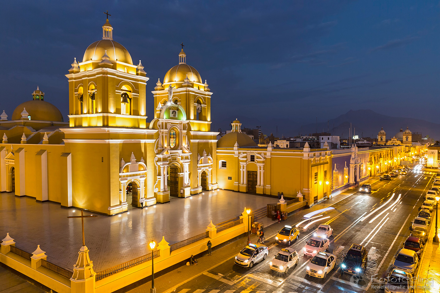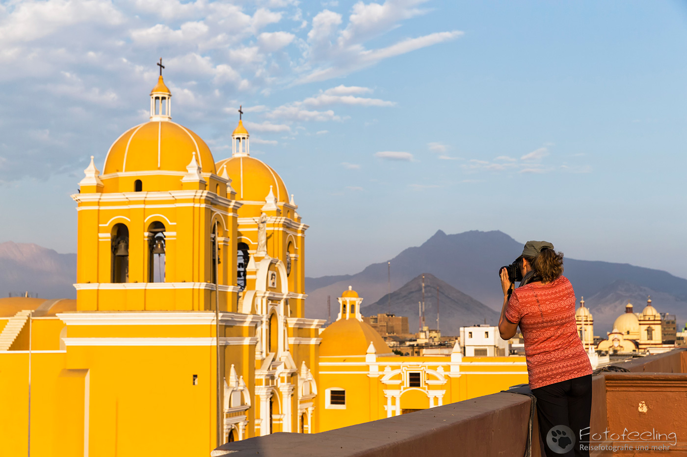 Um 17.00 Uhr kamen wir endlich in Trujillo an. Sie ist die Hauptstadt der Region La Libertad und wichtigste peruanische Stadt nördlich von Lima. Unser Hotel „La Libertador“, ein hübscher rot-weißer Kolonialbau liegt direkt an der Plaza de Armas. Chris parkte unser Auto davor und ich flitzte schnell hinein, da wir erst noch einen Parkplatz organisieren mussten. Die nette Dame an der Rezeption half mir und sofort sprintete ein Angestellter zu Chris und half ihm, das Auto zu entladen und auf einem „ausgelagerten“ hoteleigenen Parkplatz unterzubringen. Derweil füllte ich unsere Anmeldeformulare aus. Unsere Pässe und das Einreisezettelchen wurden kopiert.