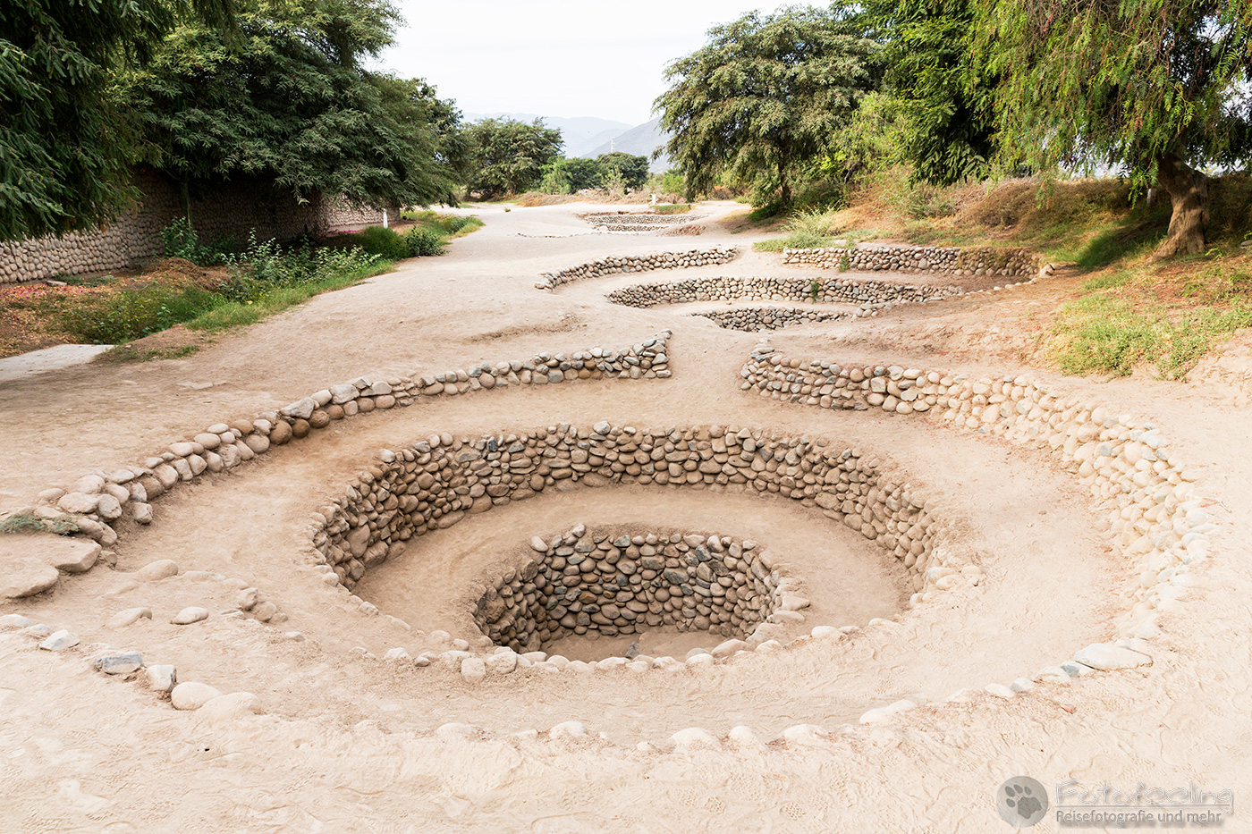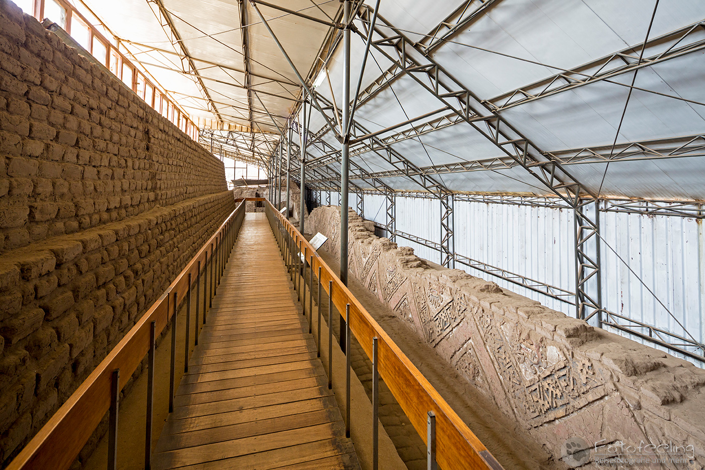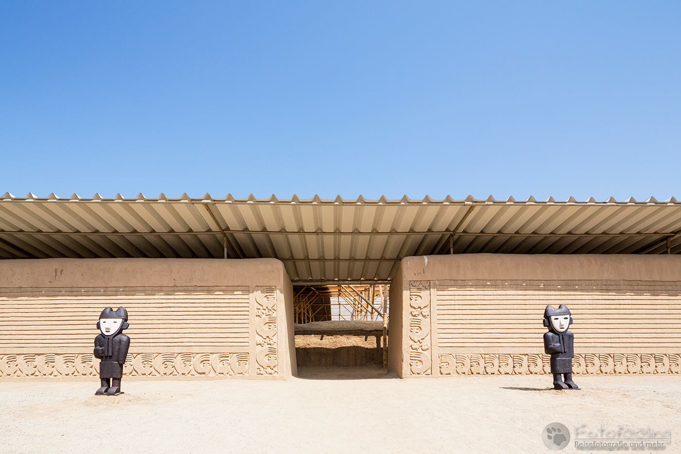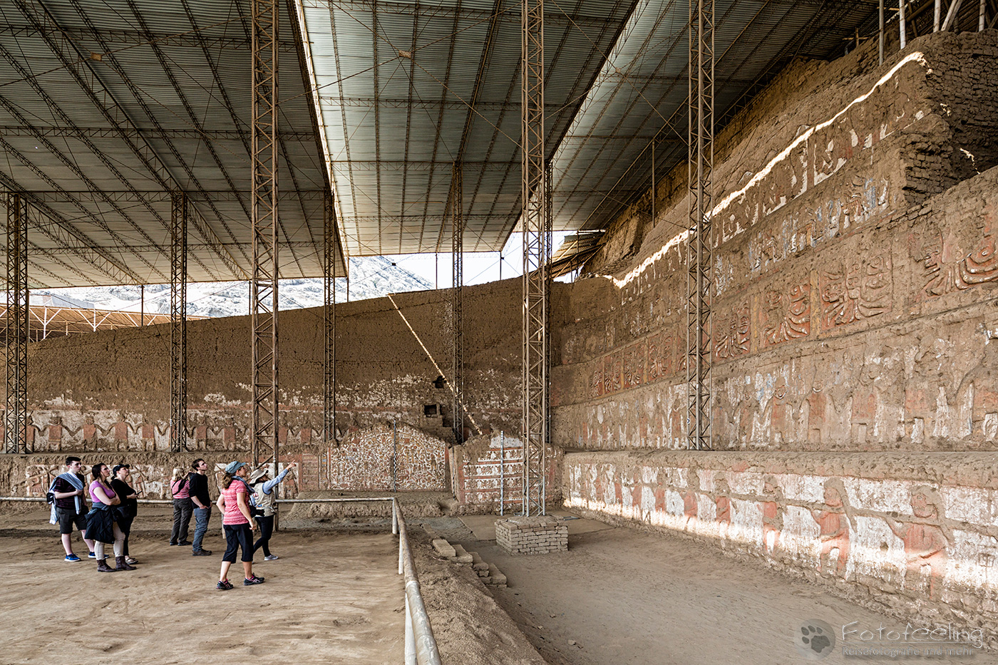 Wir kauften unsere Tickets und gelangten über eine weitere Kontrolle in die Anlage. Hier durften wir uns ohne Guide frei bewegen. Fasziniert folgten wir dem markierten Weg vorbei an dem komplett restaurierten Komplex aus Kammern, Tempeln, Kreuzgängen und Wohneinheiten. Wir bestaunten die für die Chimú-Kultur typischen Friese mit zahlreichen Ornamenten und Abbildungen des Meeres. Da auf der Eintrittskarte noch andere Tempel inbegriffen waren, machten wir uns nach der Besichtigung auf den Weg, um sie anzuschauen, aber leider hatte keiner der Ruinen geöffnet.